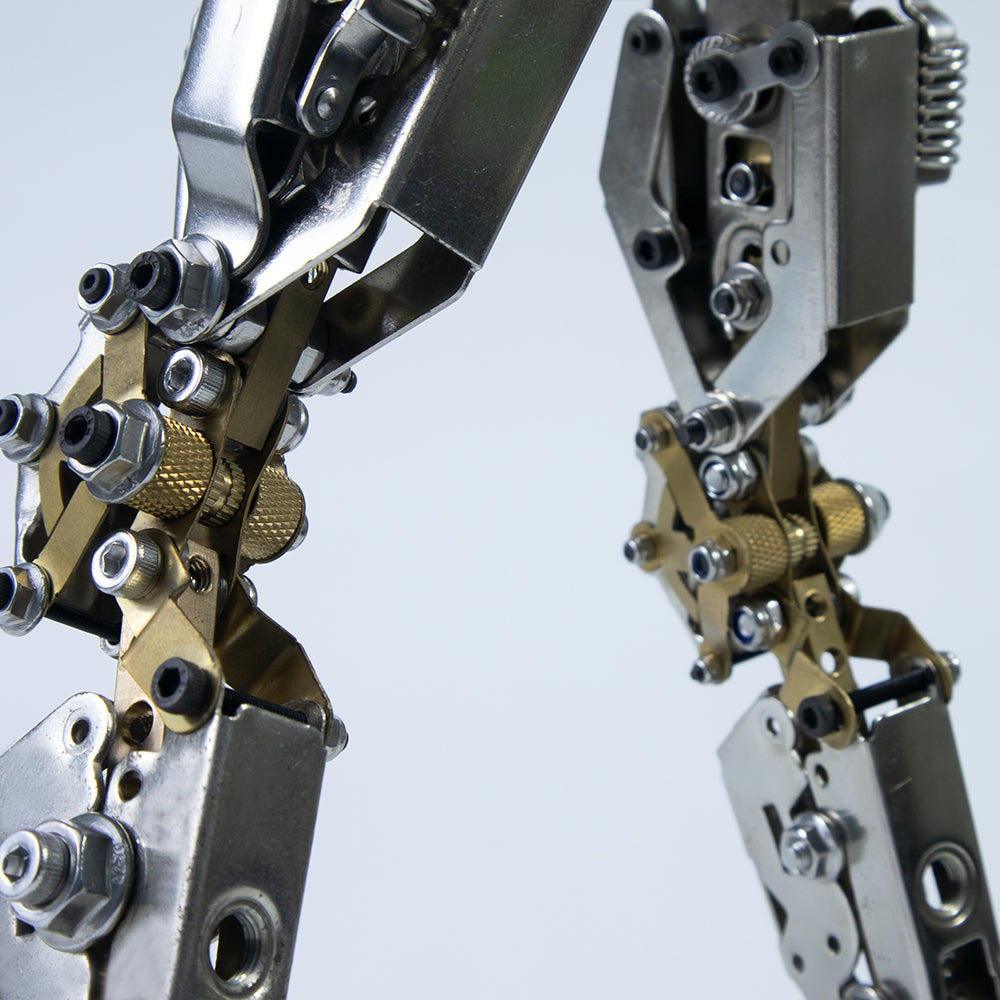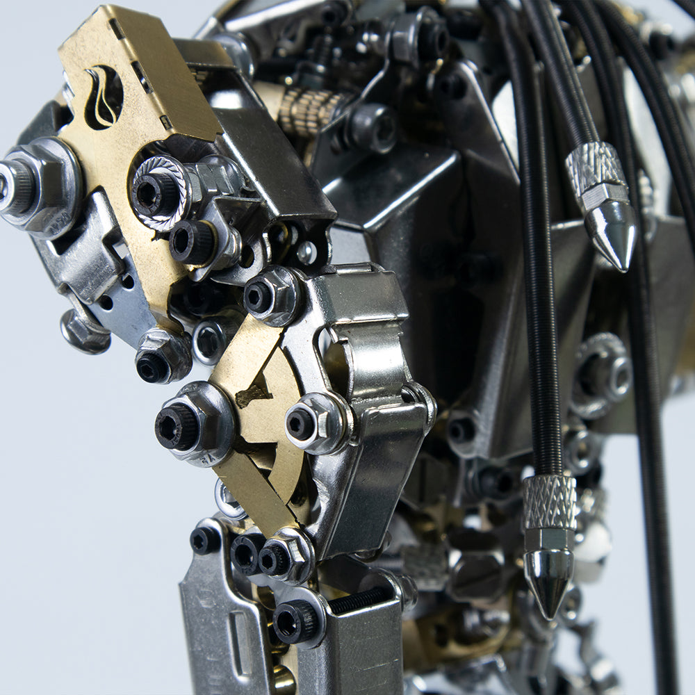 Legs and Feet: The lower limbs are constructed with multiple articulation points, allowing for advanced maneuverability. The feet are designed with wide pads and grip details, indicating stability and adaptability to various surfaces.