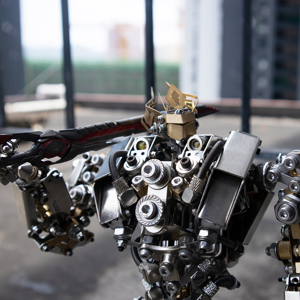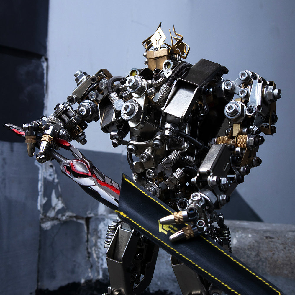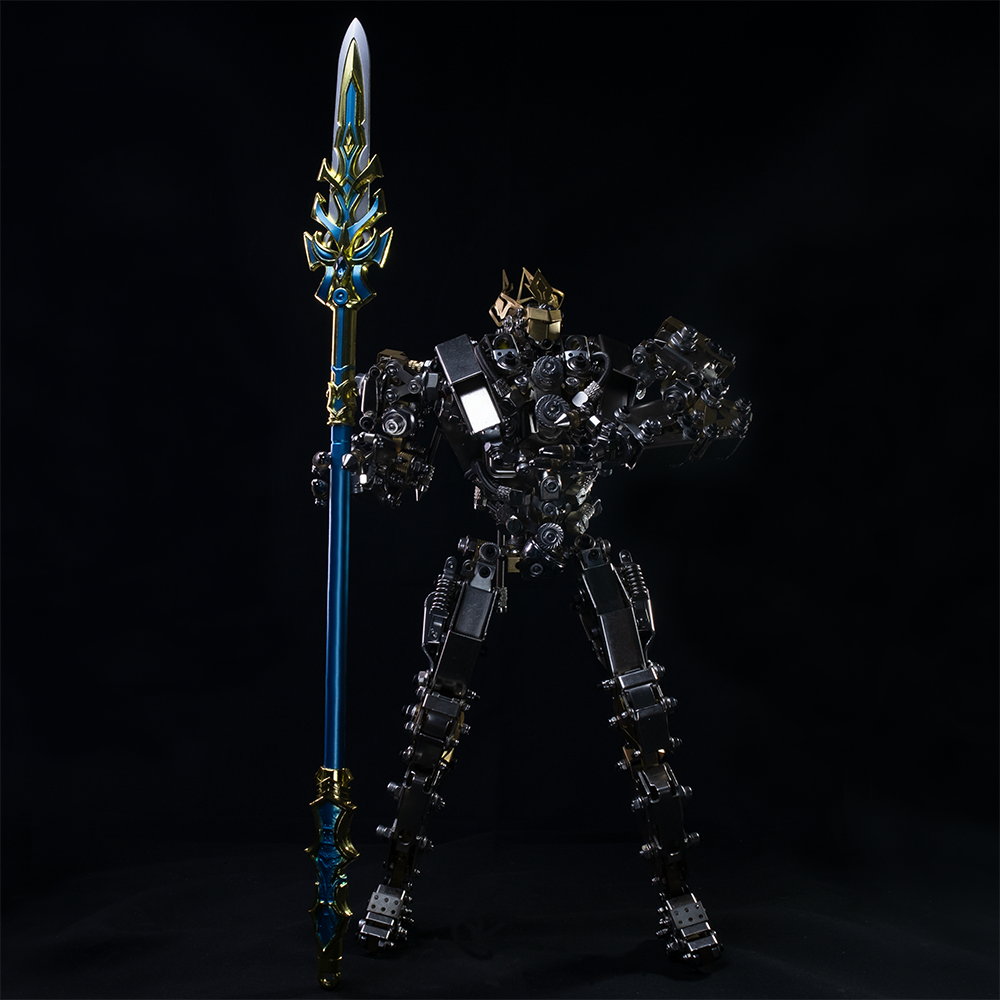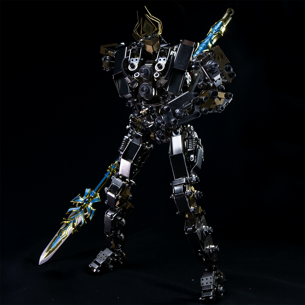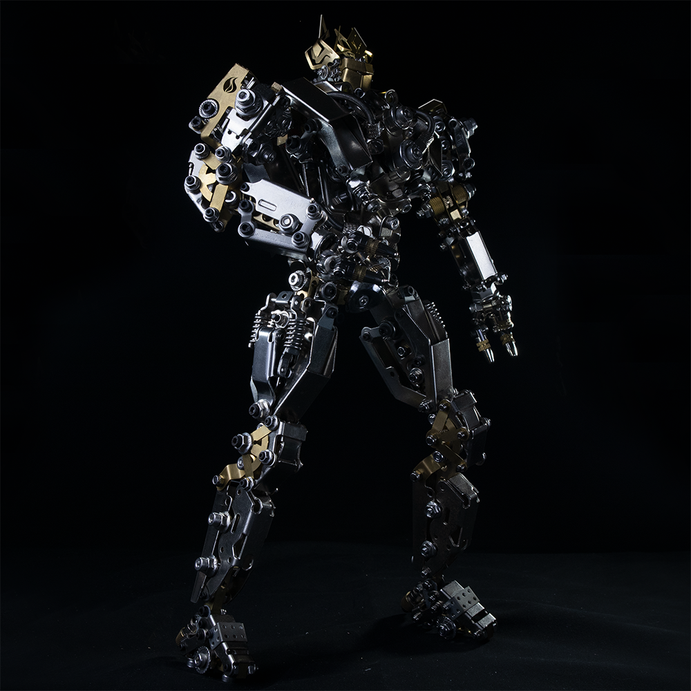 Construction: Made from premium metals with a focus on articulation and strength. The main body and limbs have a matte black finish with polished gold and silver mechanical details, providing a contrast that highlights its intricate design.