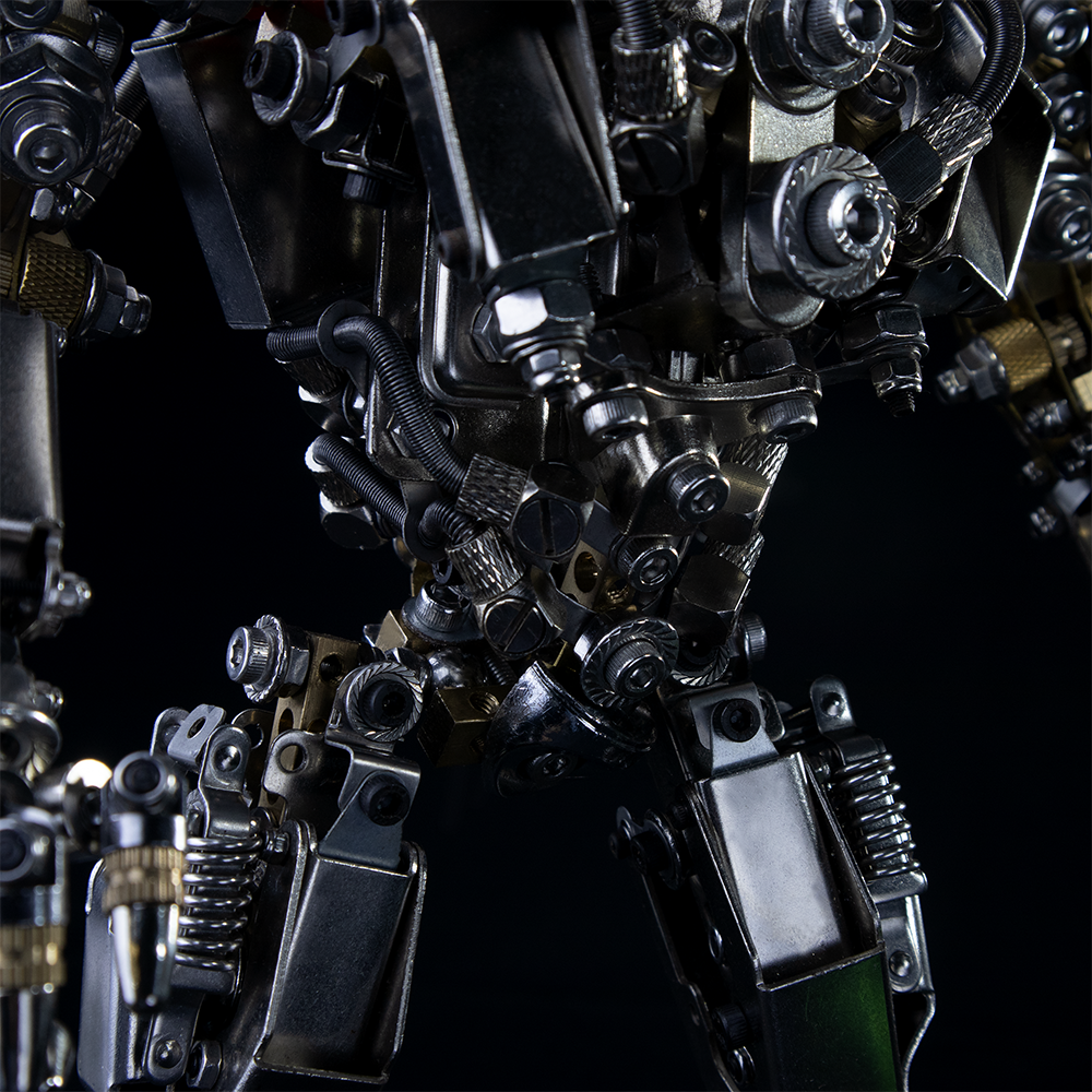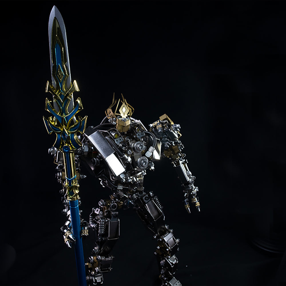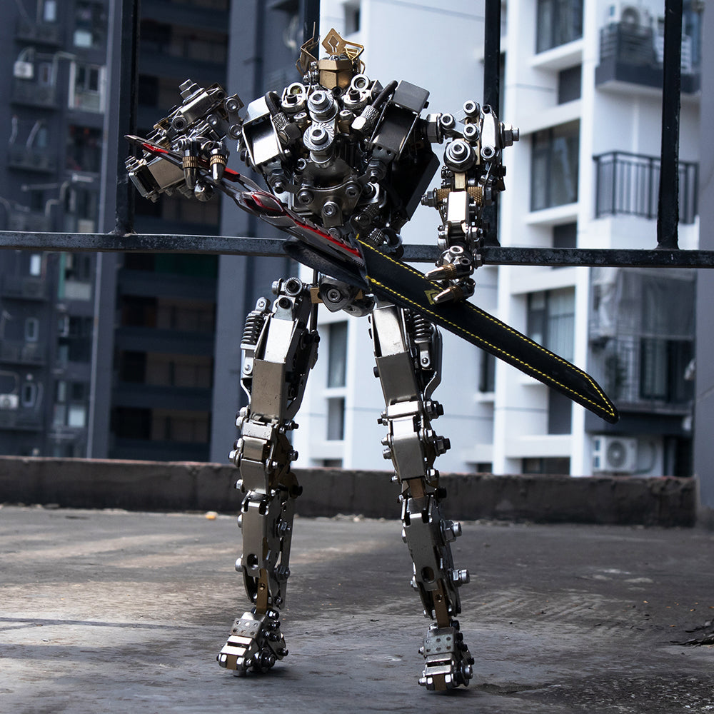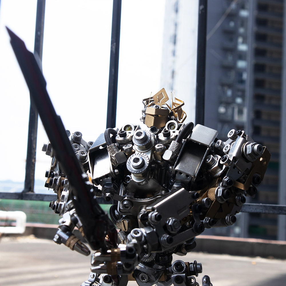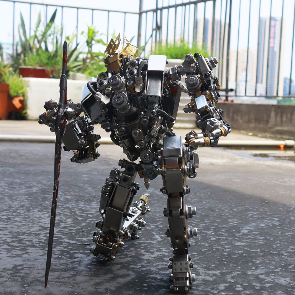 Construction: Made from premium metals with a focus on articulation and strength. The main body and limbs have a matte black finish with polished gold and silver mechanical details, providing a contrast that highlights its intricate design.