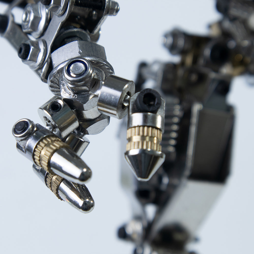 Armament: Both arms are equipped with complex joint systems and detailed hands capable of fine motor skills. The robot's right hand possesses what appears to be a multi-tool, while the left hand features pincers, suggesting a dual-function capability for both precision and strength.