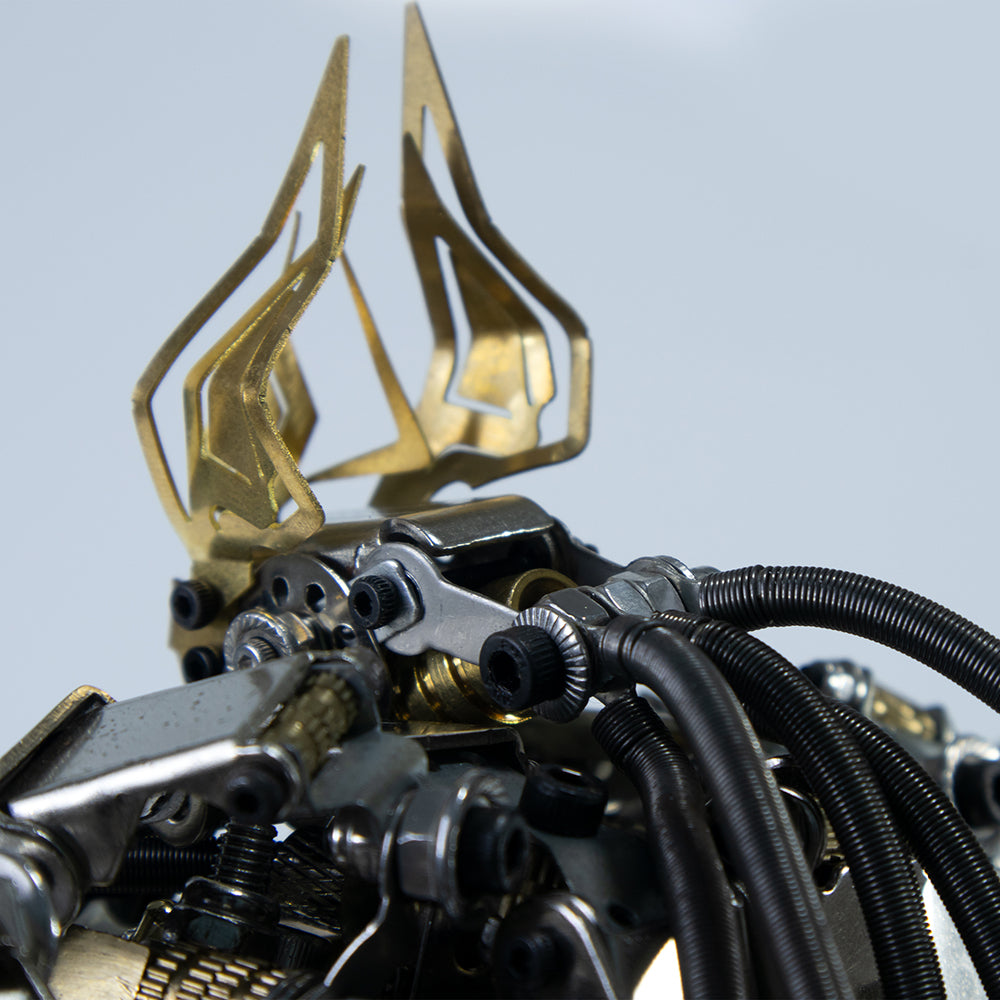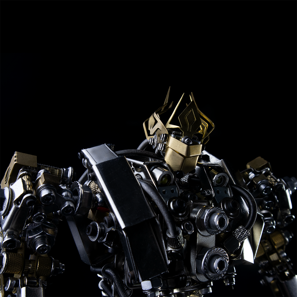 Mechanical Aesthetics: This robot presents an intimidating presence with its dark color scheme and gold accents, exuding a sense of power and high value. Its head is crowned with what seem to be sensor arrays or possibly communication devices, radiating out like a regal headpiece.