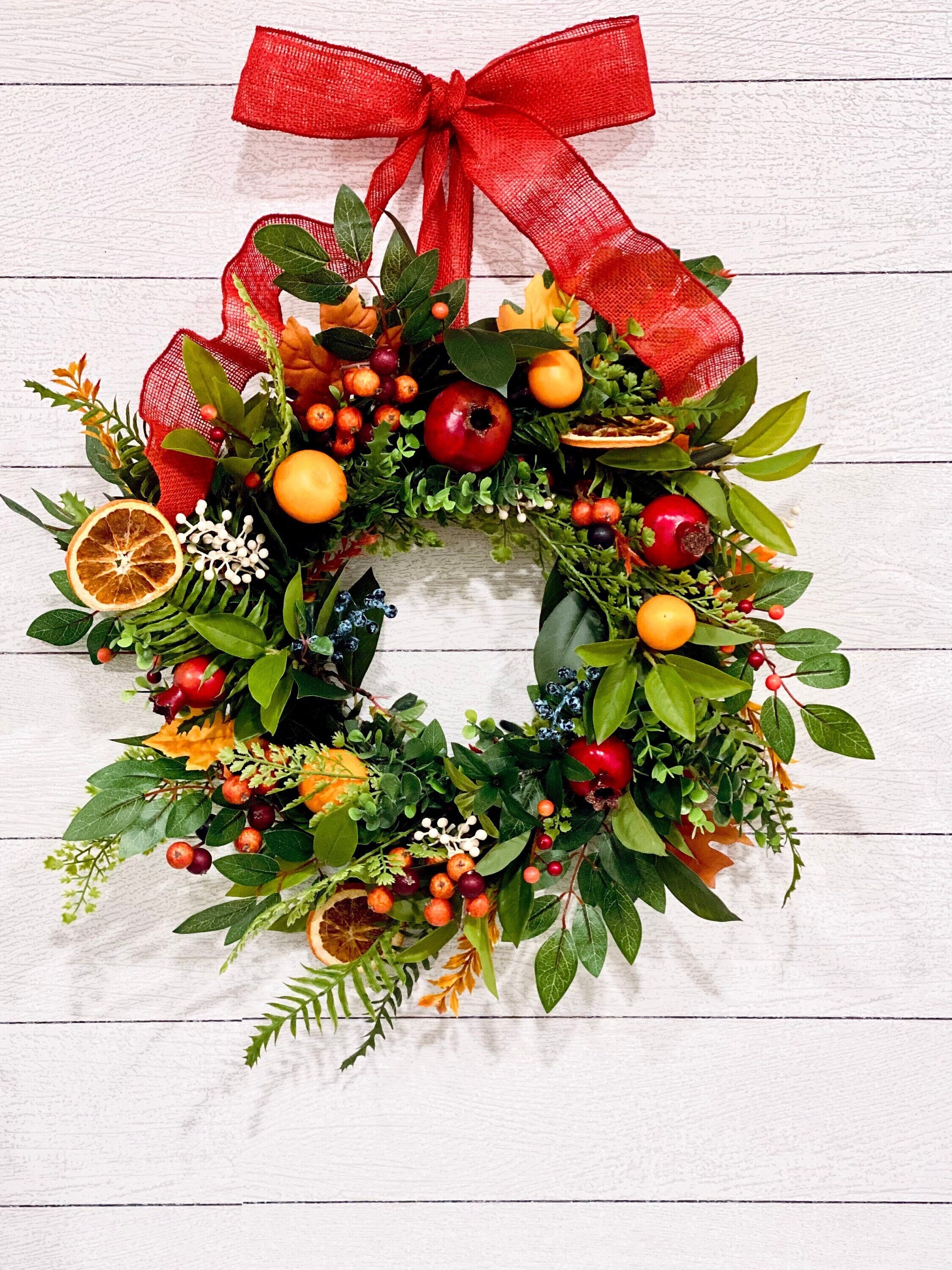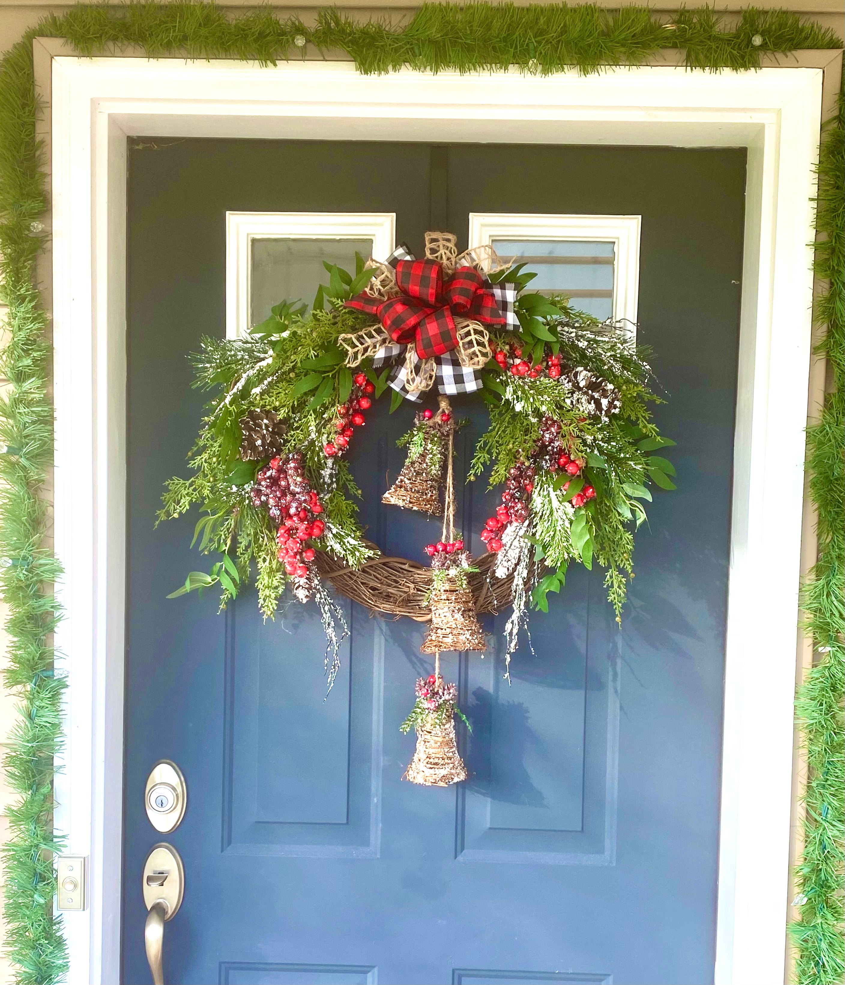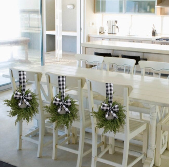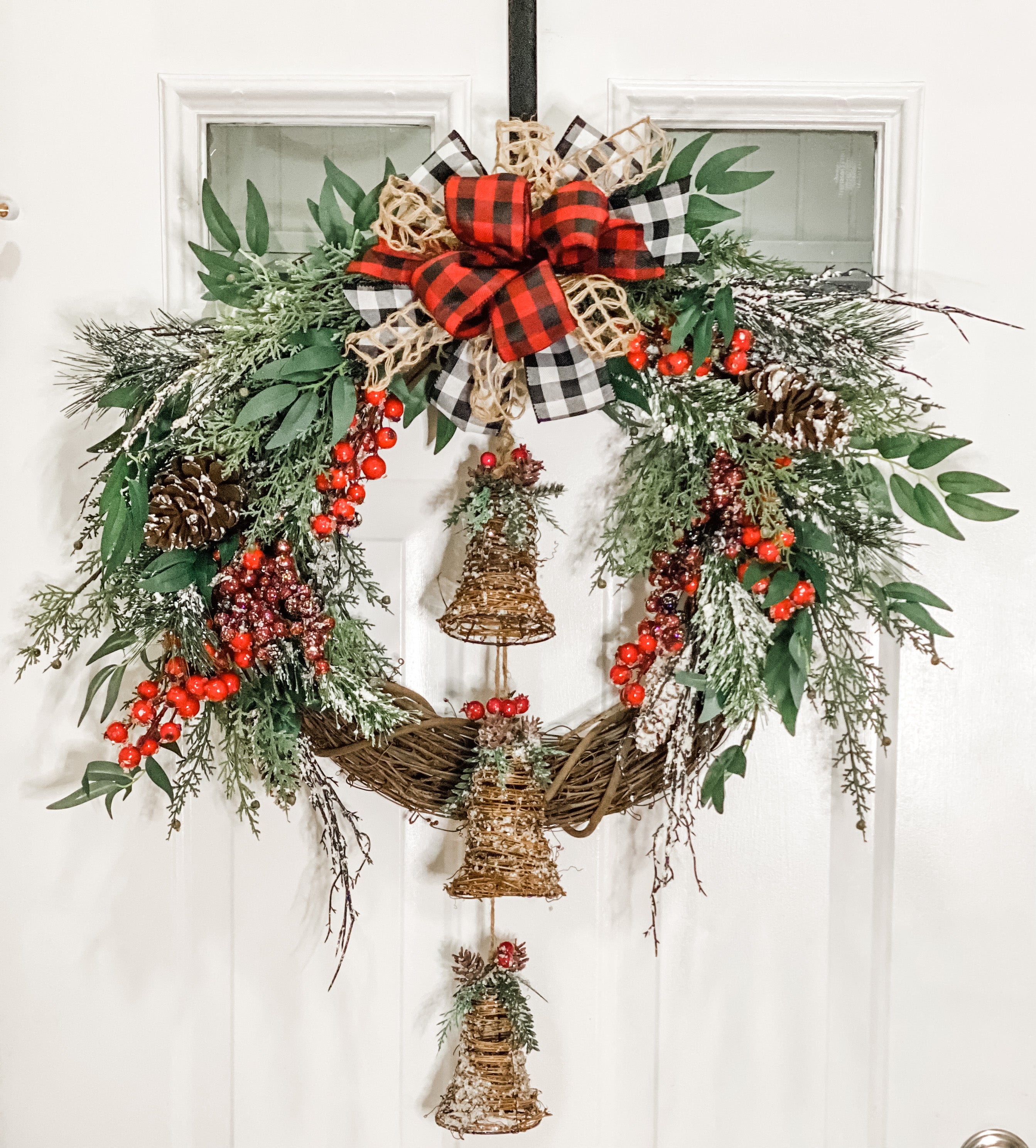 Christmas Mini Cabinet Wreaths with Ribbon, Mini Cedar Cabinet Wreaths, Cabinet Wreath with Buffalo Plaid Bow, Farmhouse Christmas Decor