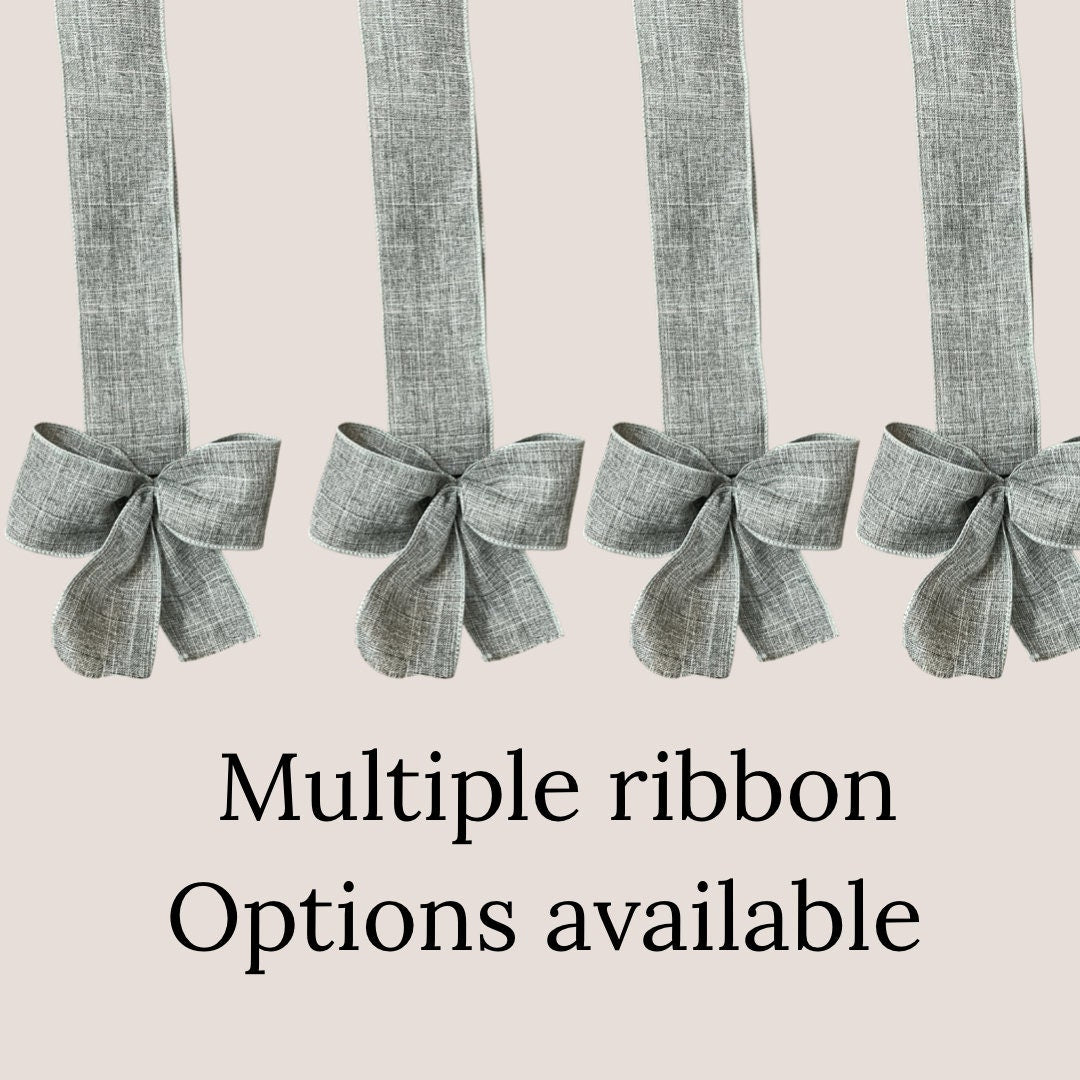These mini wreaths are approximately 11 inches in diameter. Each wreath comes with ribbon and bow. The will hang approximately 14” in length.