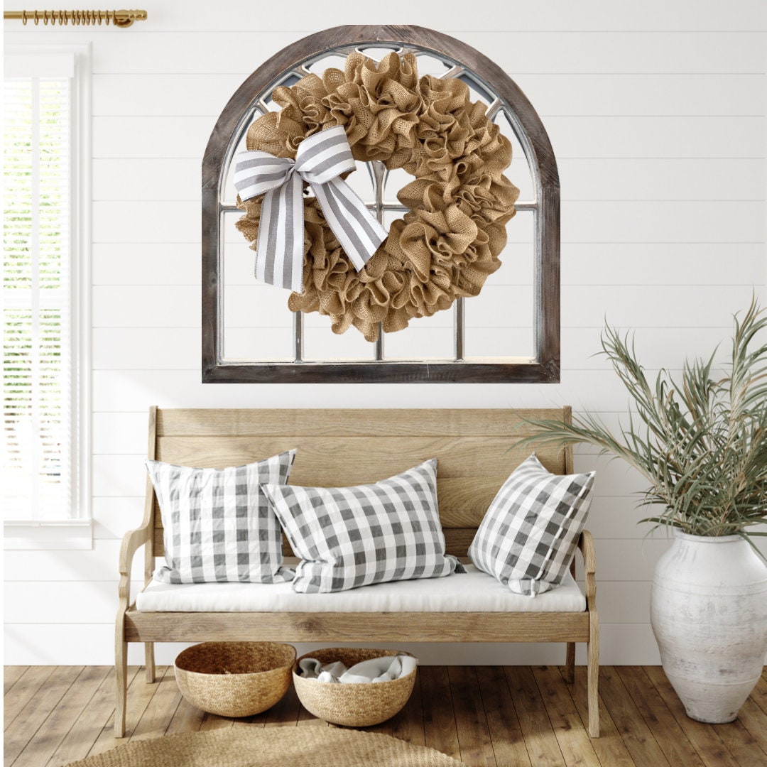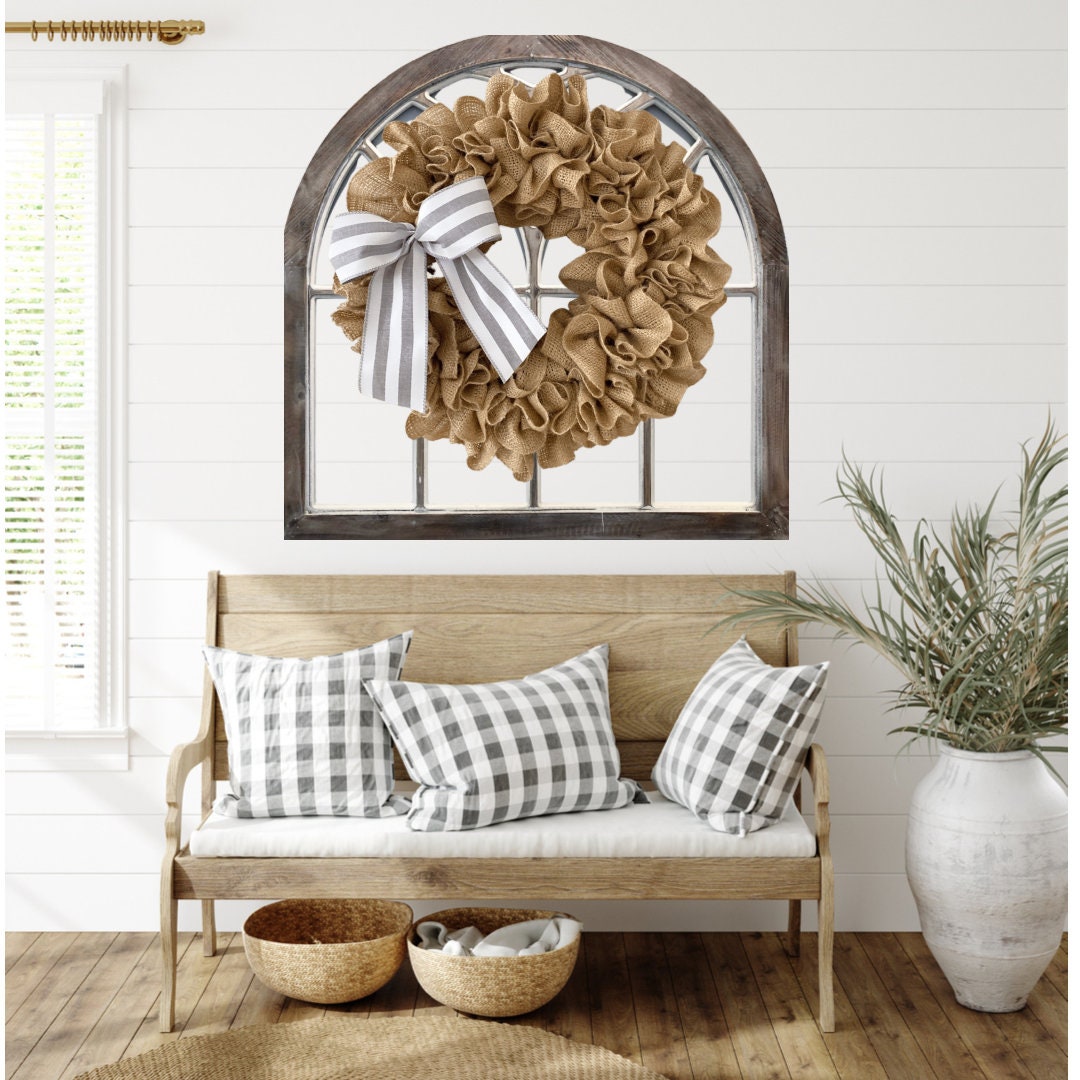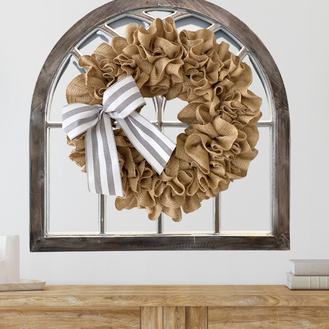 This Burlap wreath measures approximately 19” or 14” in diameter as a finished product. Use this white burlap wreath as a front door wreath, wall decor, or as an accessory to add additional style to wall decor such as window shutters, mirror, or picture frame.