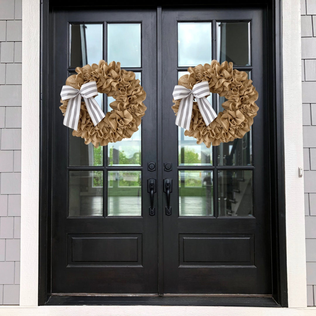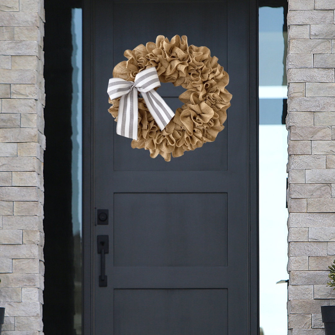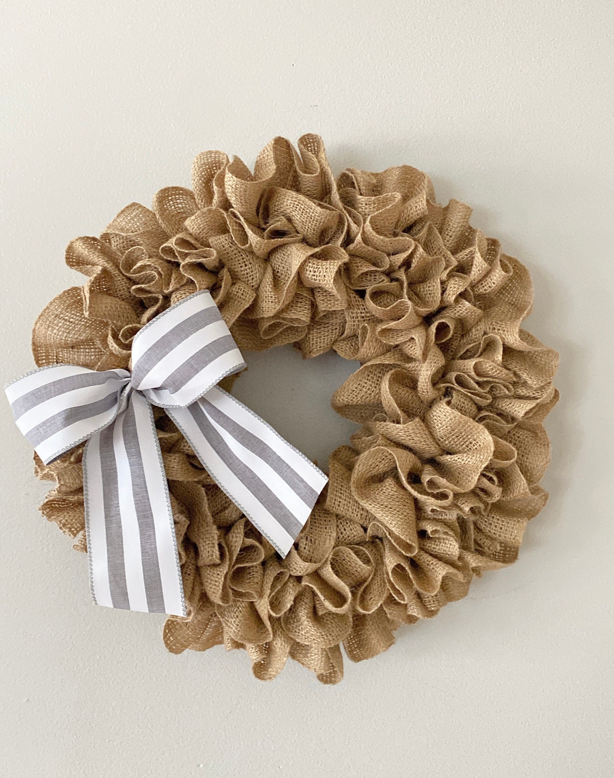 This Burlap wreath measures approximately 19” or 14” in diameter as a finished product. Use this white burlap wreath as a front door wreath, wall decor, or as an accessory to add additional style to wall decor such as window shutters, mirror, or picture frame.