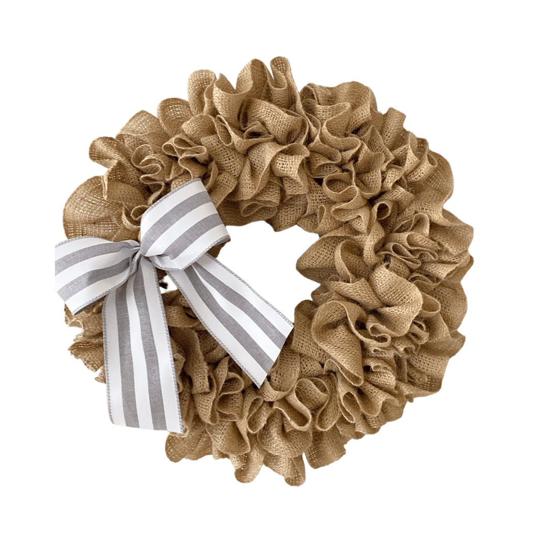 This wreath is made with quality ivory colored burlap on a 14” wreath frame.