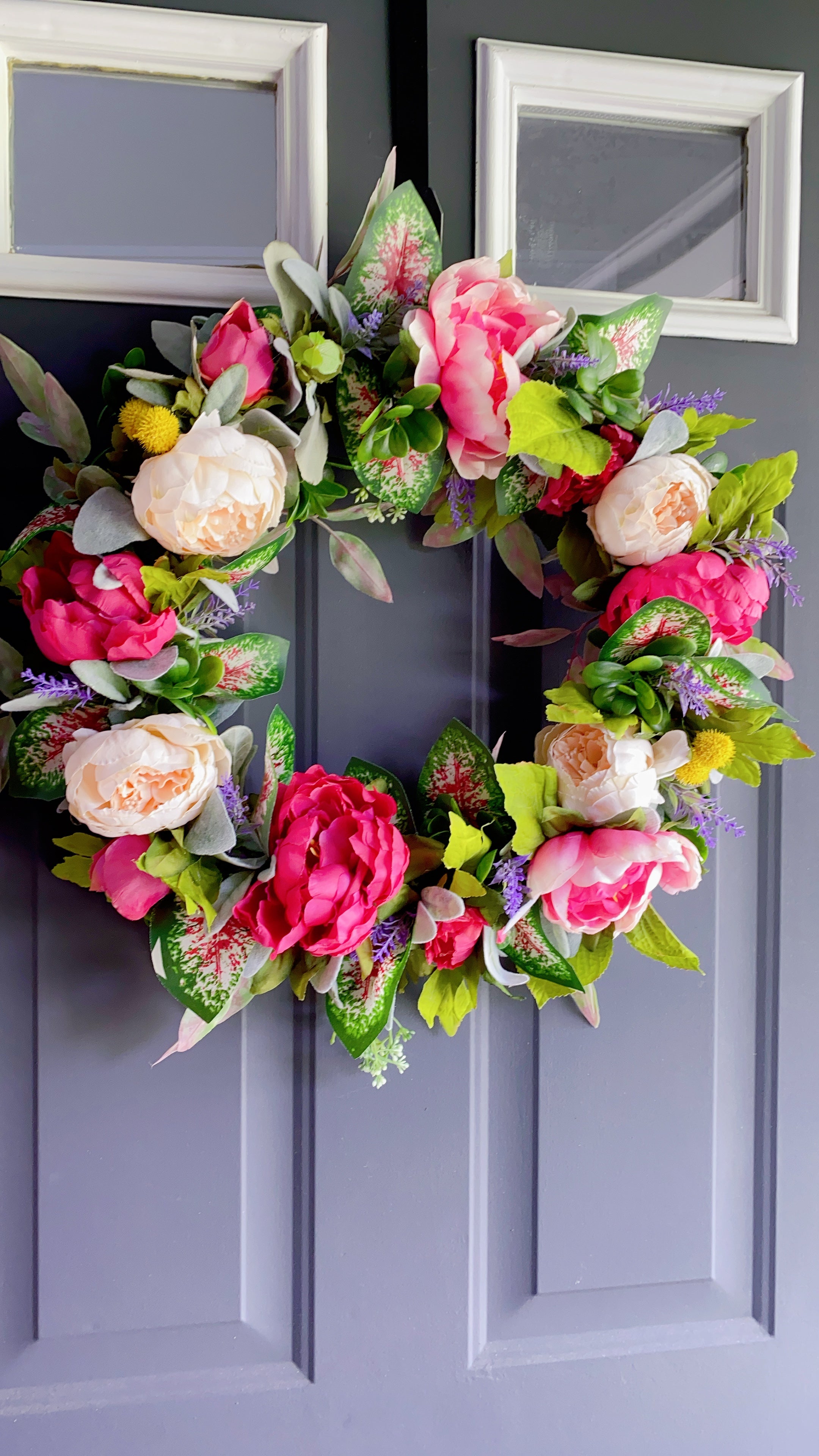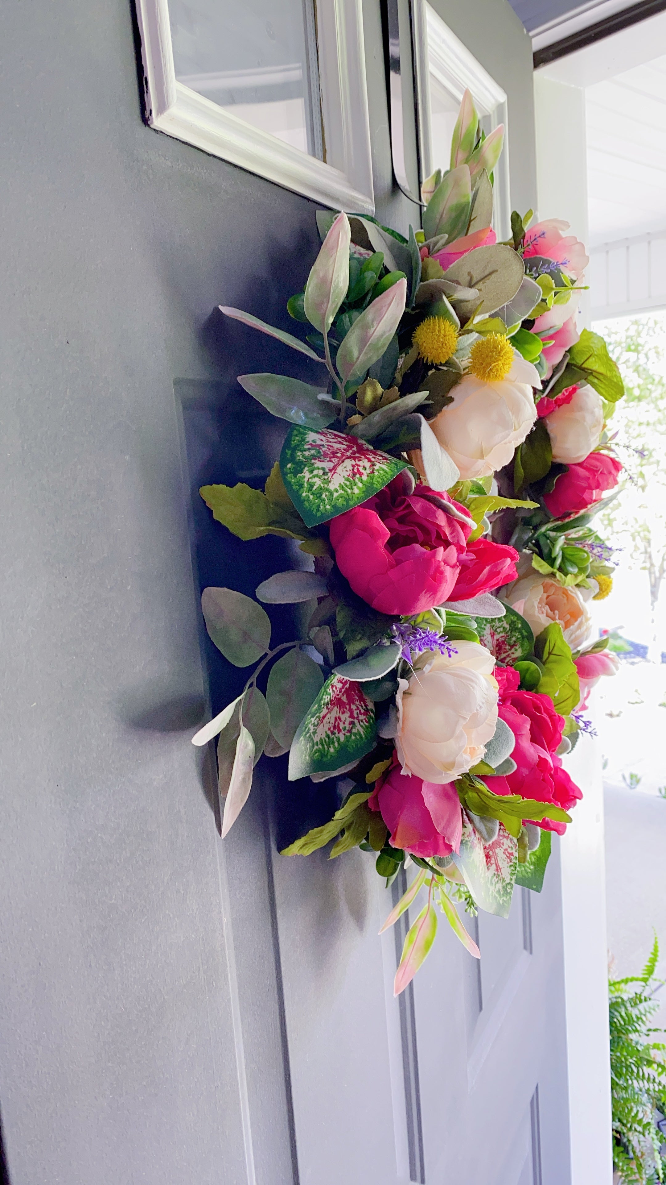 This Summer Peony wreath is a great way to welcome Spring and summer. It will add a pop of color to your front door decor or wall decor. This rustic wreath also makes a beautiful and lasting Mother’s Day Gift or Housewarming gift.