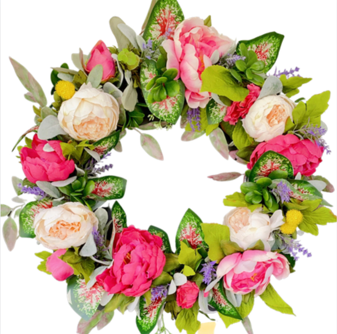 This peony wreath is created with bushels of faux lambs ear, faux succulents, faux lavender, and peonies. This wreath measures approximately 20” in diameter measuring from the two widest points of the wreath.