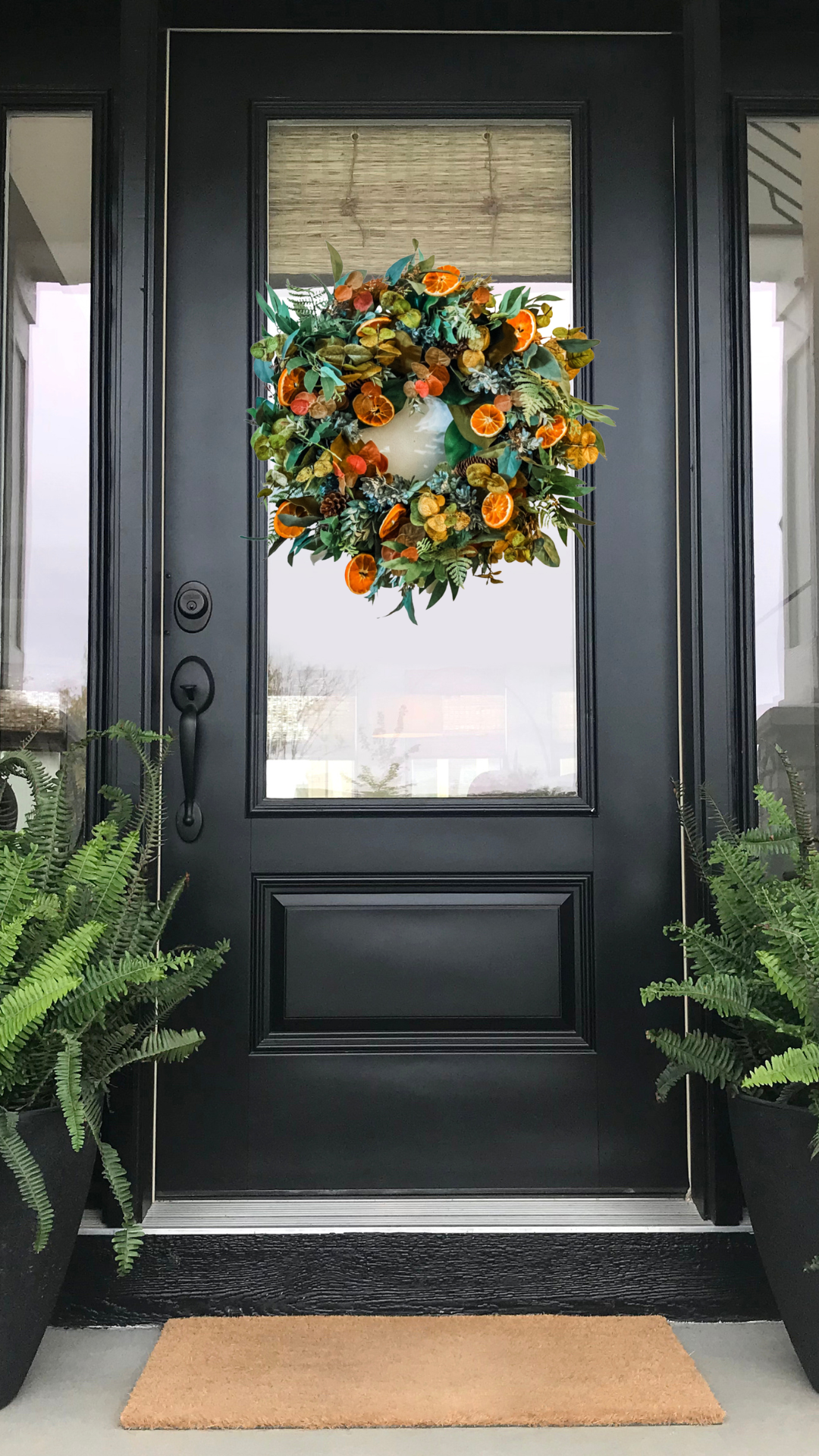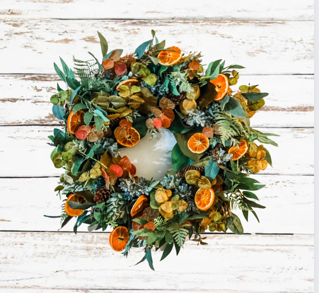 This large fall wreath is handcrafted with dried oranges, artificial crimson eucalyptus, pinecones, autumn fern, and green to yellow eucalyptus. This wreath is inspired by the beauty in fall and the changes it brings.