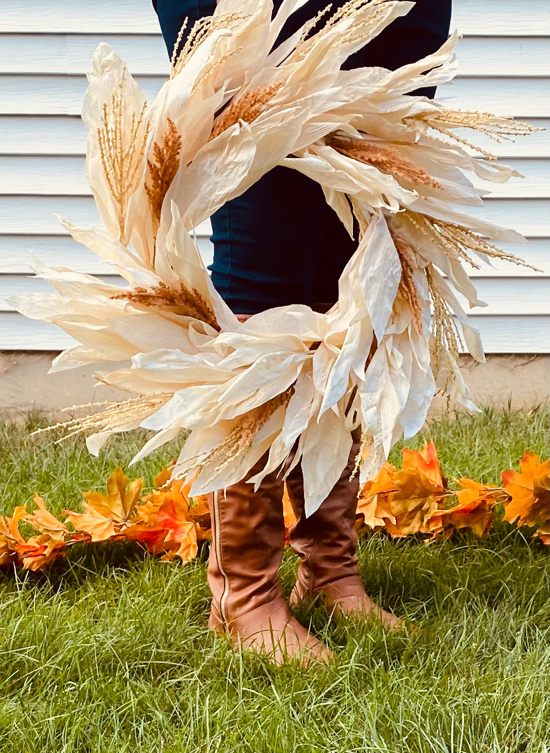 This larger neutral wreath is crated from dried corn husk and artificial auburn pampas.  This wreath is particularly well suited for modern farmhouses and other bohemian or rustic style homes to make a statement on your front door this fall season.