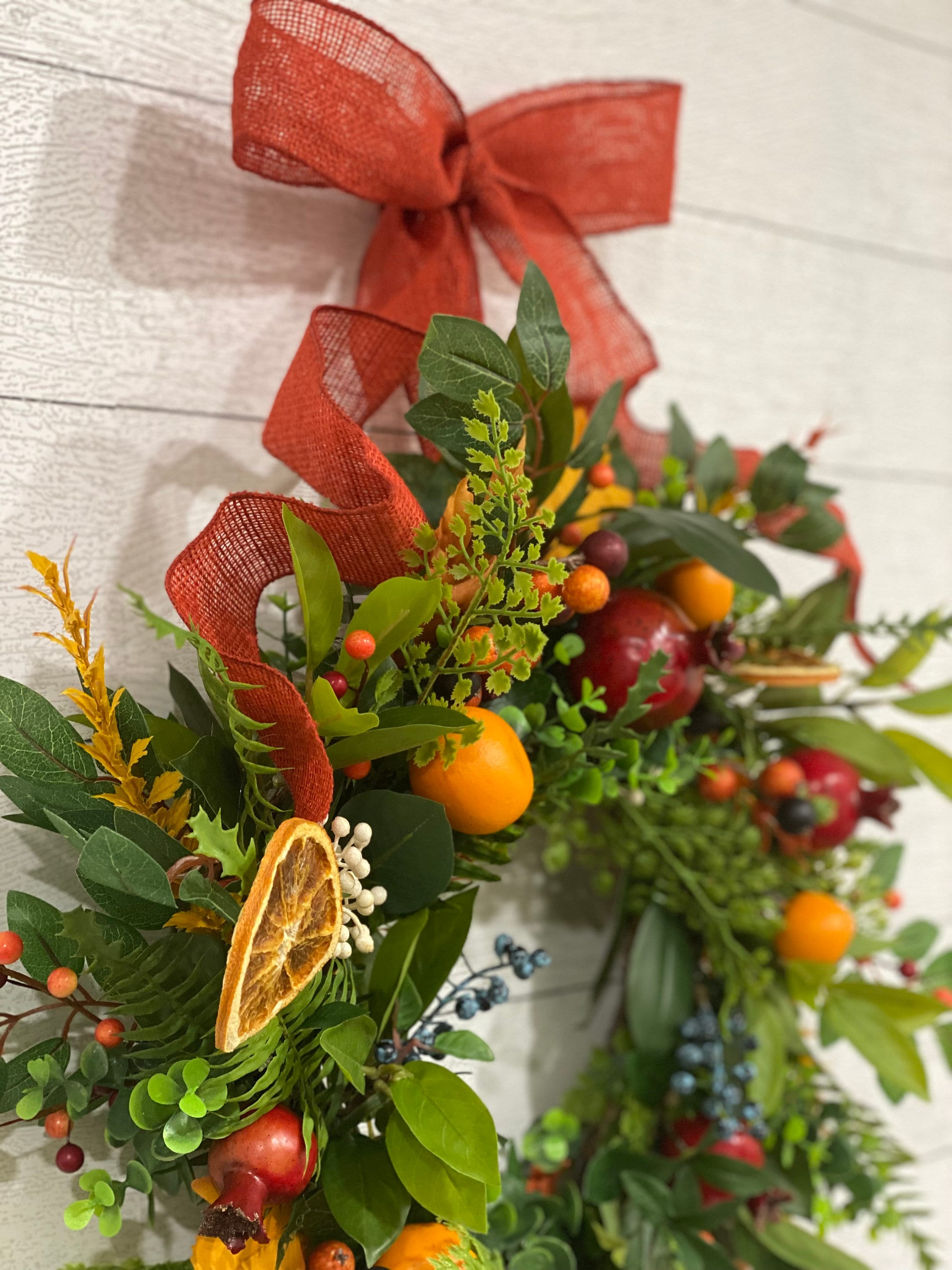 Introducing our exquisite handmade Williamsburg Style Autumn Wreath, meticulously crafted to bring a touch of elegance and charm to your home. This wreath 21' in diameter showcases an array of lifelike artificial pomegranates, persimmons, blueberries, and fall berries, each crafted with remarkable attention to detail, providing a lifelike appearance that will impress your guests.