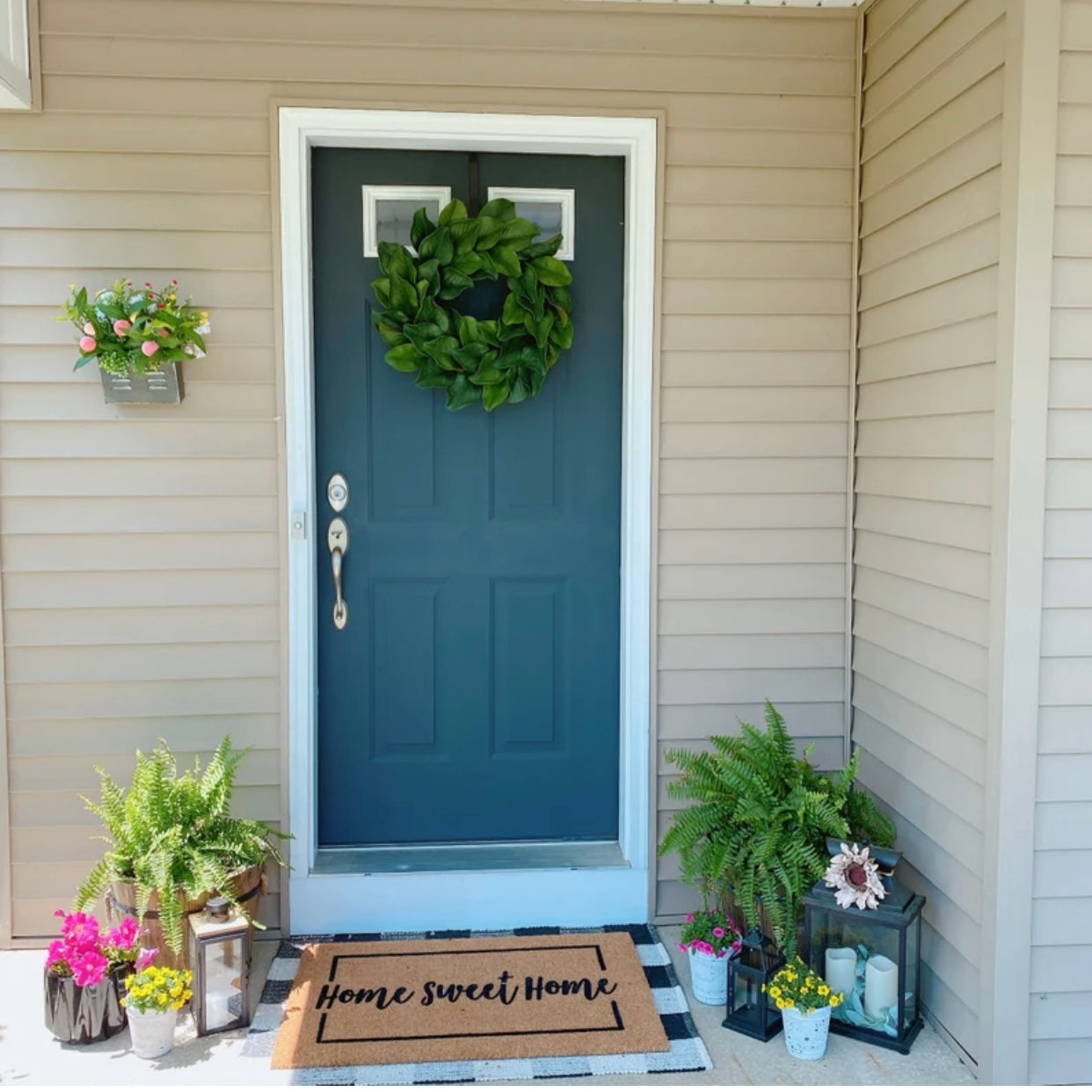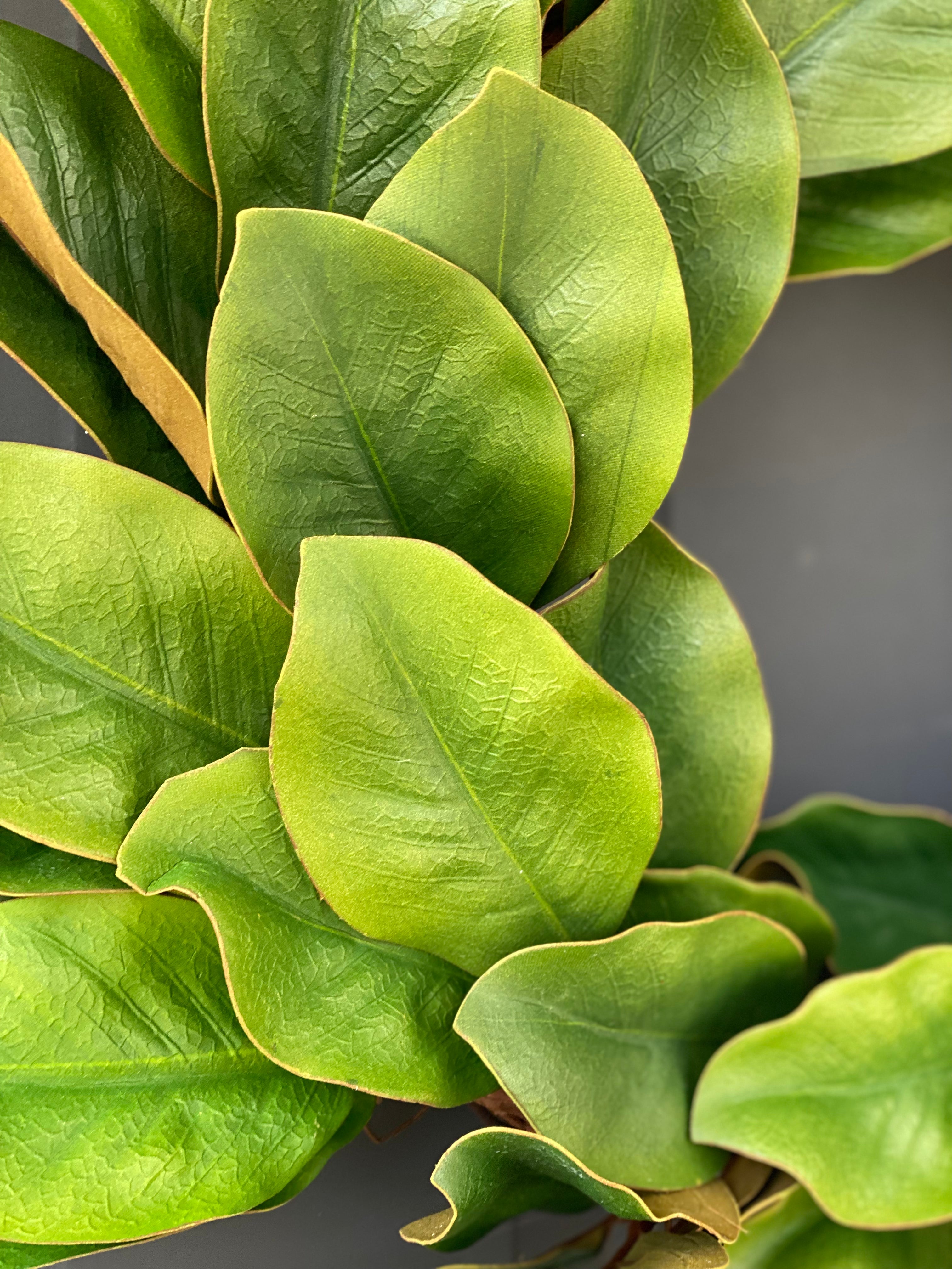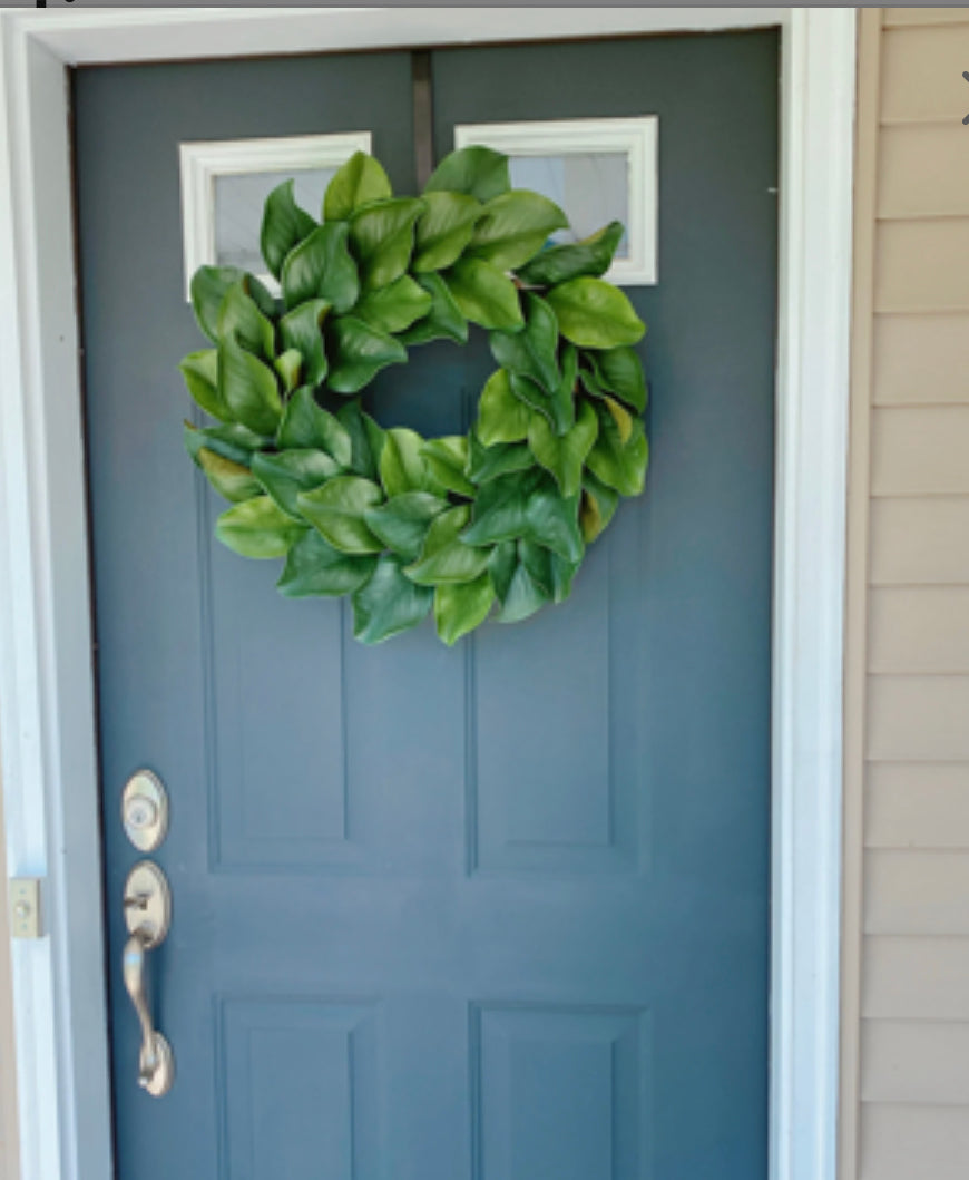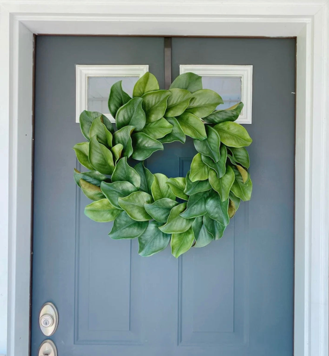 This all season Magnolia wreath for your front door will bring a timeless look to your home by creating curb appeal and an inviting atmosphere. This Magnolia Wreath also functions as modern farmhouse wall decor with its deep rich green faux magnolia leaves.
