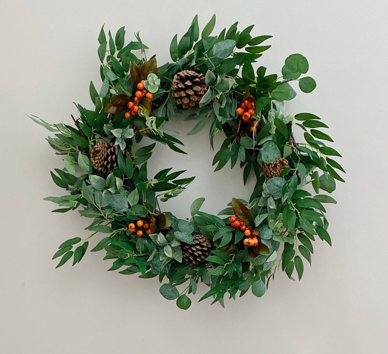 This wreath is made from faux willow leaves, lambs ear, eucalyptus greenery, vibrant faux orange berries, pinecones on a grapevine wreath form.