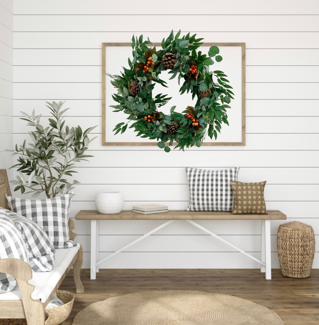 This Fall Farmhouse Wreath will bring style texture and greenery to your home. This rustic fall berry wreath functions as a front door wreath or as indoor wall decor to add greenery and texture to any room’s wall decor . Welcome family, friends, and other guest home with this simple farmhouse wreath.