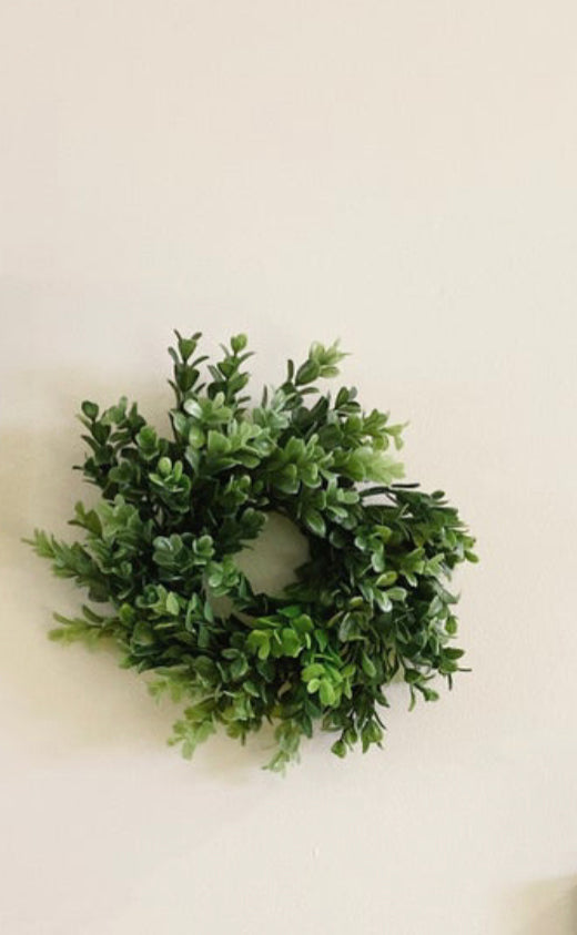 This small farmhouse wreath for cabinets is made with faux boxwood greenery and a small grapevine wreath frame. These mini cabinet wreaths add a pop of Greenery to your farmhouse charm. Use these wreaths to add warmth to any kitchen, wall decor, or tablescape as a centerpiece To hold candles. These can also function as chair wreaths that can be used as wreaths for the back of a chair.