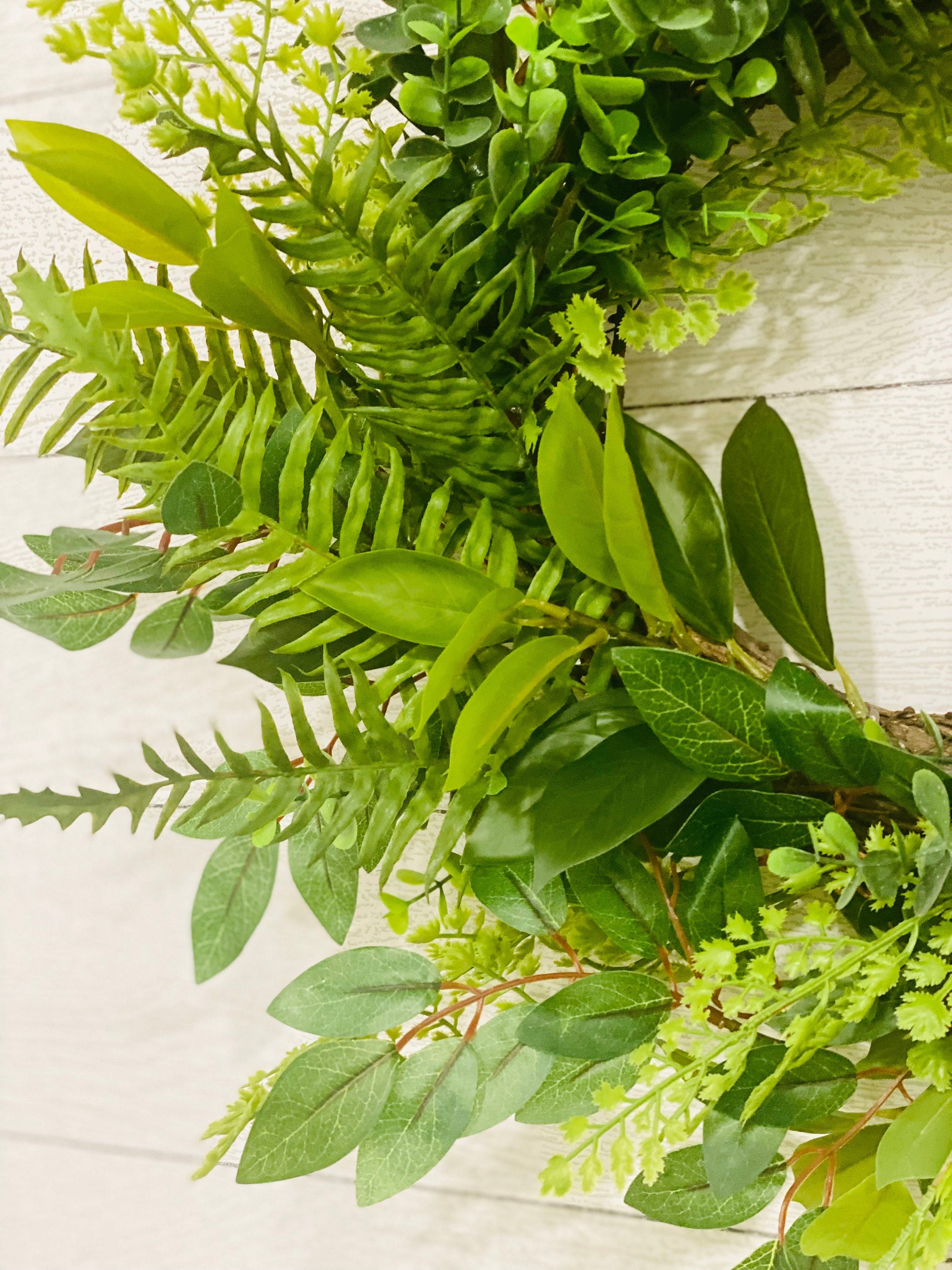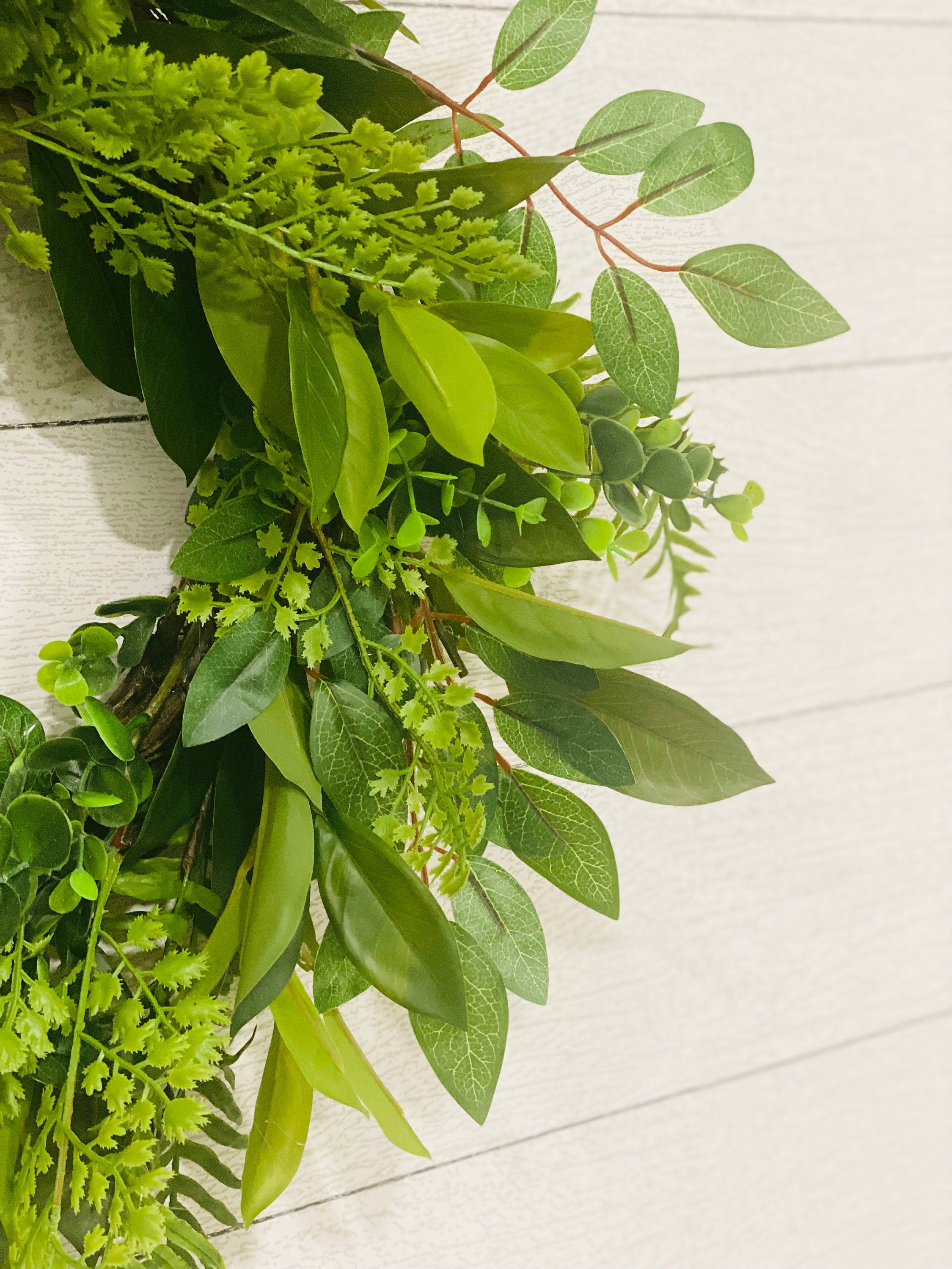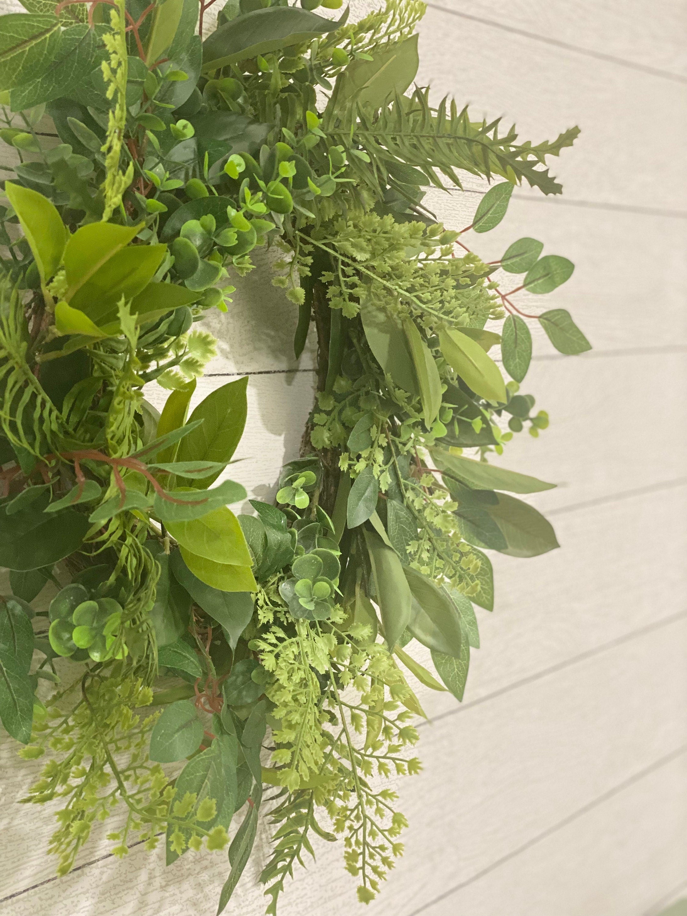 This artificial year round front door greenery wreath will add warmth, color, and texture to your home. Use this as a Summer front door Wreath or year round to welcome guest home.