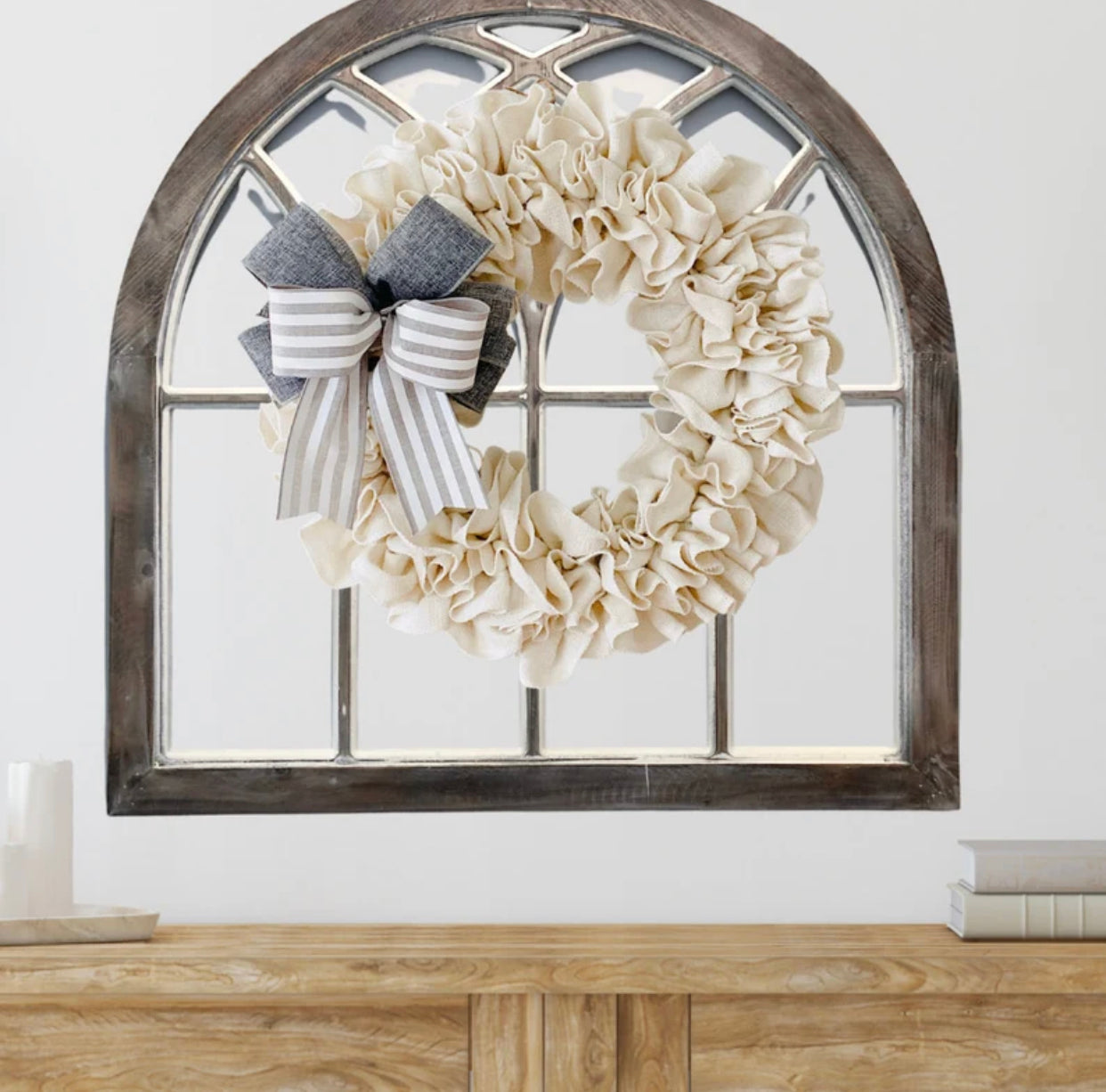 Rustic Neutral Brown Burlap Wreath with Grey Striped Bow