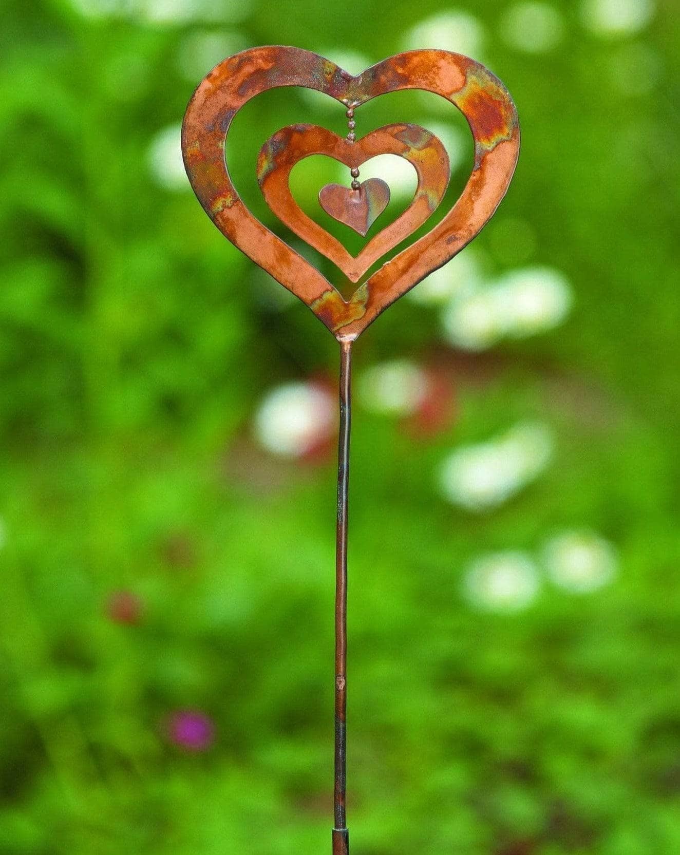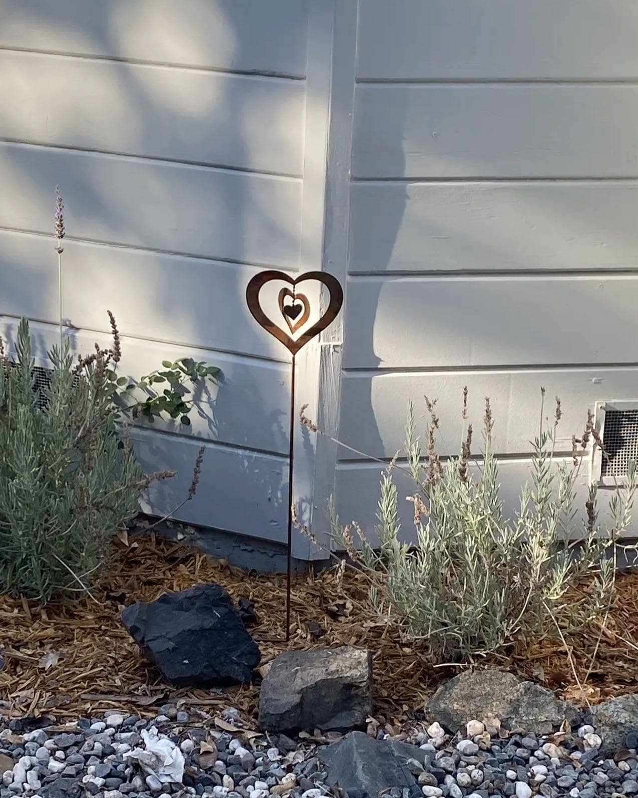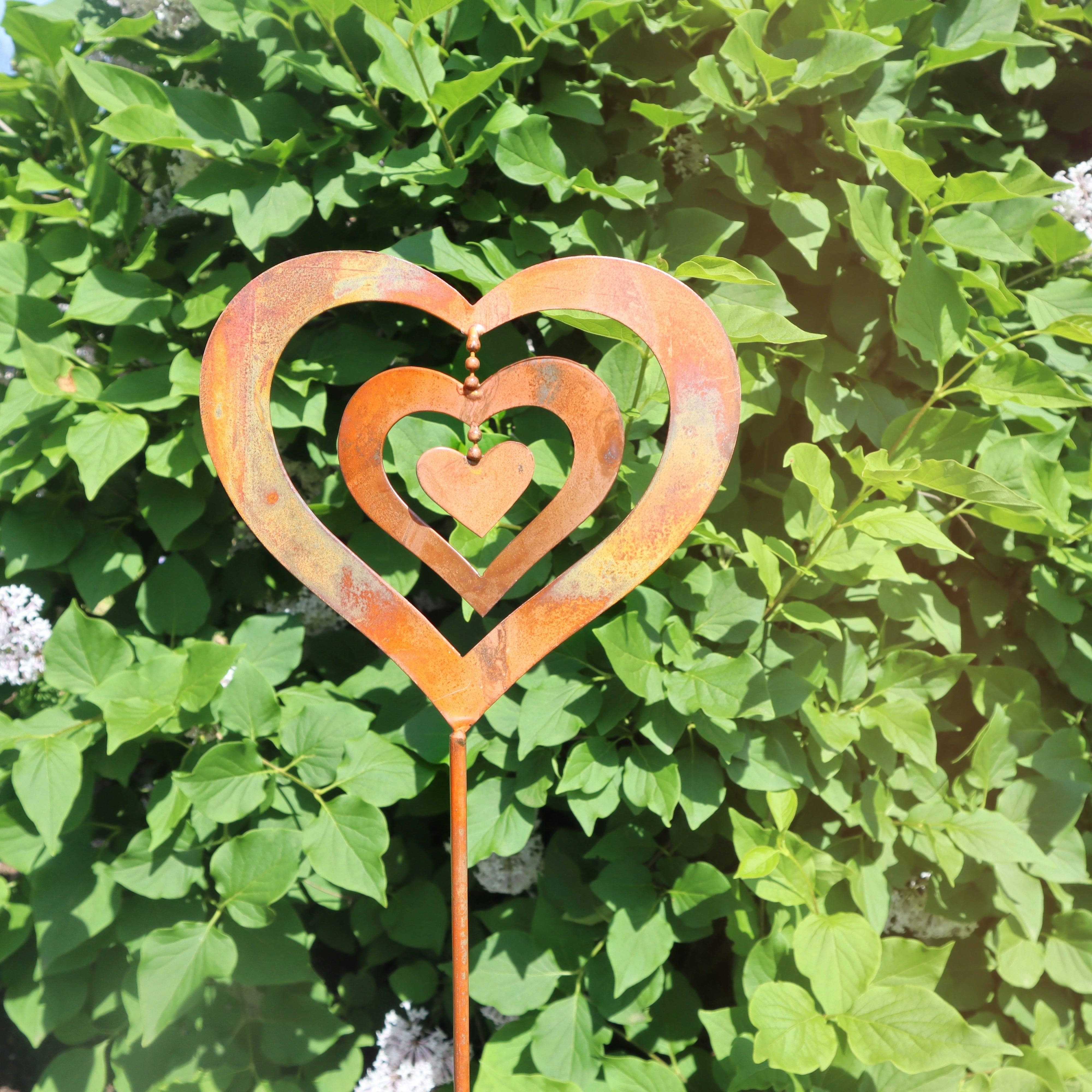 Add a touch of romance to your garden with this best-selling Triple Spinning Heart Garden Stake. This piece has a neutral, iridescent glow that really stands out in green, grassy or leafy areas. This stake spins in the breeze, too, making it even more interesting to onlookers. As always, this item in individually handcrafted and made with care.