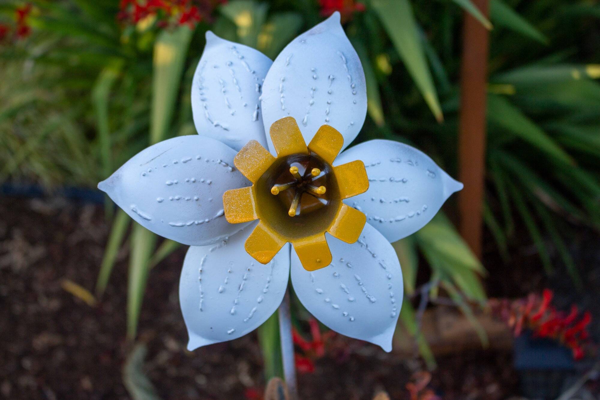 The Daffodil Stake is made of recycled steel and pre-treated to create our signature rusted texture and natural look. It also features distressed, hand-painted details to resemble the color of a live daffodil. It would be the perfect accent for a vegetable garden, flower bed, or simply anywhere in your backyard that could use a little extra love!
