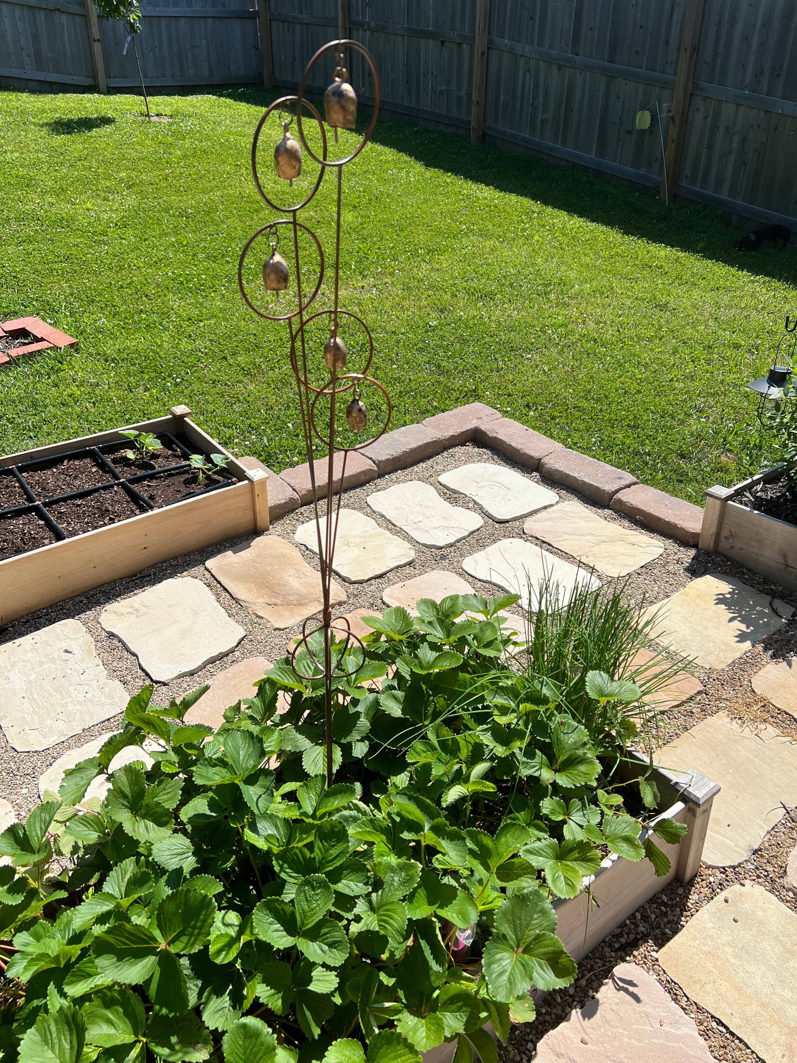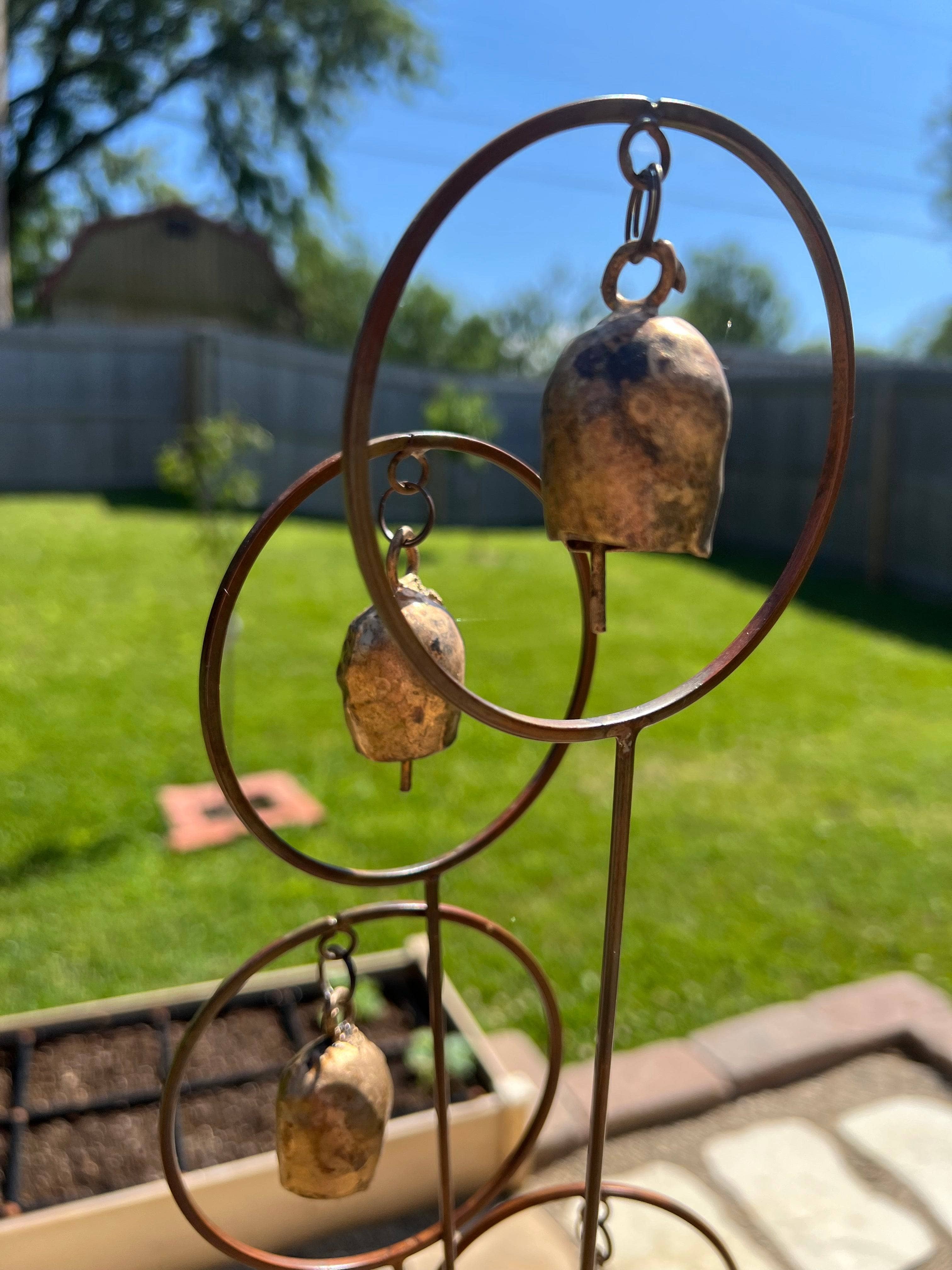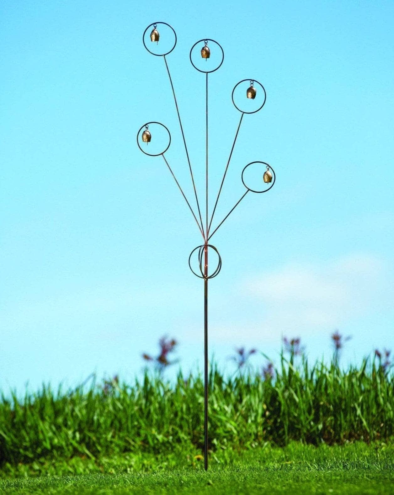 Plant elegance and let joy blossom. Our Flamed Bells Garden Stake pleases the eyes and ears alike, with a timeless circular motif and an array of five bells, which emit lovely sounds as breezes caress.
