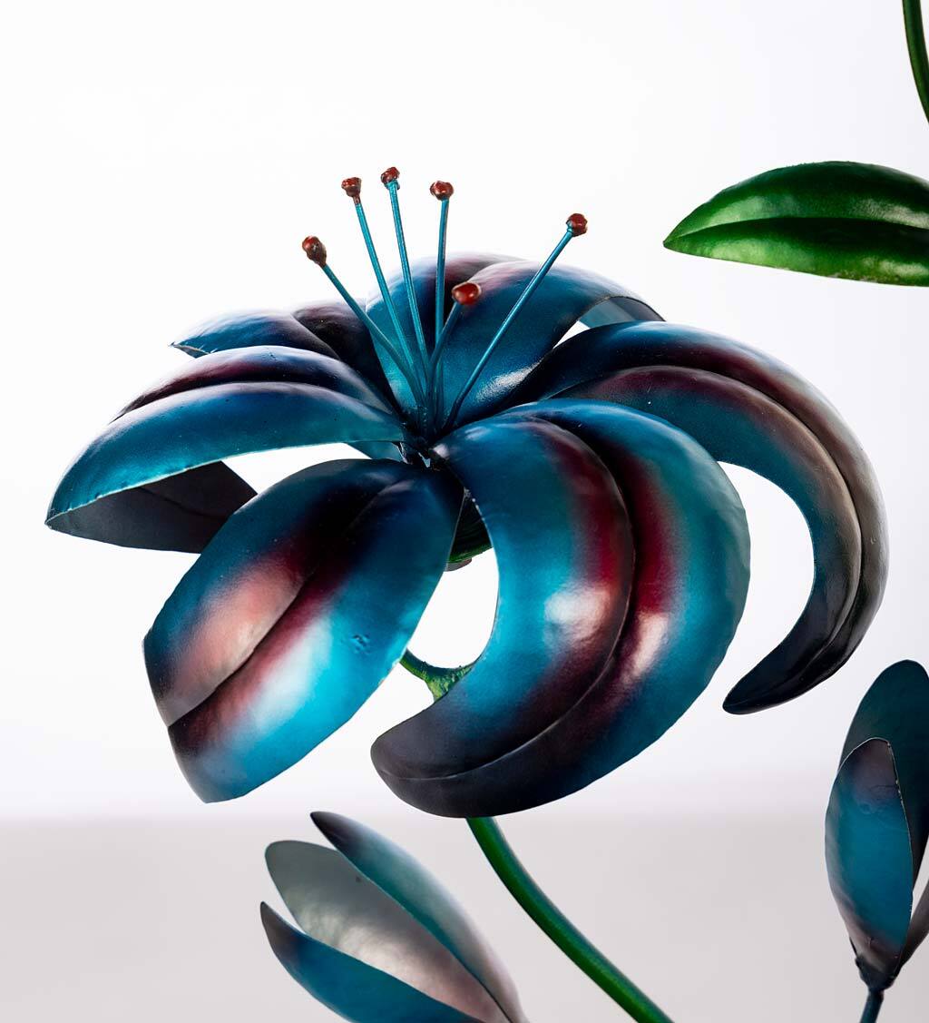 This Spinning Flower Garden Stake Trio features intertwined lily-shaped flowers that have been delicately handcrafted from reclaimed metal and painted in eye-catching colors. Each flower spins in the breeze for added intrigue. Includes a 5-inch stake that easily stakes anywhere.