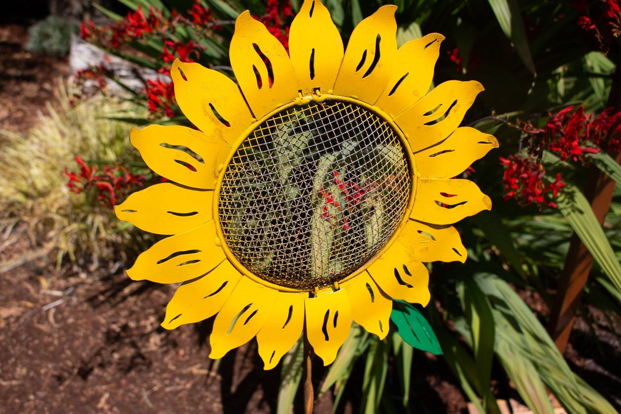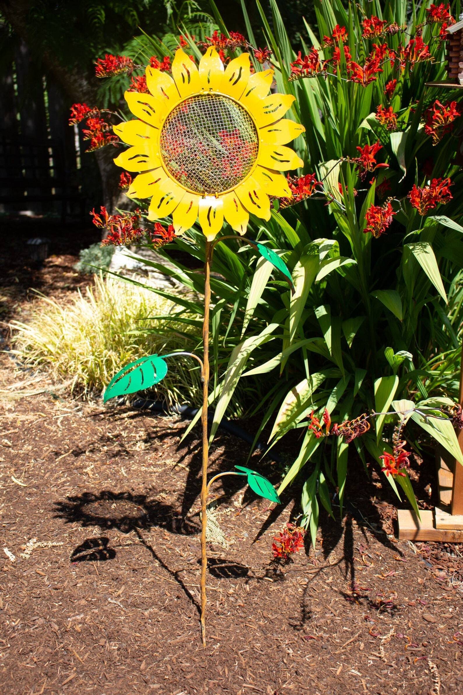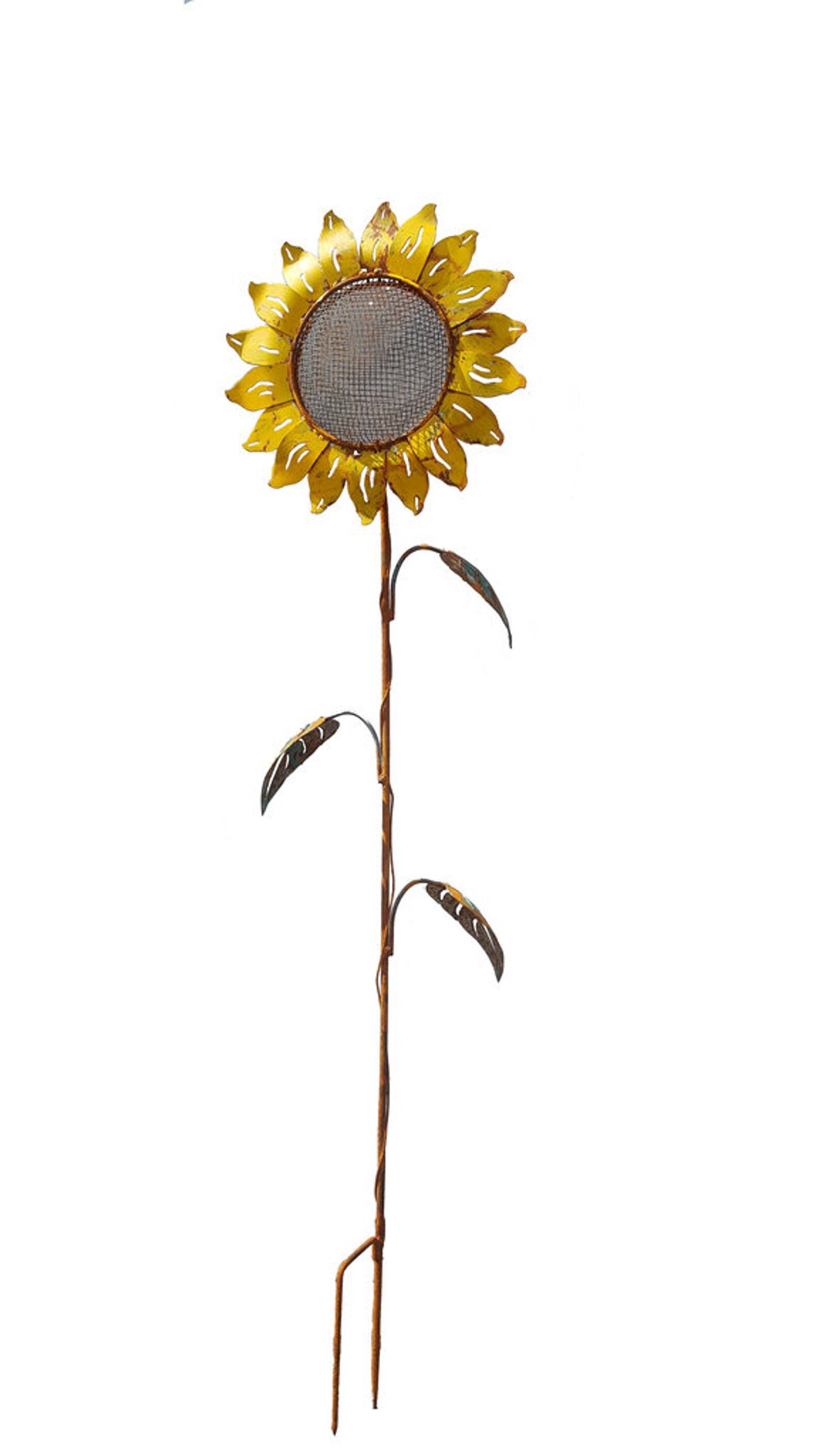 The Sunflower Bird Feeder Stake is a lovely piece of metal garden art designed to attract and feed birds in your yard. It features a beautiful sunflower silhouette design that adds a charming touch to your outdoor space. The stake is made of metal and has a rustic, rusty finish, giving it a vintage look.