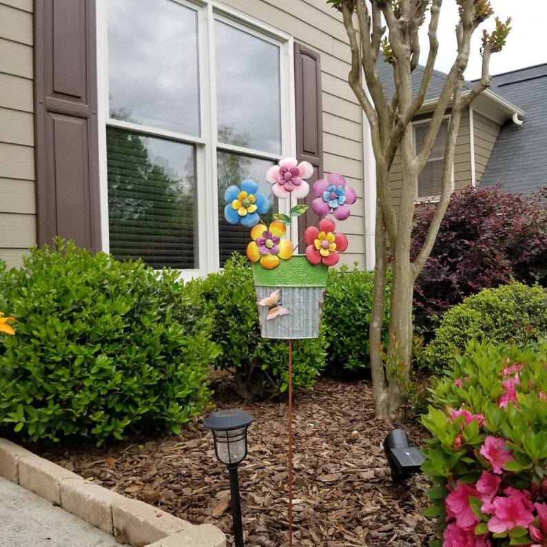 Flower Garden Stake Decorative Flower Yard Stake, Colorful Flower Pot Yard Art Decor Outdoor Garden Decoration for Patio Porch Pathway