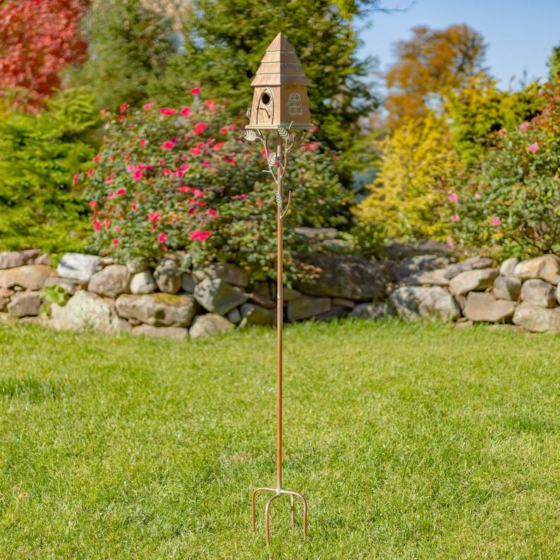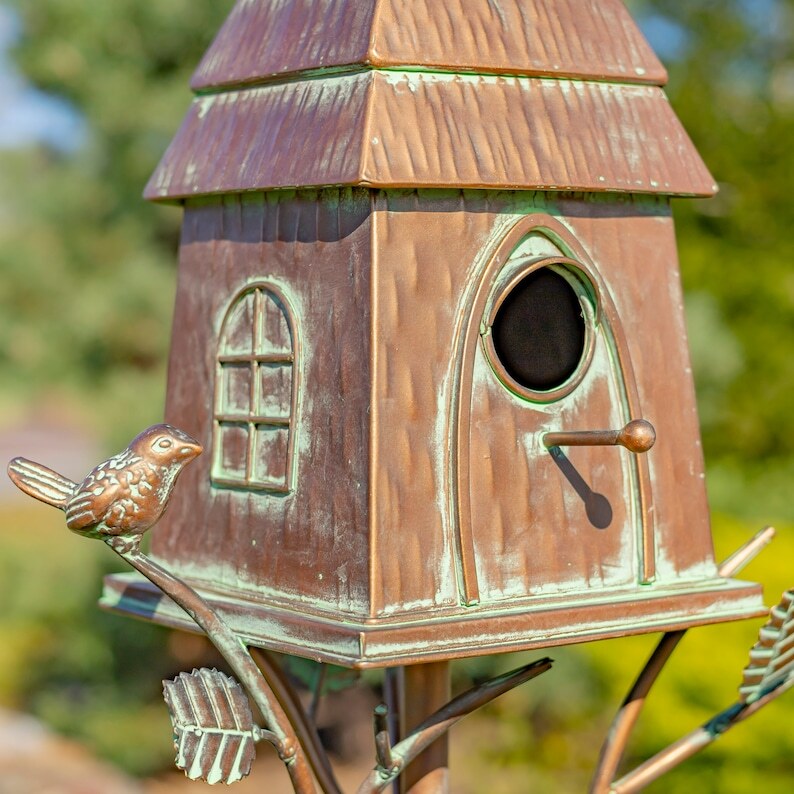 This piece features a square framed house with a tall, pyramid-shaped roof, resembling southeast Asian historical building and temples - hence the name. Bird are sure to flock to this birdhouse stake once its installed. It's high quality iron craftmanship, sturdy three-prong stake, fine details, and hand painted antique copper finish.