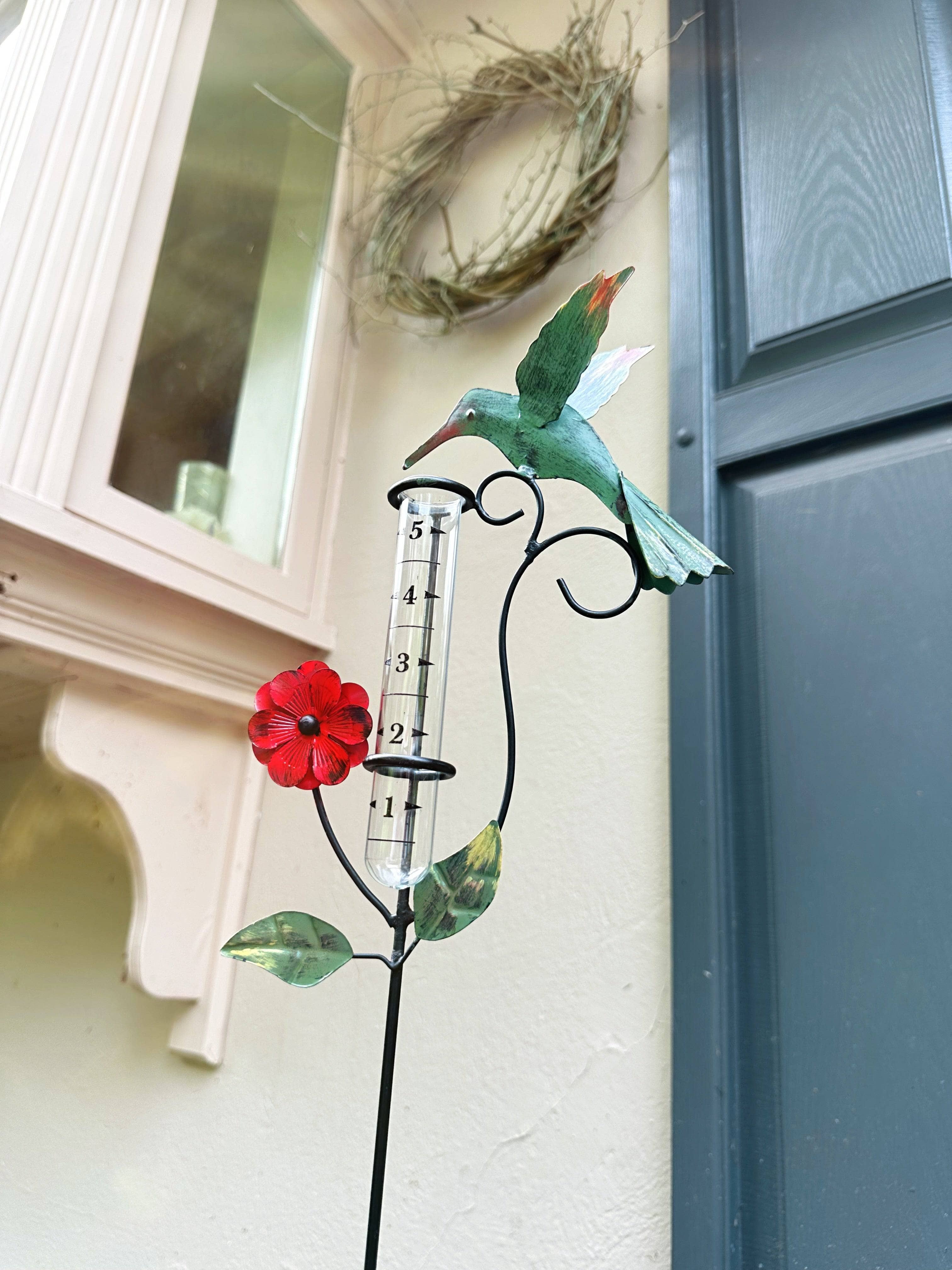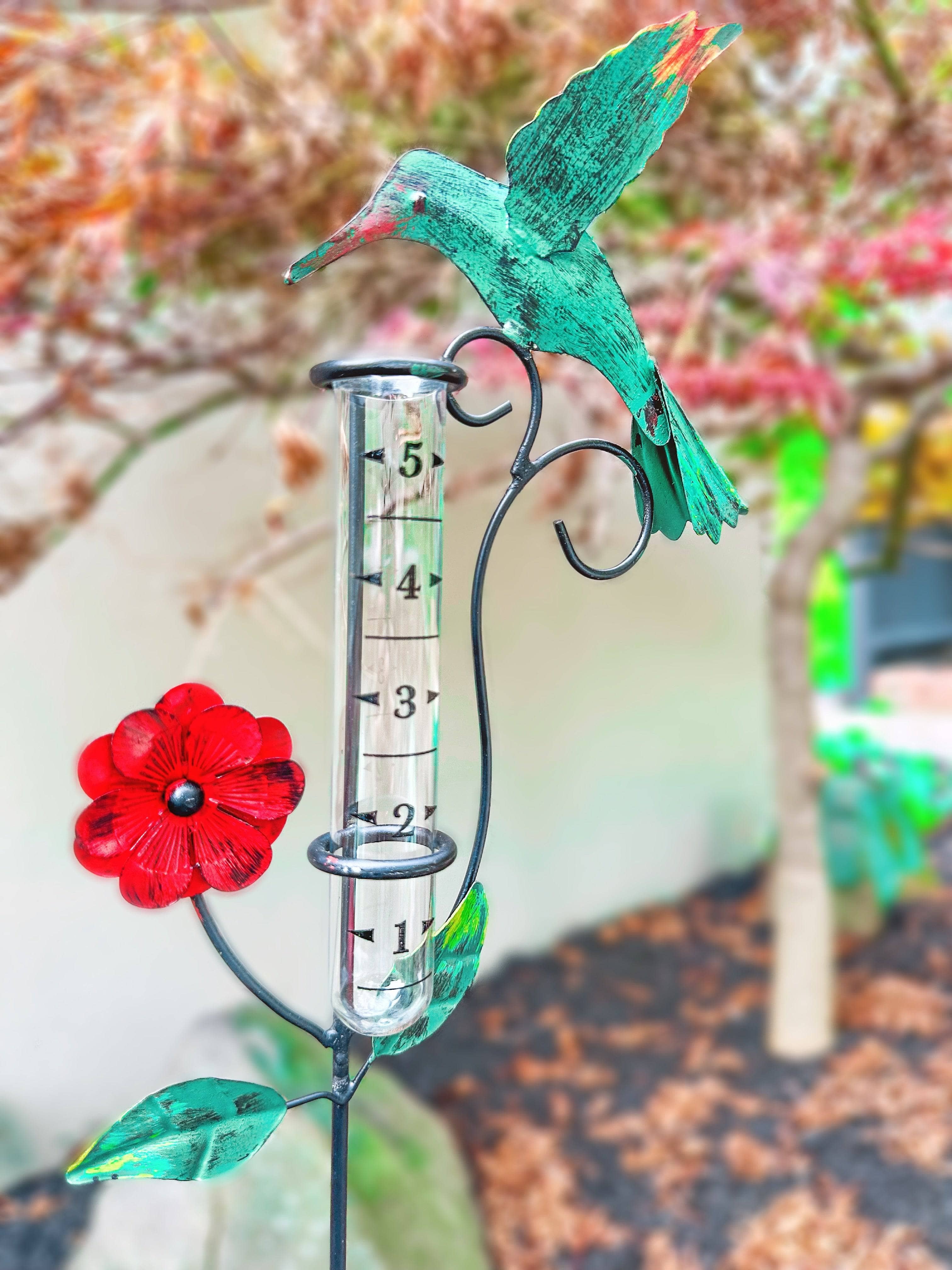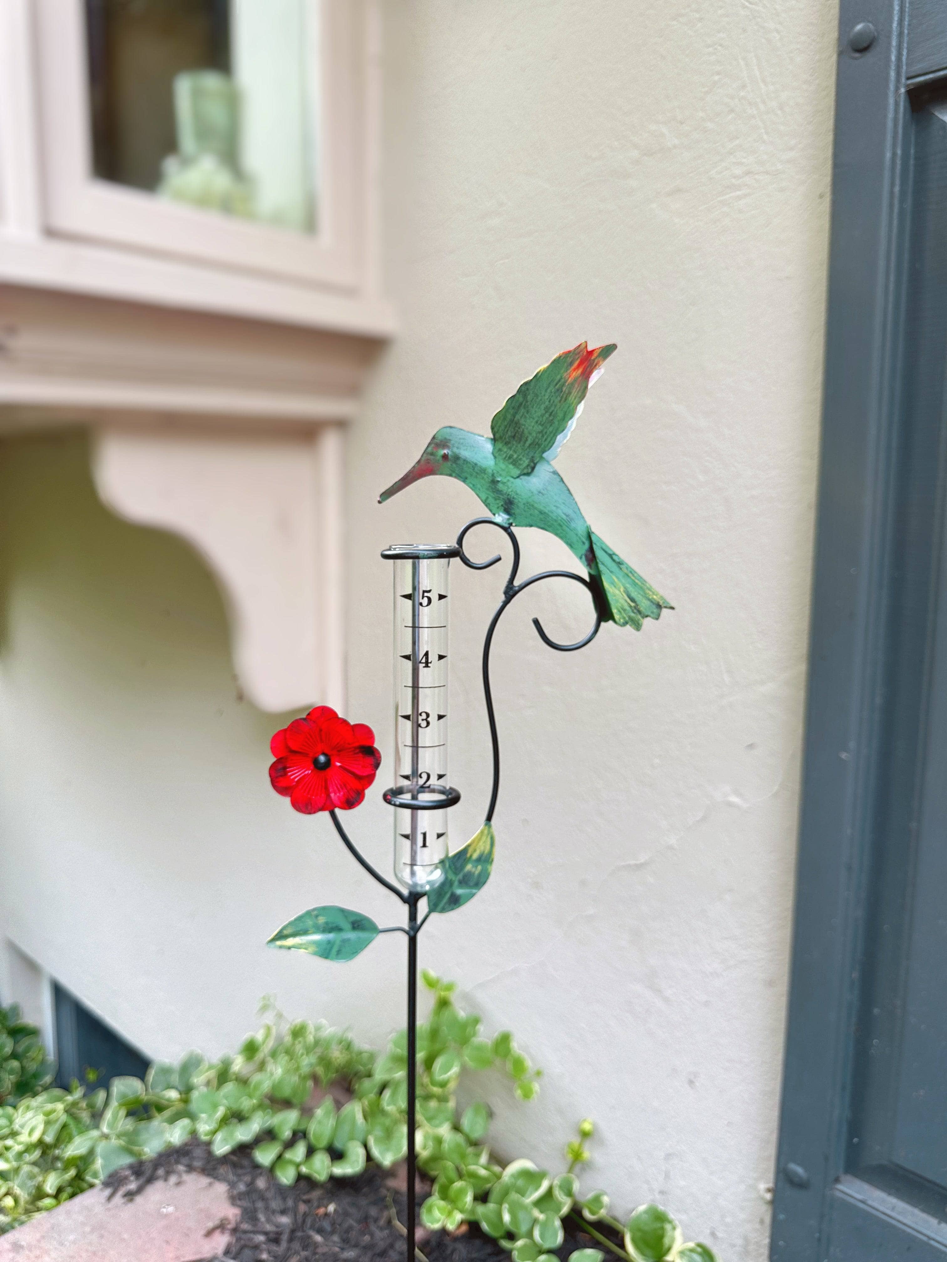 Even a rain gauge can be beautiful once you add a flower and a hummingbird to it.