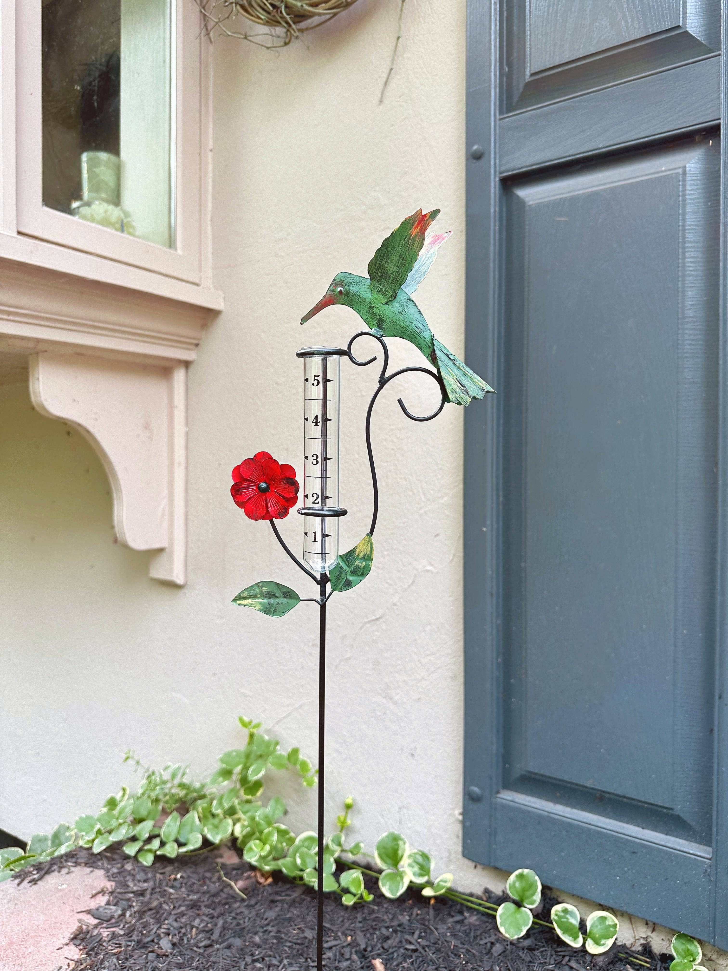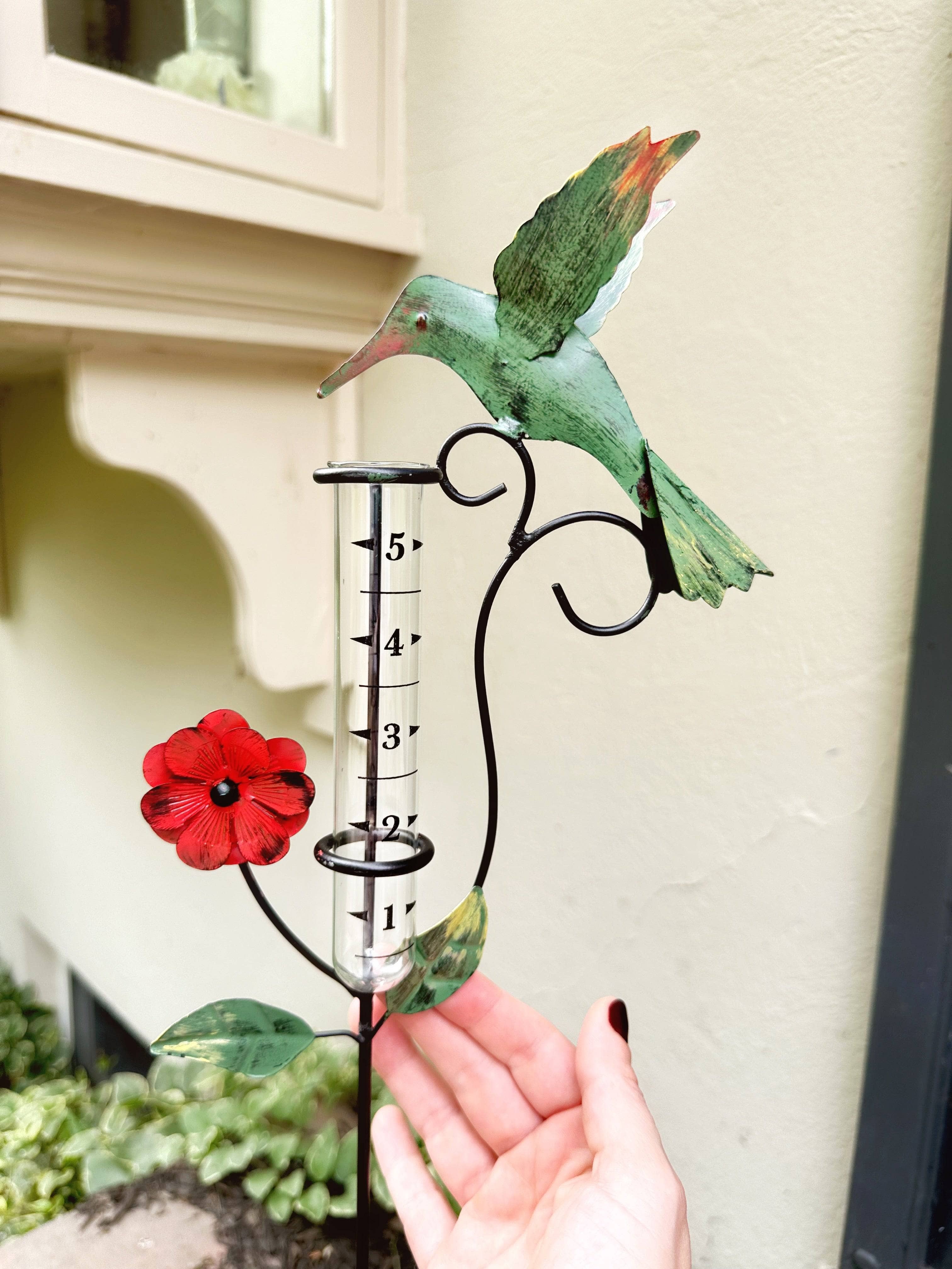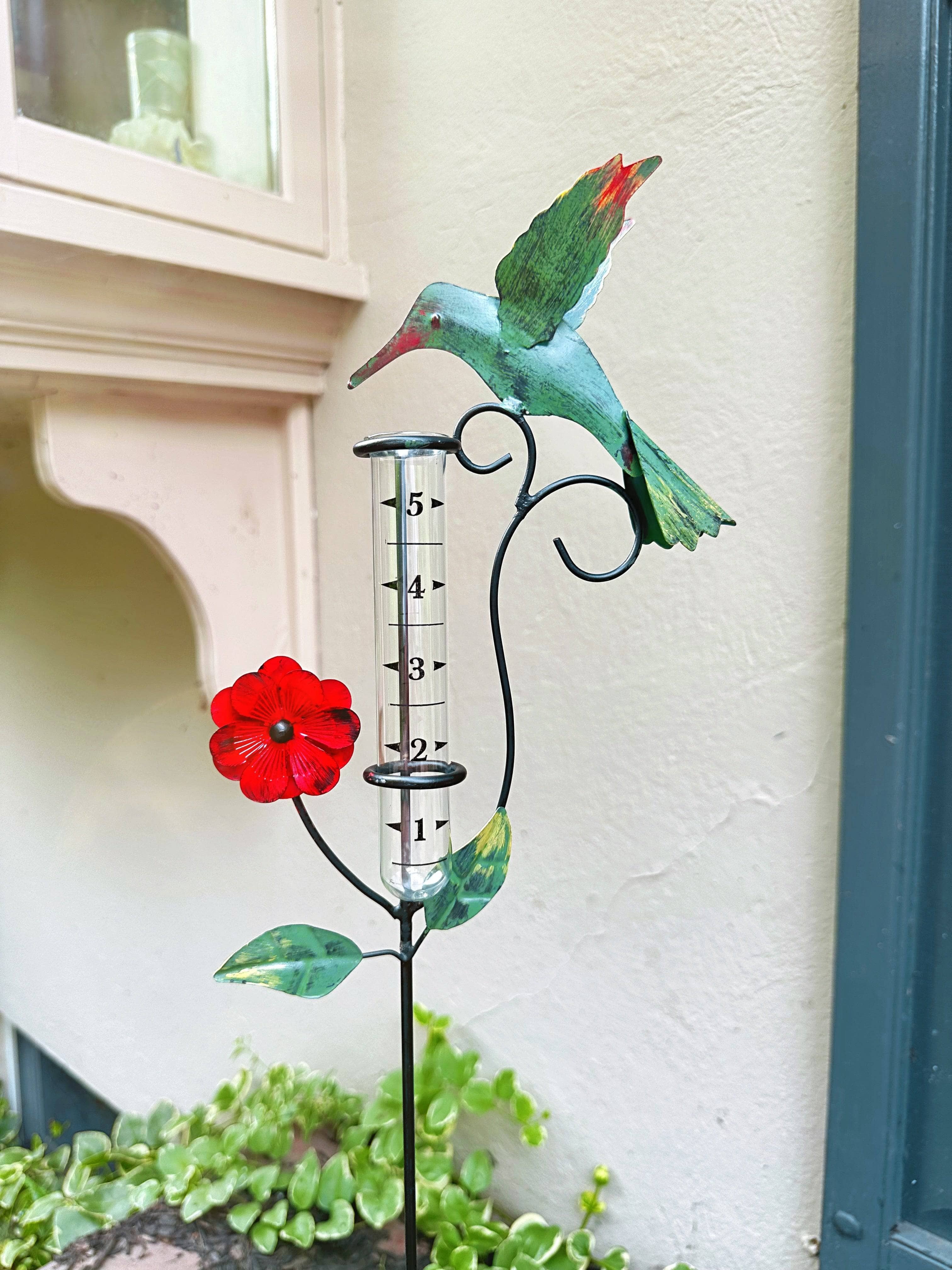 Even a rain gauge can be beautiful once you add a flower and a hummingbird to it.