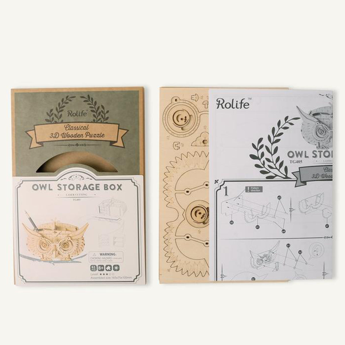 Robotime-Rolife Owl Box TG405 is an easy-level DIY storage box 3D wooden puzzle. It can be used as a pen & pencil holder after finished. It is a perfect educational 3d puzzle model to practice people's hands-on ability and innovative ability. This wooden storage box will be a nice and creative gift for your kids, friends, and family.