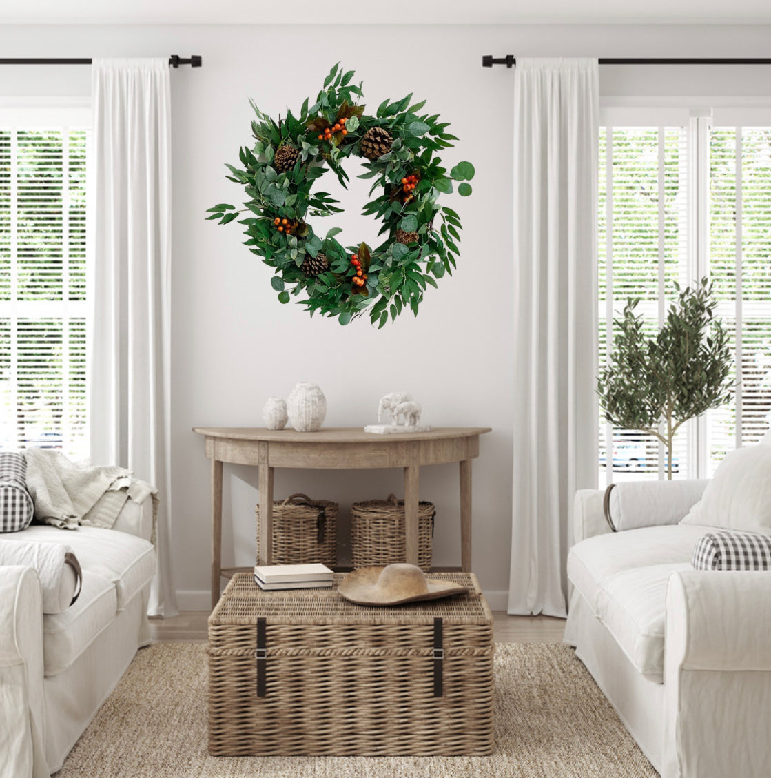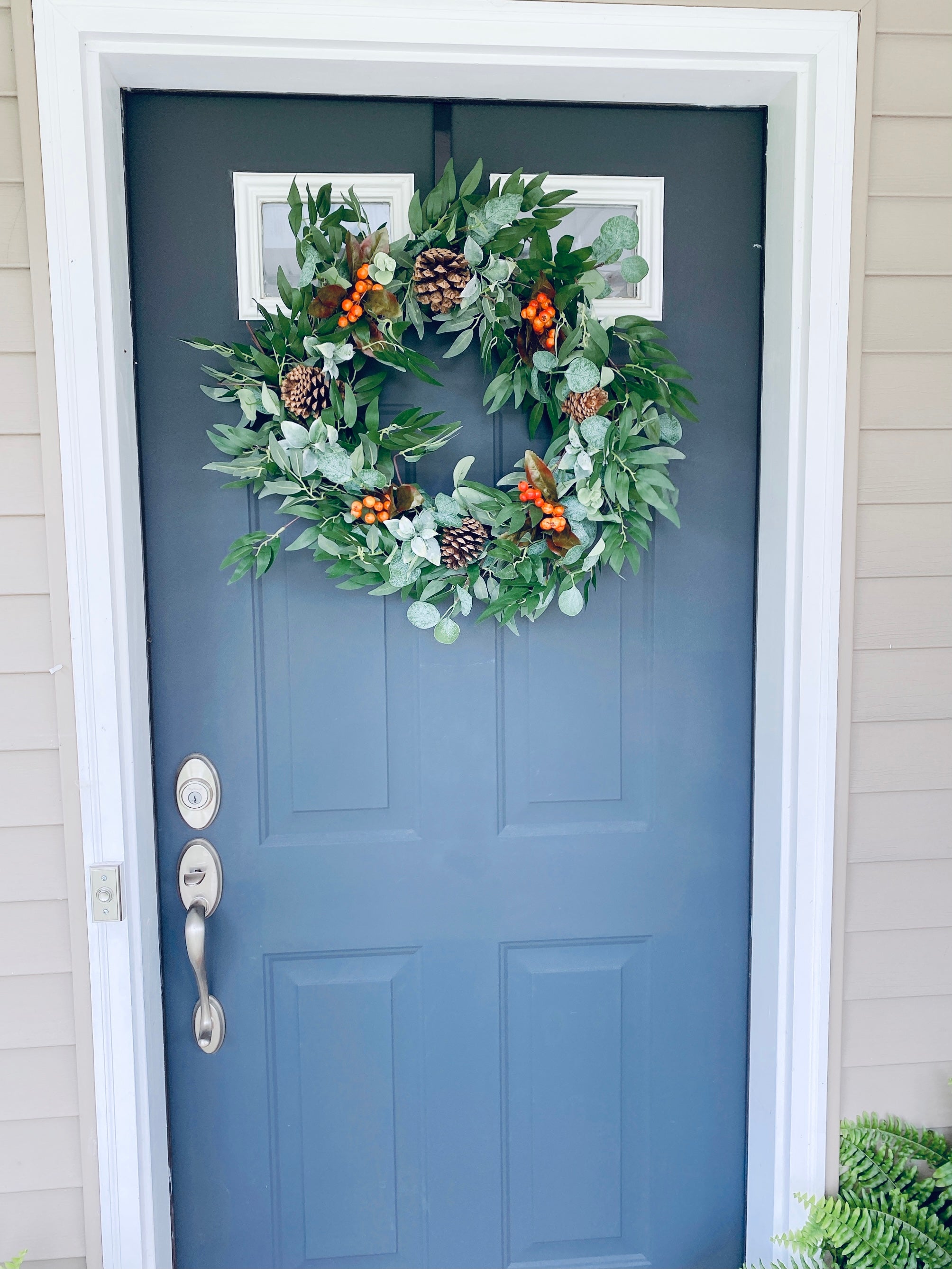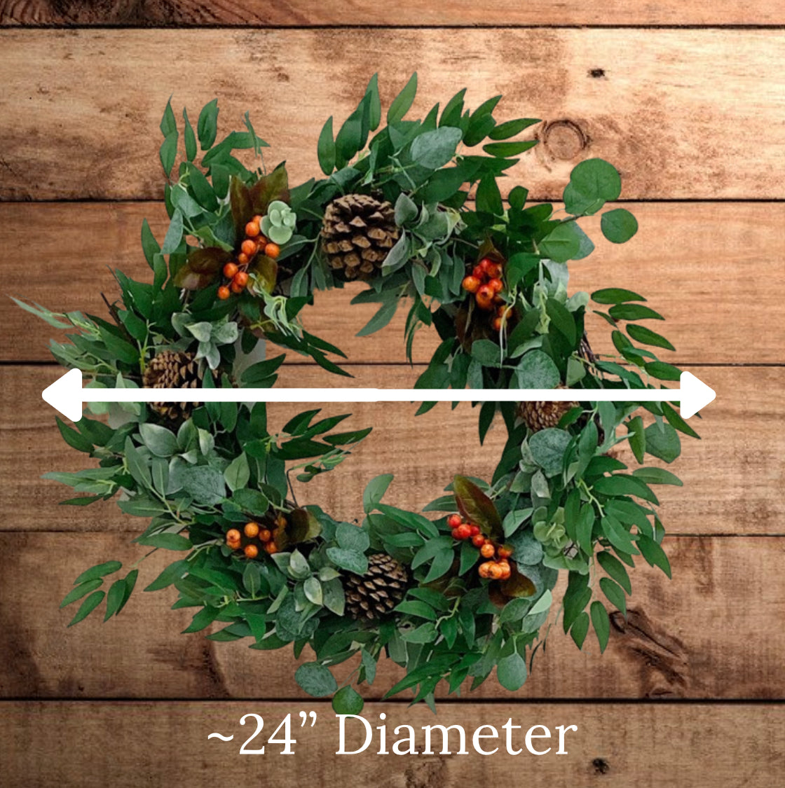 This wreath is made from faux willow leaves, lambs ear, eucalyptus greenery, vibrant faux orange berries, pinecones on a grapevine wreath form.