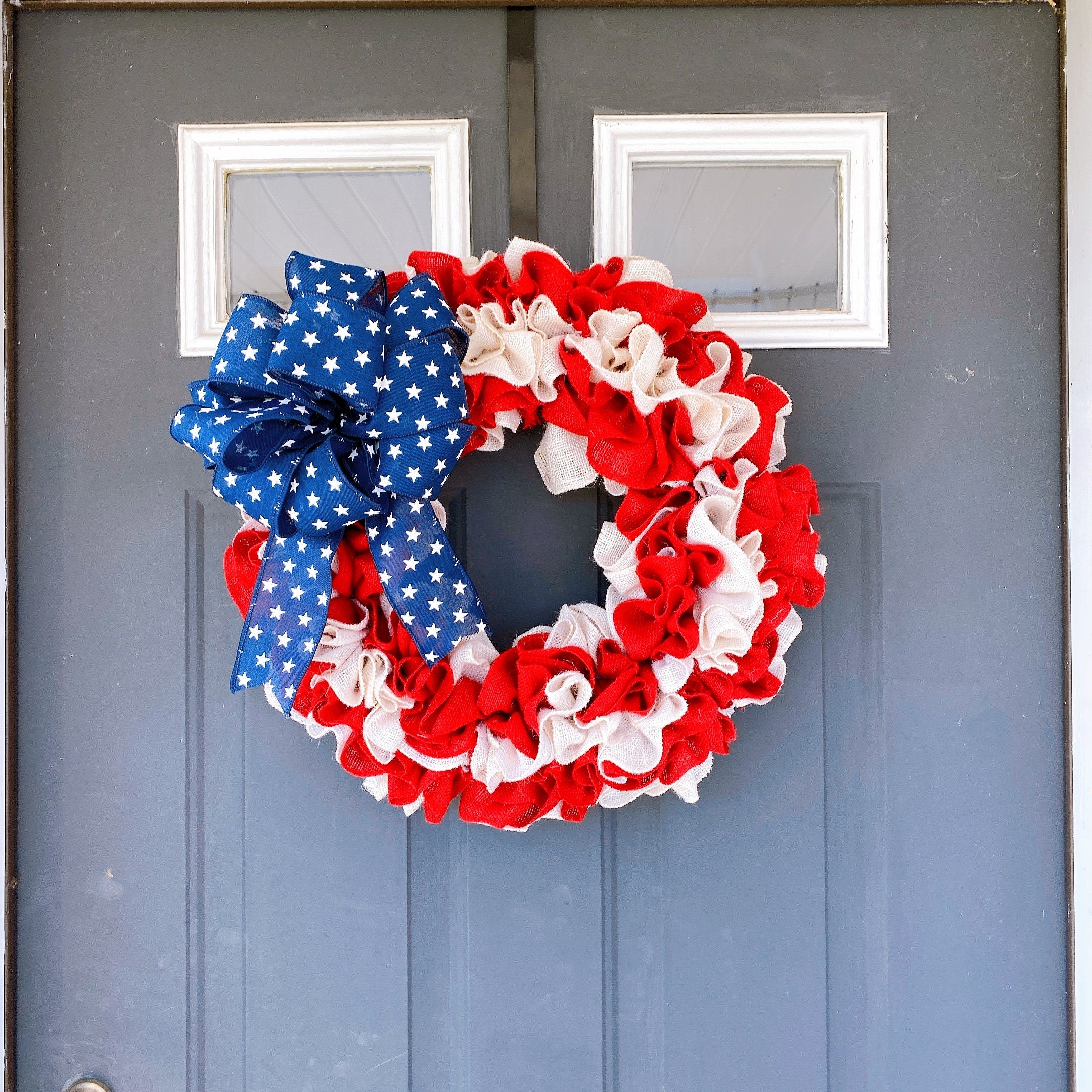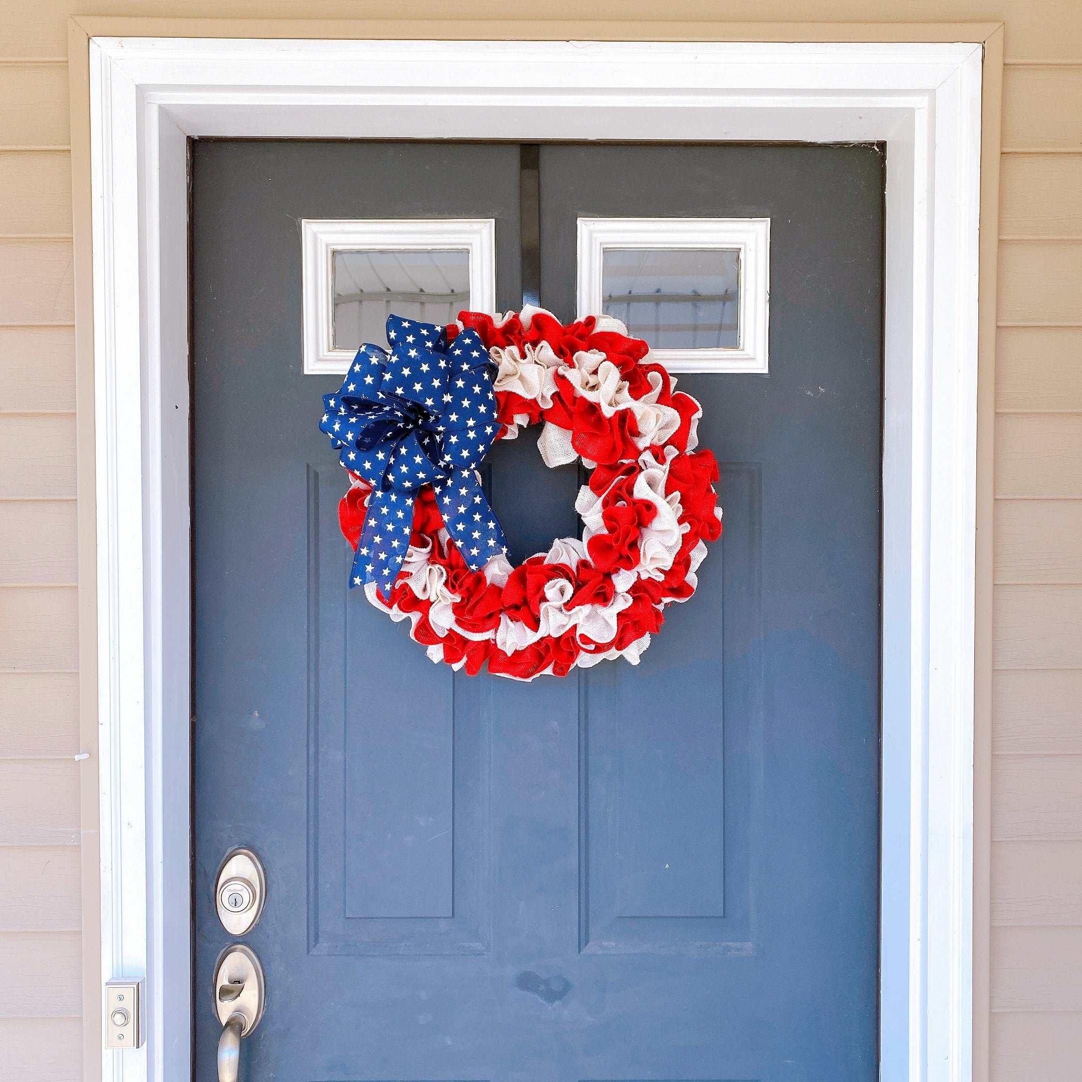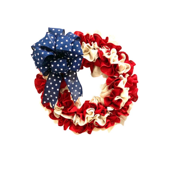 This Burlap wreath measures approximately 22” in diameter as a finished product. Use this American flag burlap wreath as a front door wreath, wall decor, or as an accessory to add additional style to wall decor such as window shutters, mirror, or picture frame.