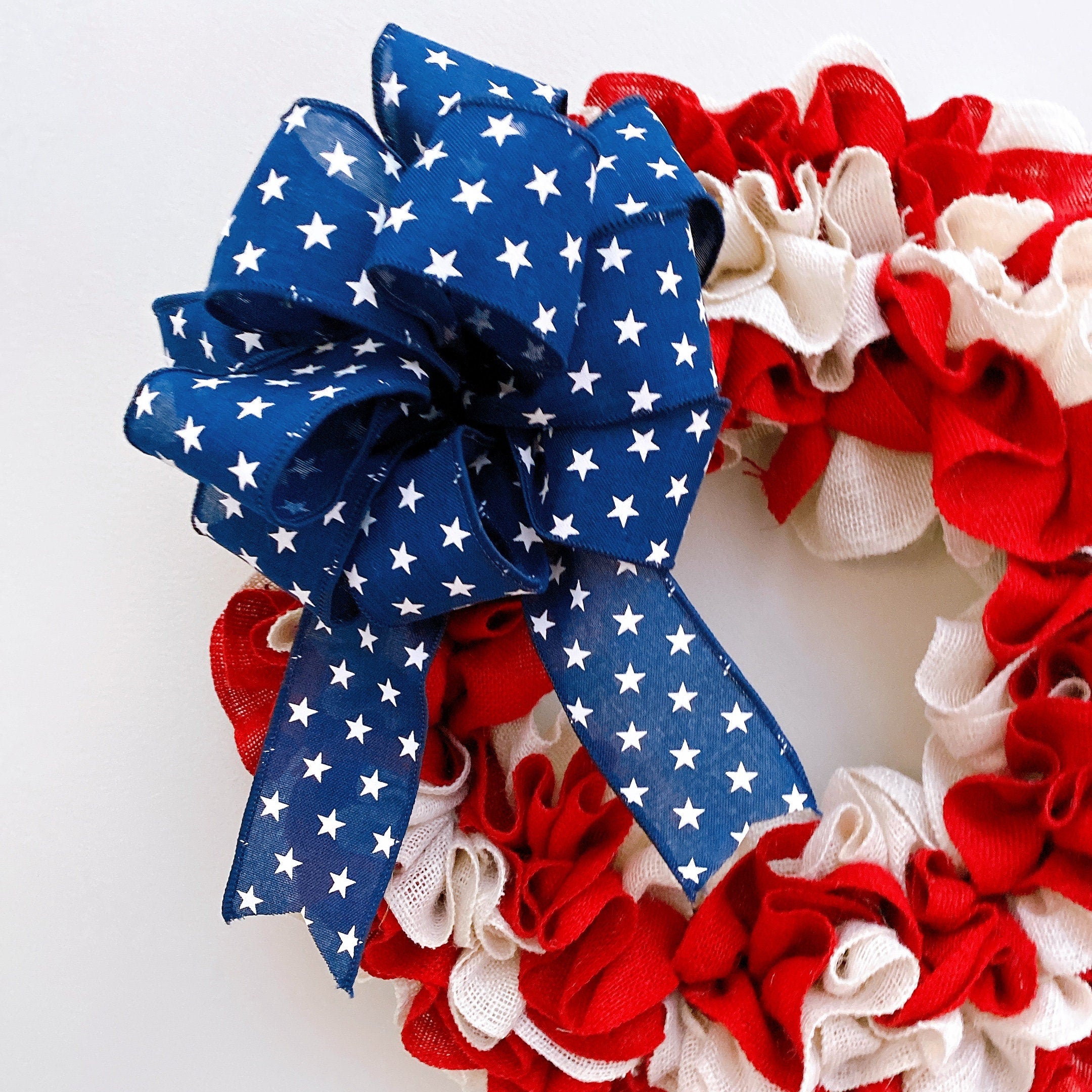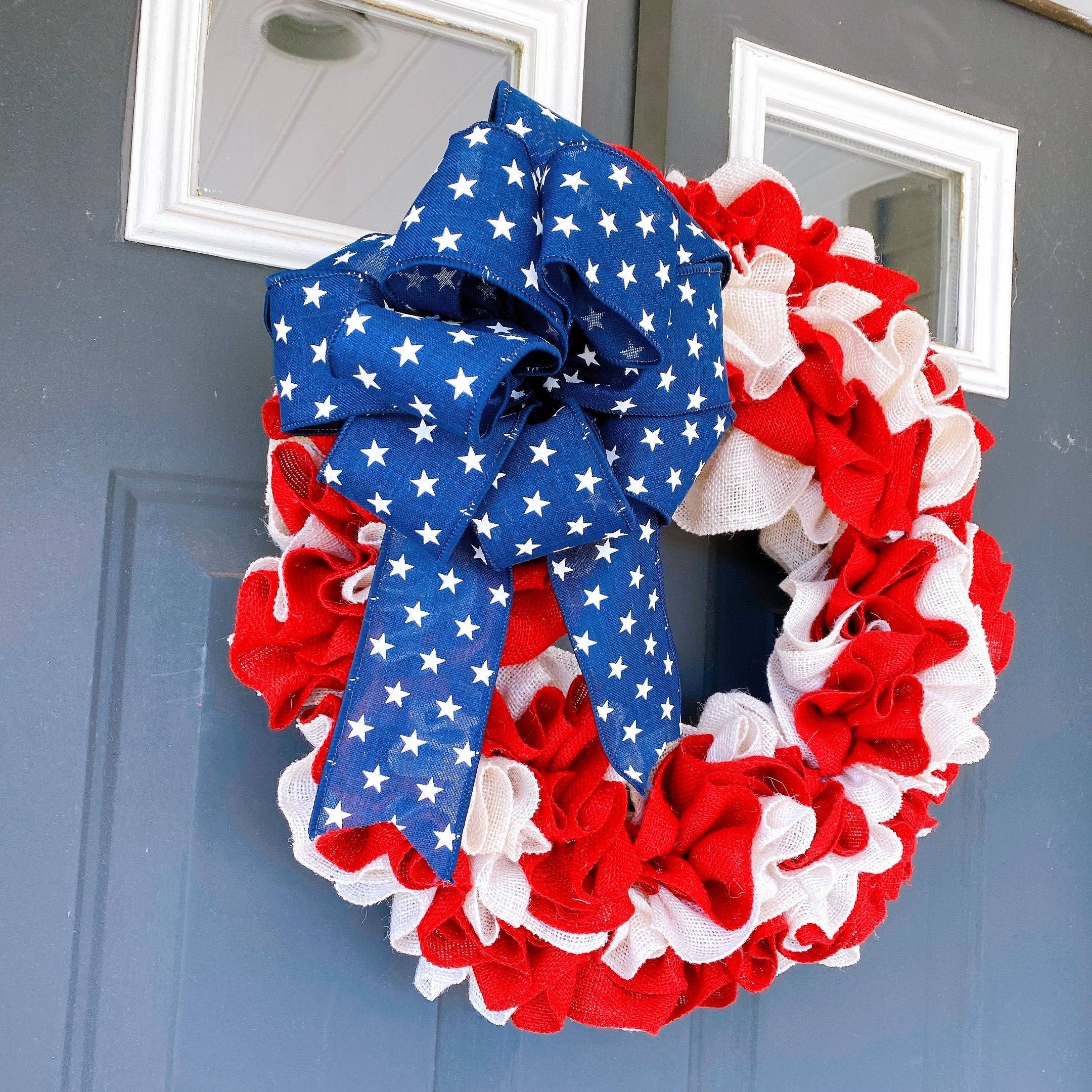 This American flag 4th of July wreath is created with big blue starred bow to accent the patriotic burlap wreath. This American farmhouse wreath that is multifunctional to be styled both indoors and outdoors. This ruffled burlap wreath with bow will bring patriotic vibes and your American pride to your cozy home.