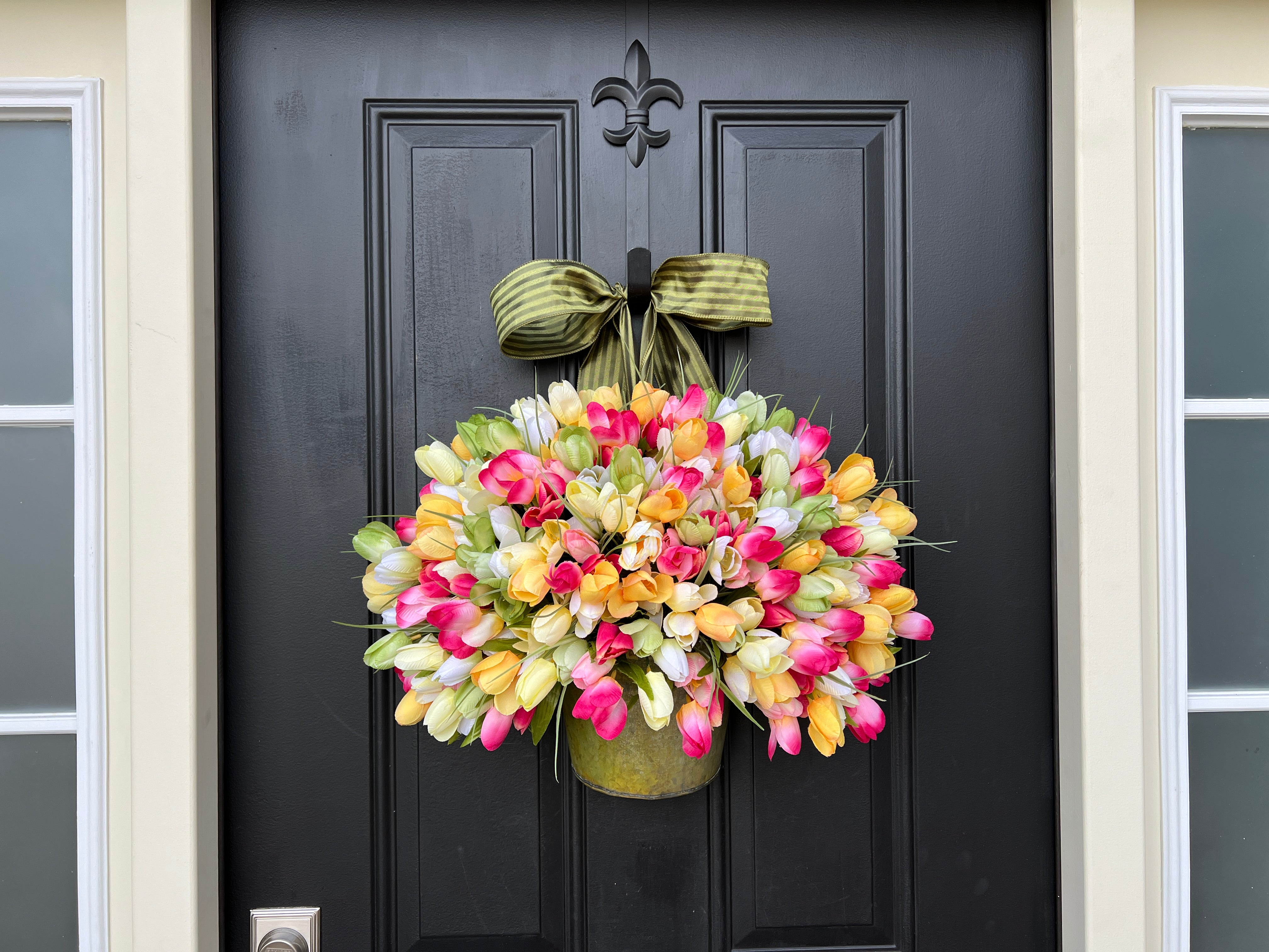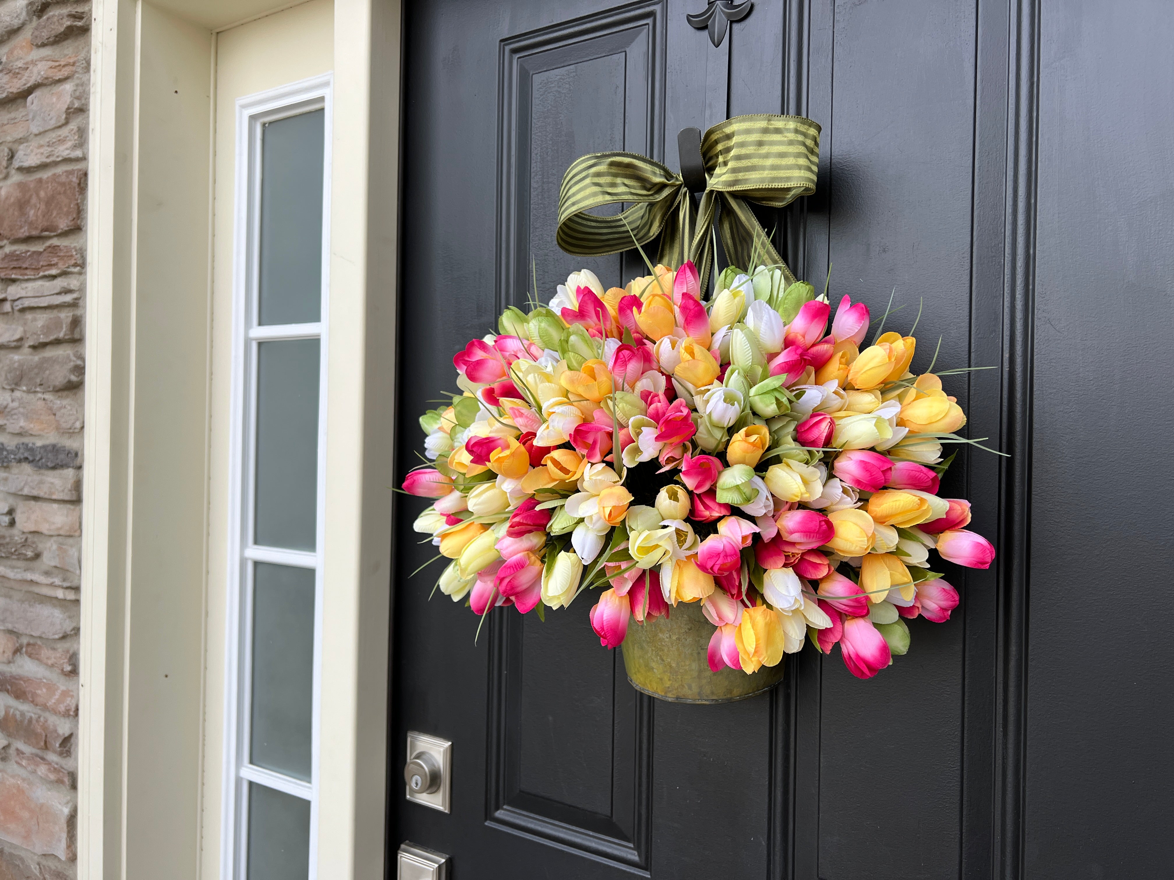 Add a pop of color to your entrance with our Bucket of Spring Tulips, featuring vibrant pink and yellow tulips. This seasonal door decor brings a cheerful, fresh touch to your home, perfect for welcoming the spring season. Handcrafted with lifelike tulips in a charming bucket, it’s an ideal accent for any door or porch.