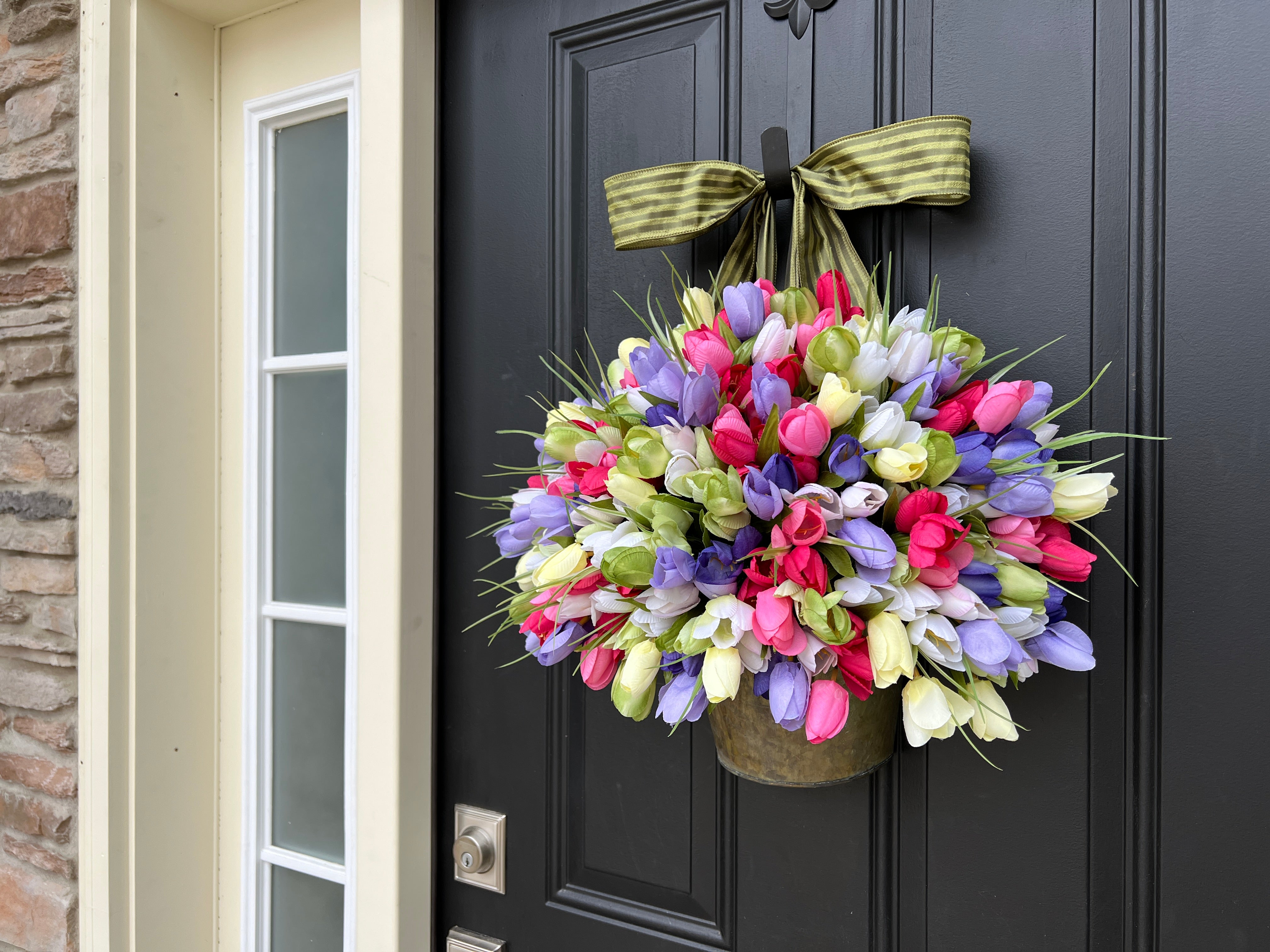 Welcome spring with our Celebration Front Door Bucket Wreath, featuring faux lavender pink and green tulips. Perfect for Mother's Day and Easter celebrations, this charming wreath adds a cheerful, seasonal touch to your entrance. Crafted with care, it’s an ideal way to celebrate the season and brighten any space.