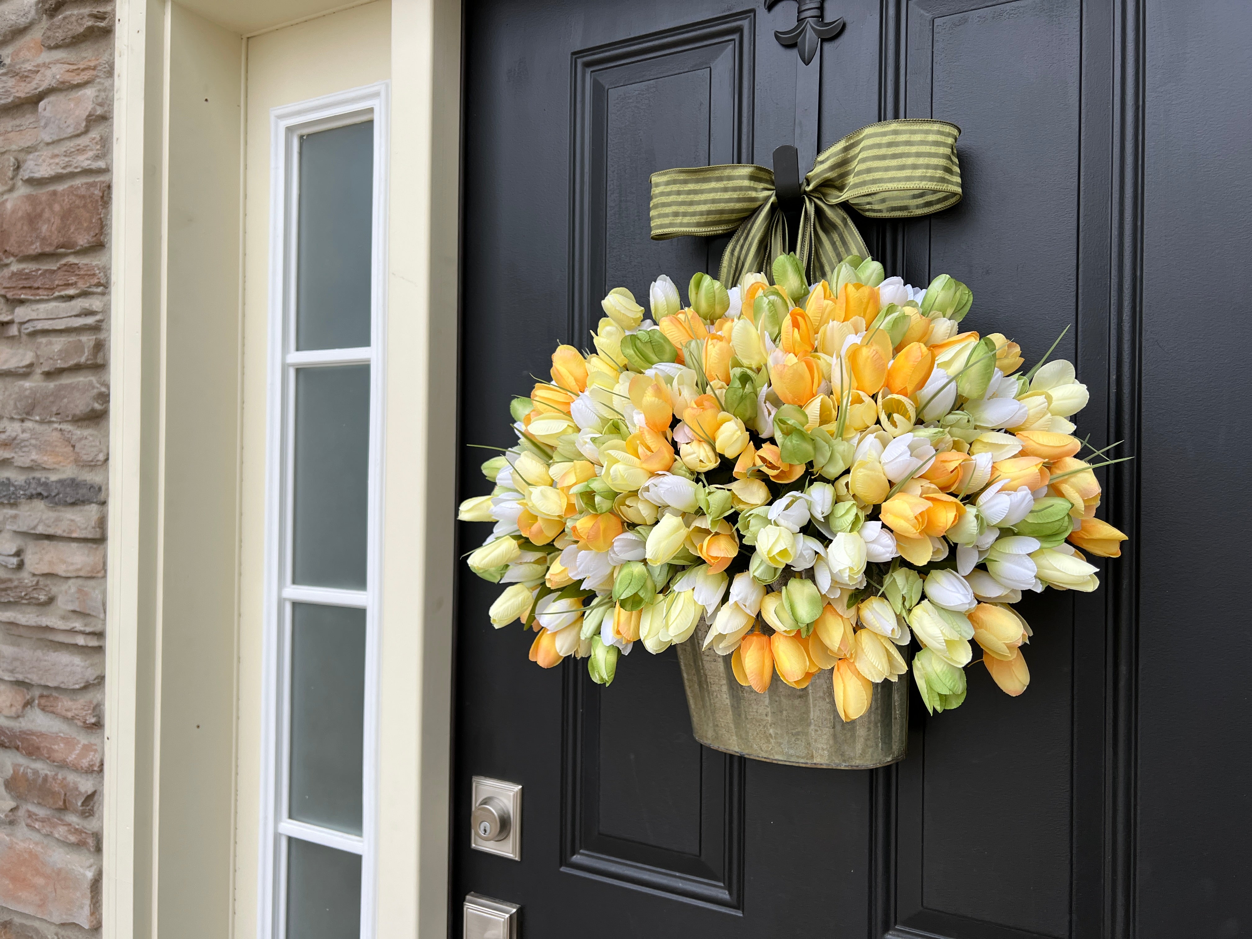 Welcome spring with the Cheerful Tulip Bucket for Spring Front Door. Featuring vibrant yellow, green, and white faux tulips, this sunshine-filled bucket adds a bright, cheerful touch to your entryway.