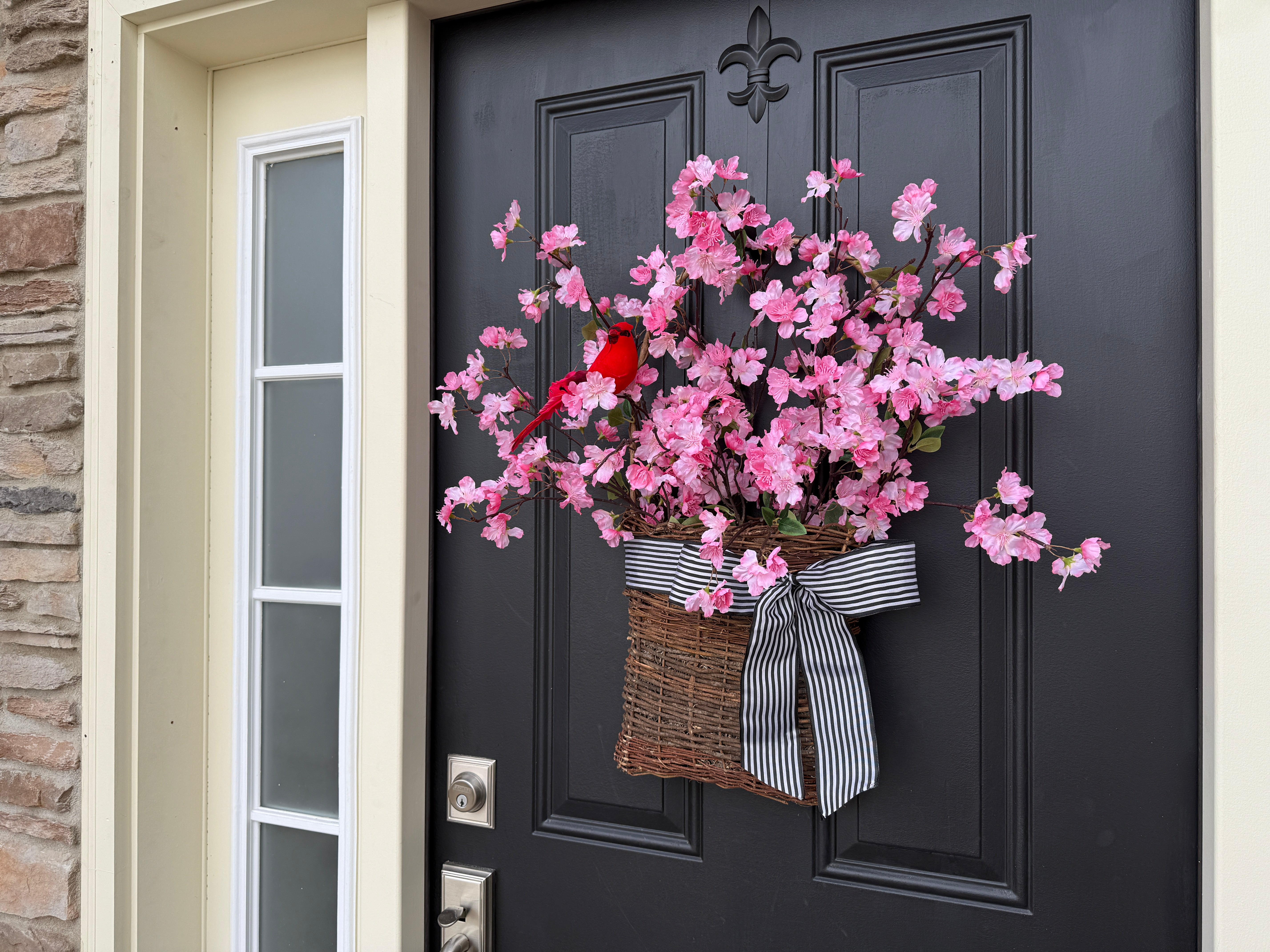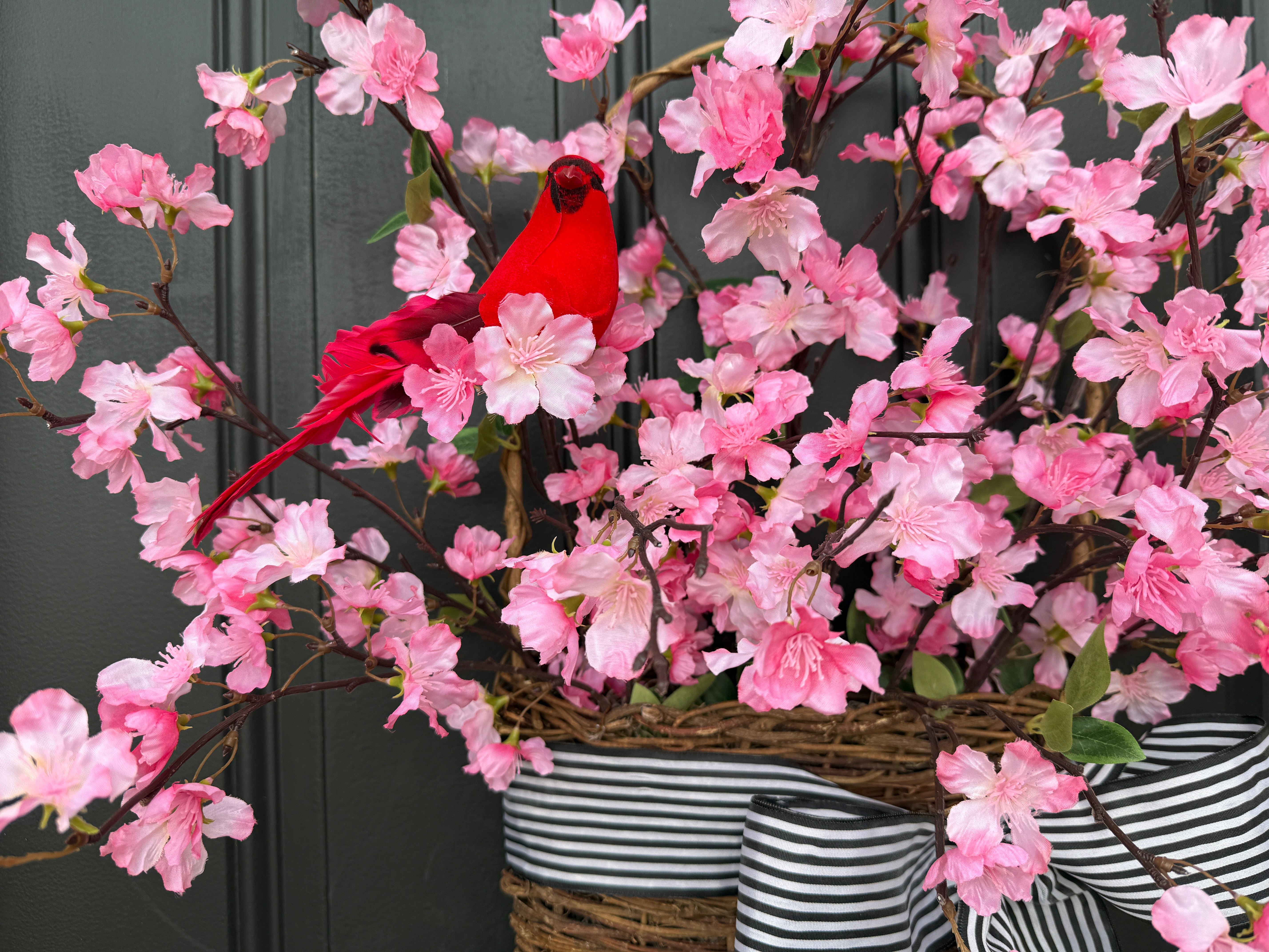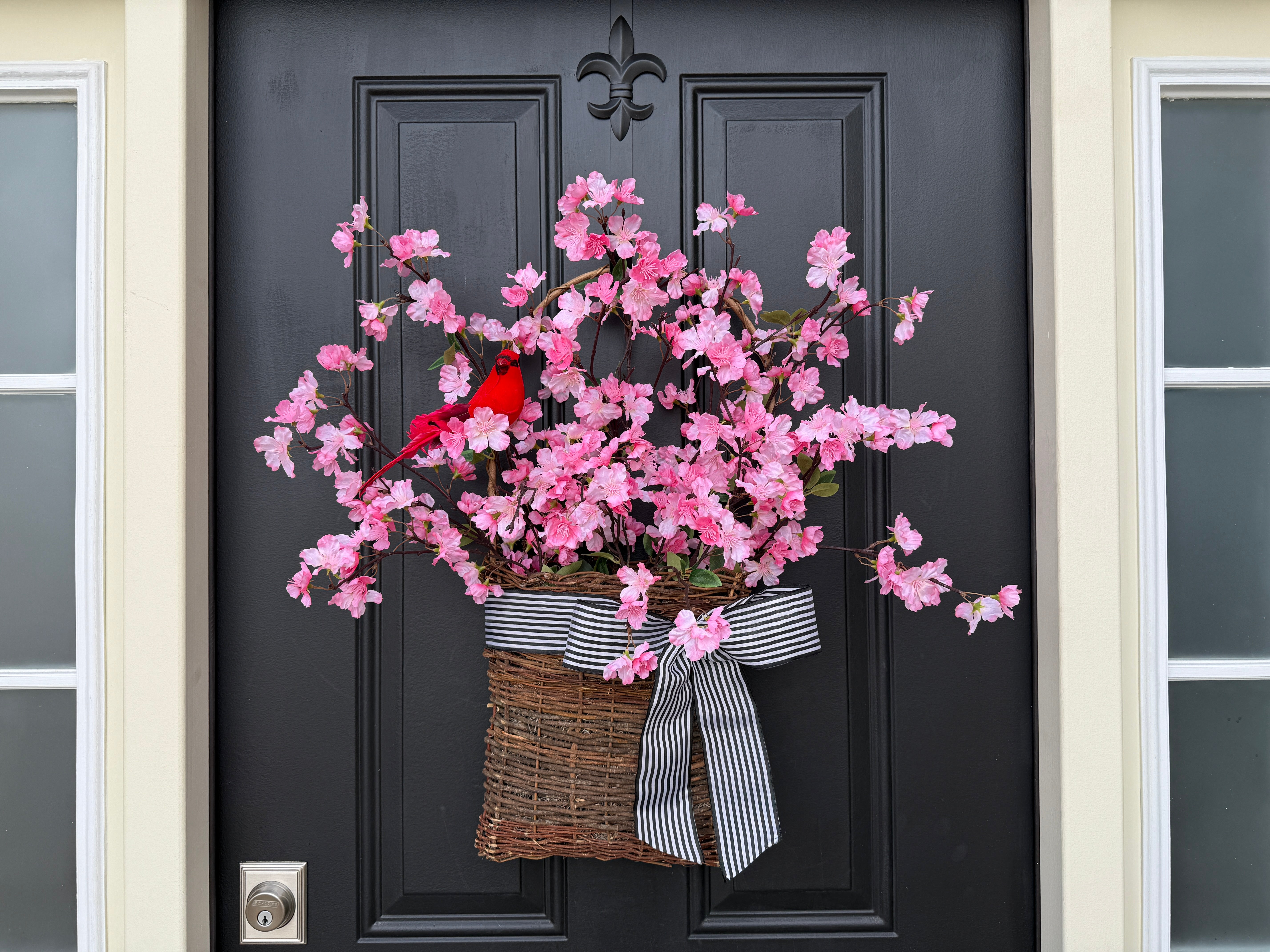 Welcome spring with the Cherry Blossoms Basket Wreath. Featuring vibrant pink blooms and a sweet red cardinal, this front door basket wreath adds a pop of color and natural beauty to your entryway. Perfect for celebrating the season and welcoming guests with a fresh, seasonal touch. Ideal for spring decor, this wreath brings elegance and cheer to any home.