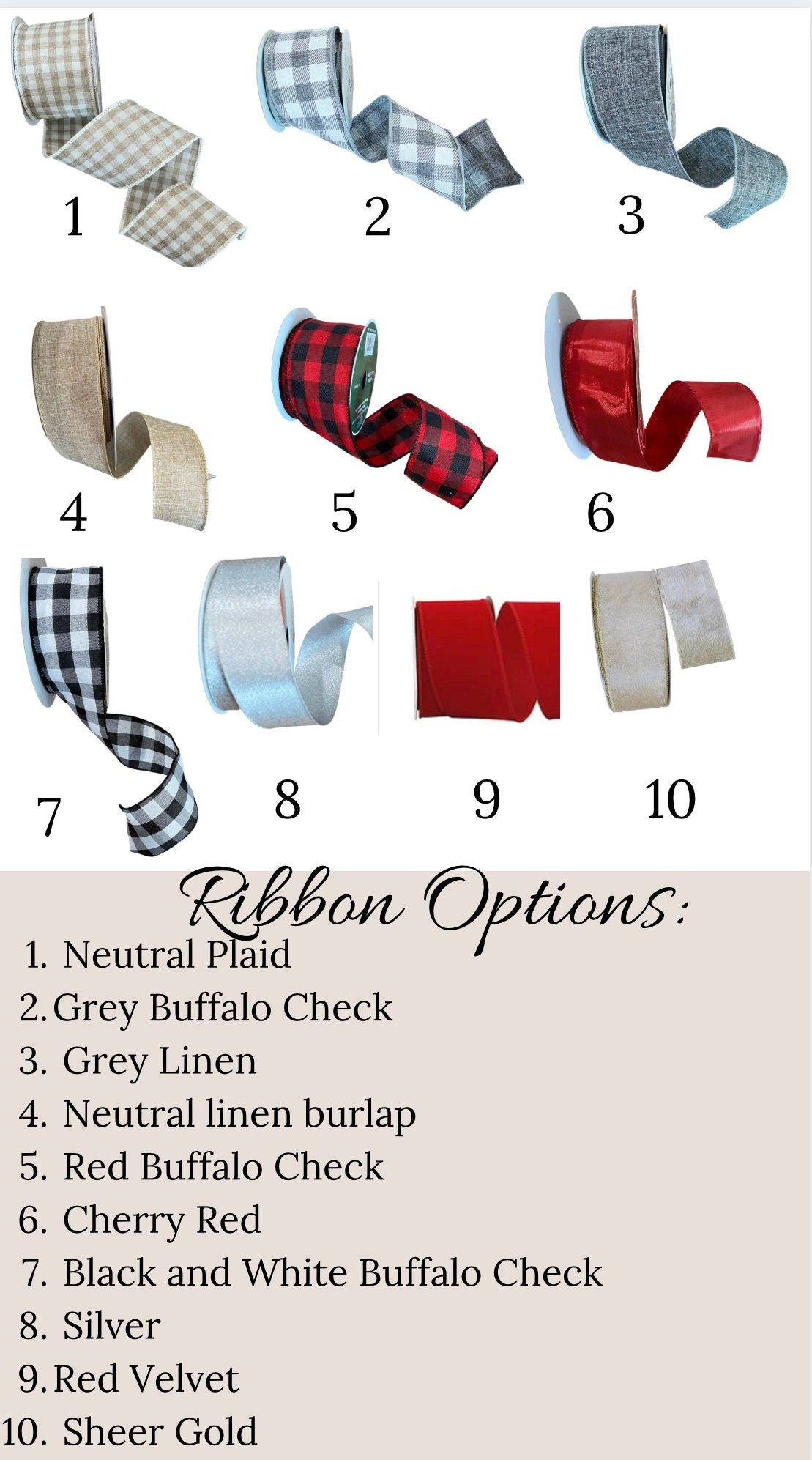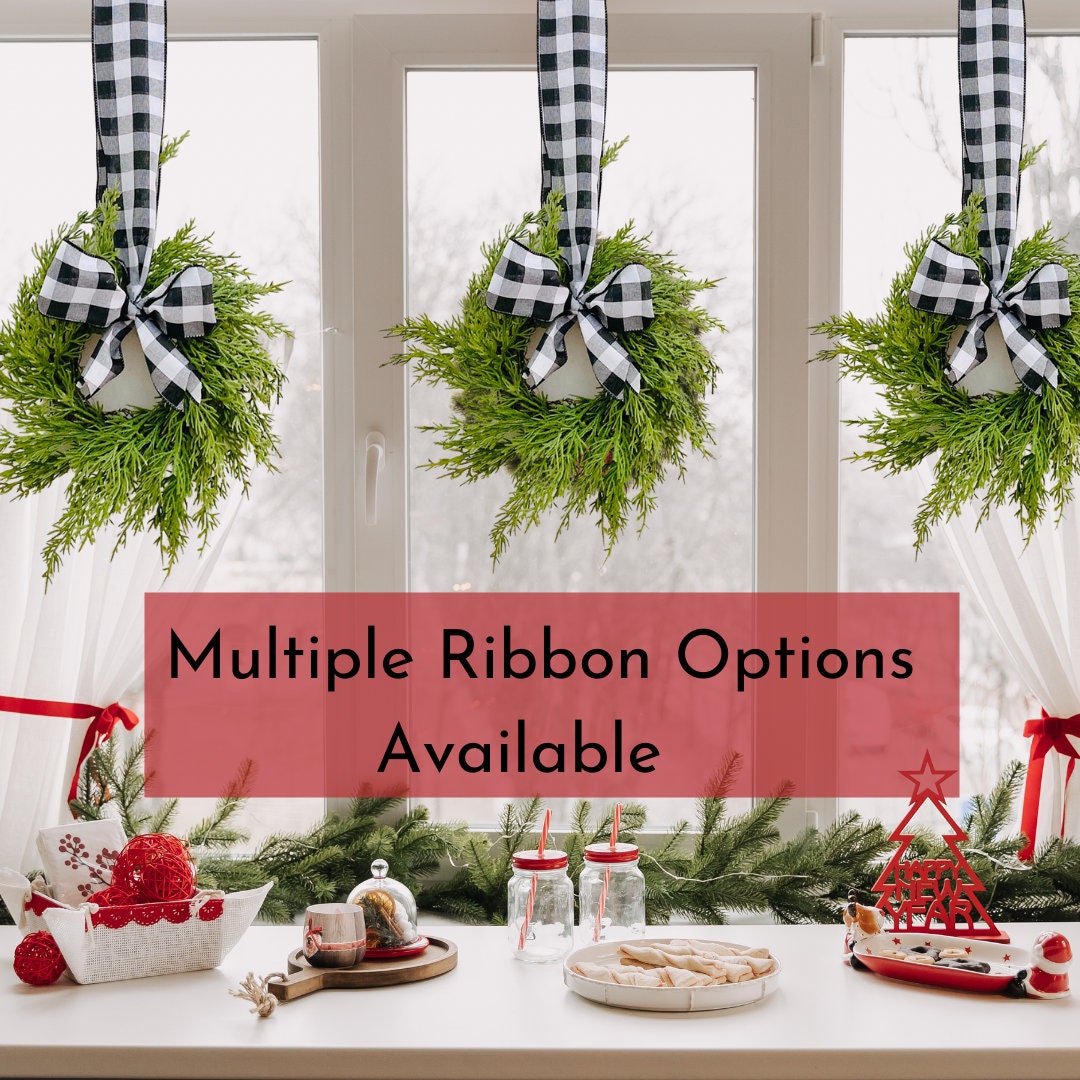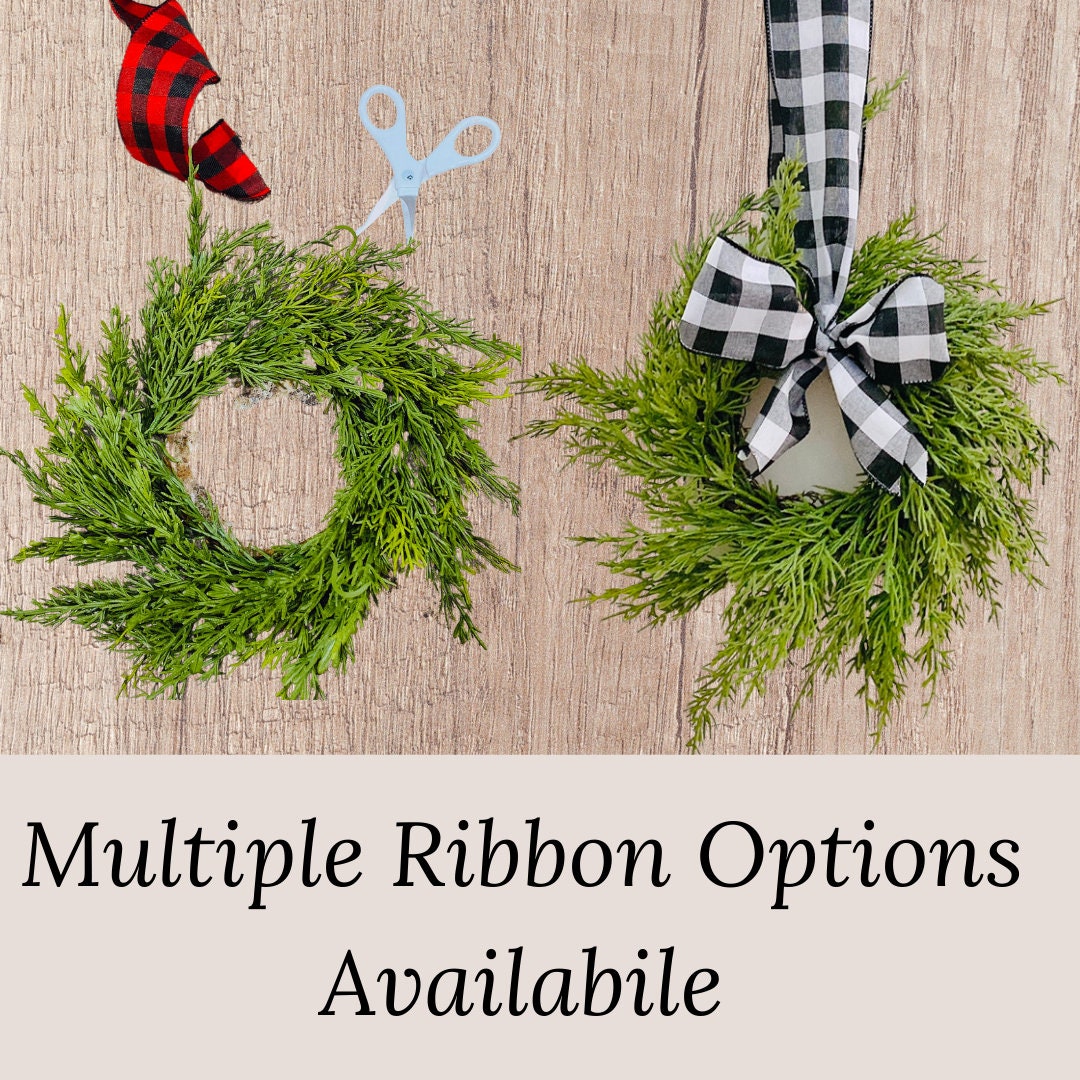 These Christmas Mini Cabintet Wreaths with Ribbon and Bow are made with faux cedar greenery and black and white buffalo plaid ribbon.