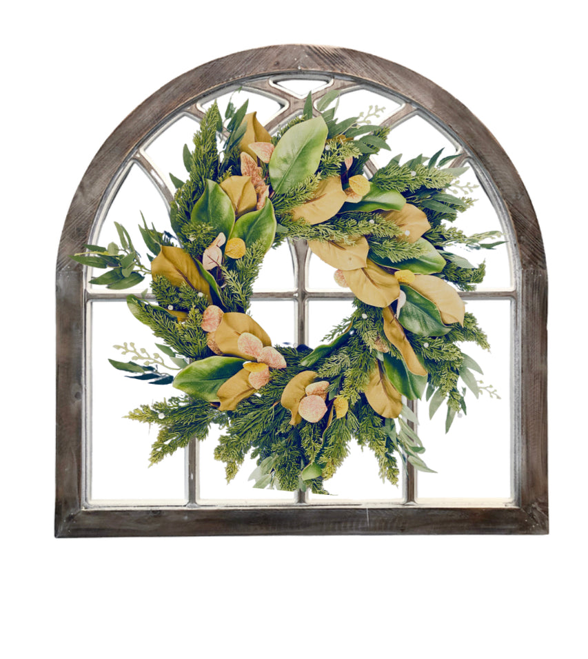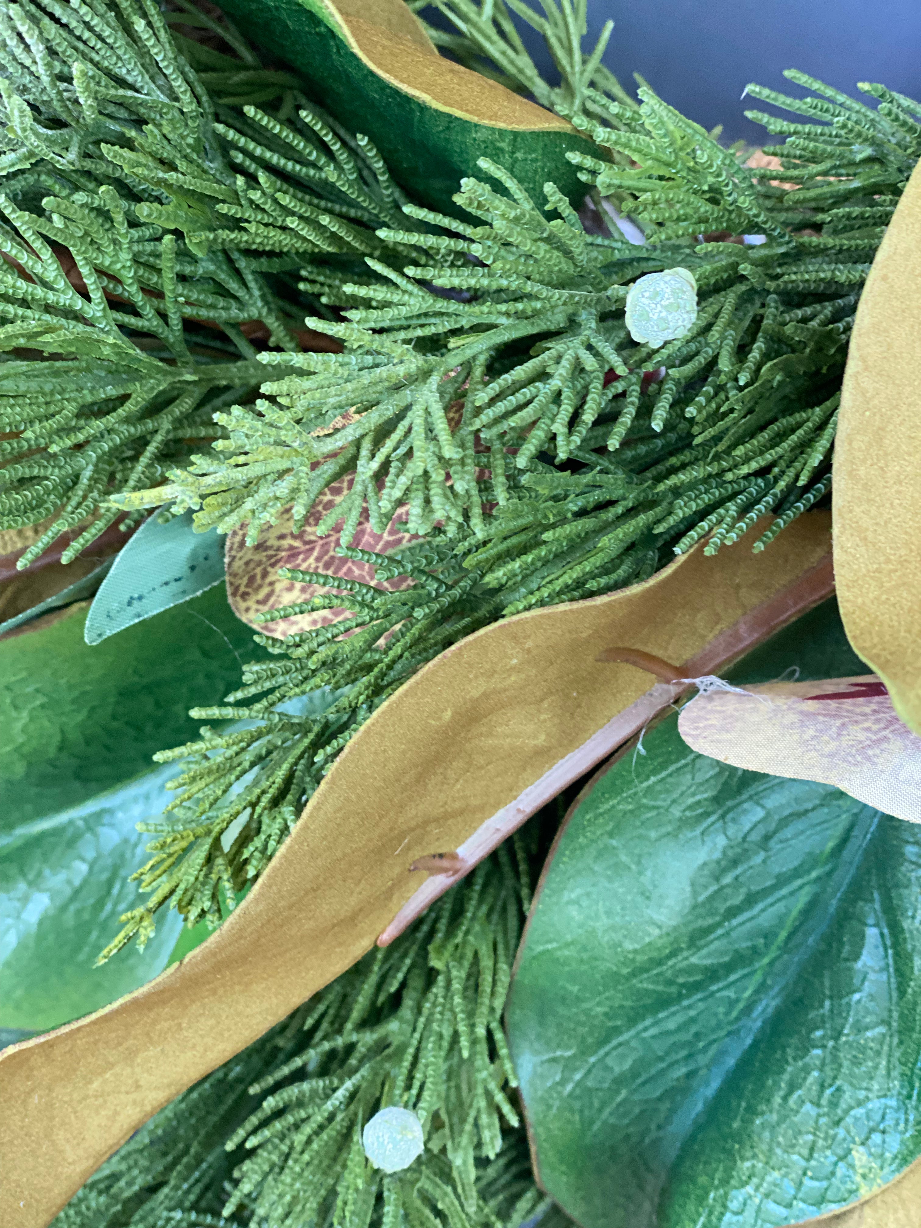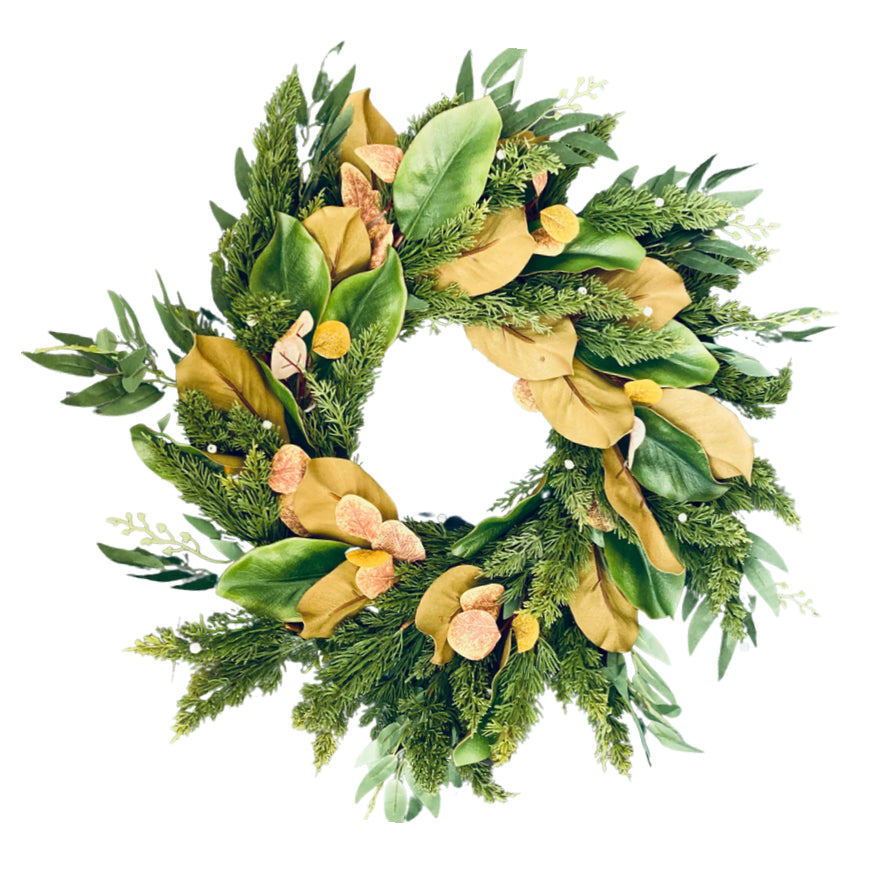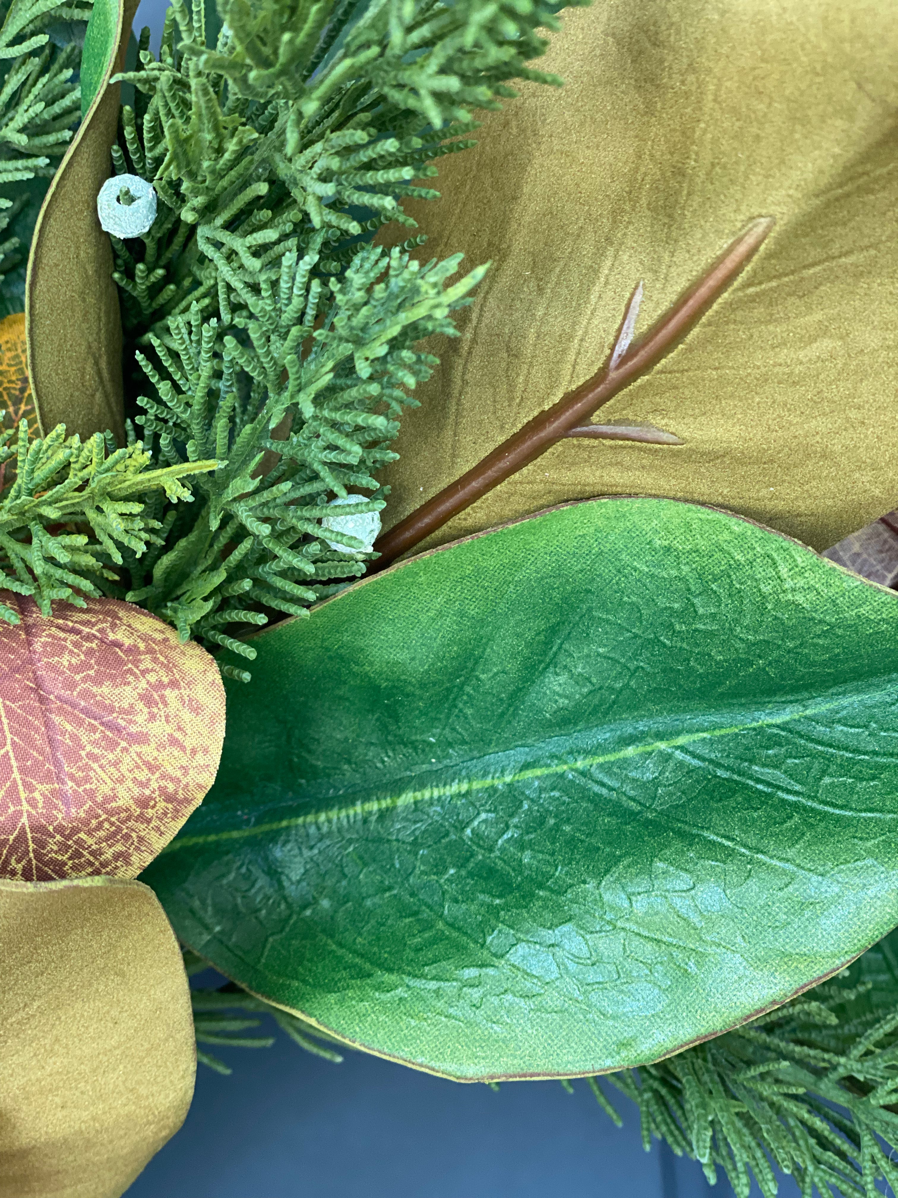 This fall magnolia and eucalyptus wreath is created with bushels of ombré eucalyptus, pine, magnolia leaves, and faux berries. This wreath measures approximately 24” in diameter measuring from the two widest points of the wreath.