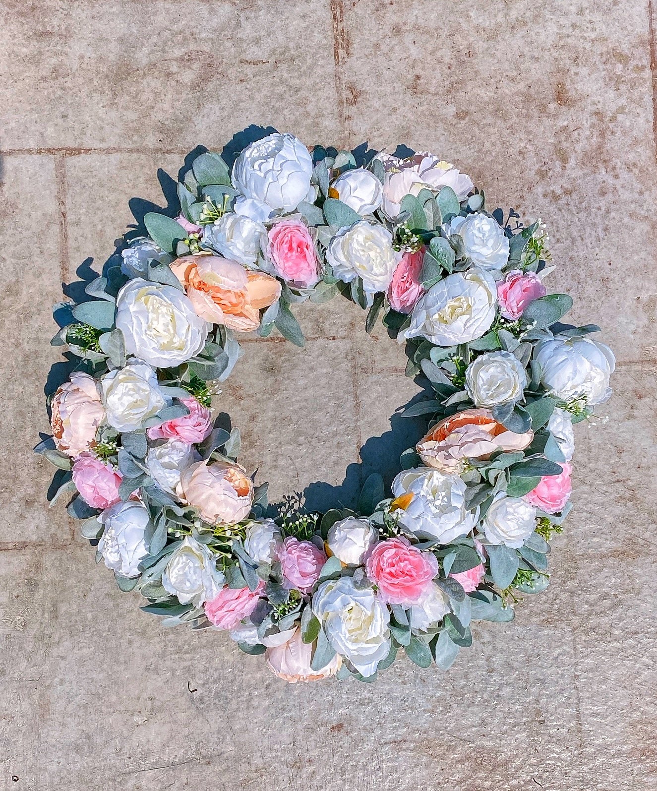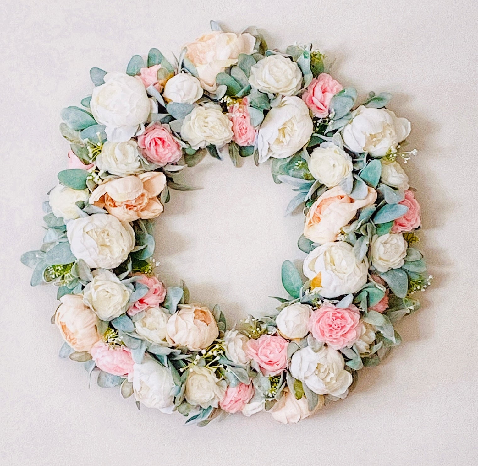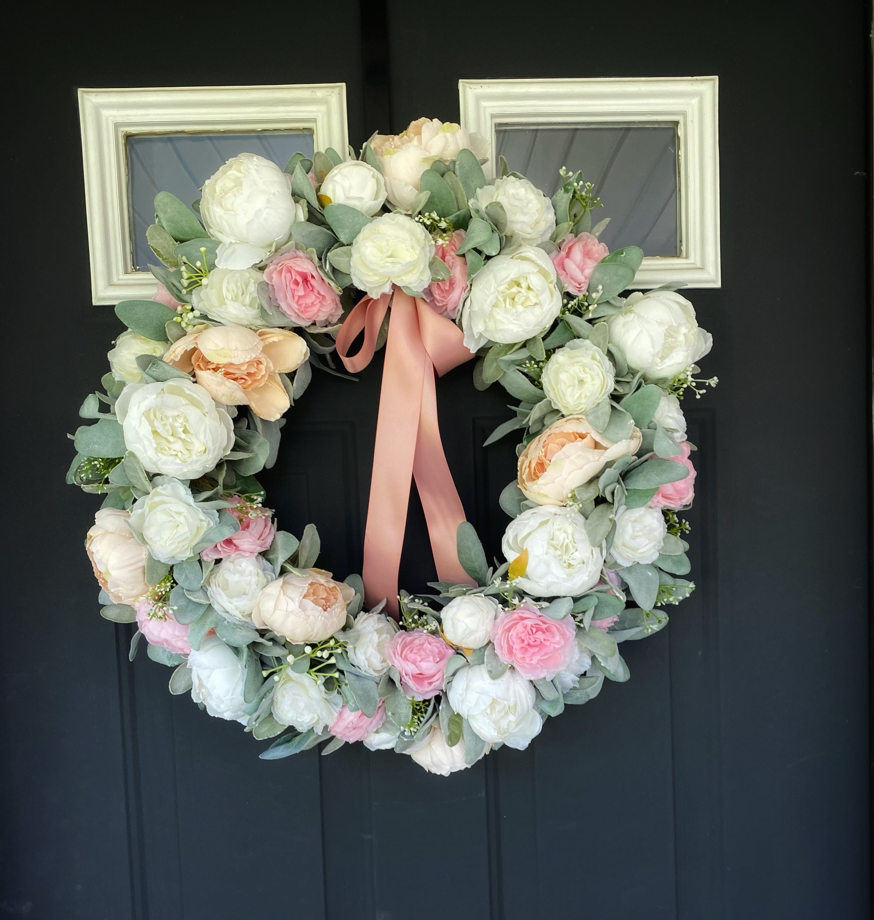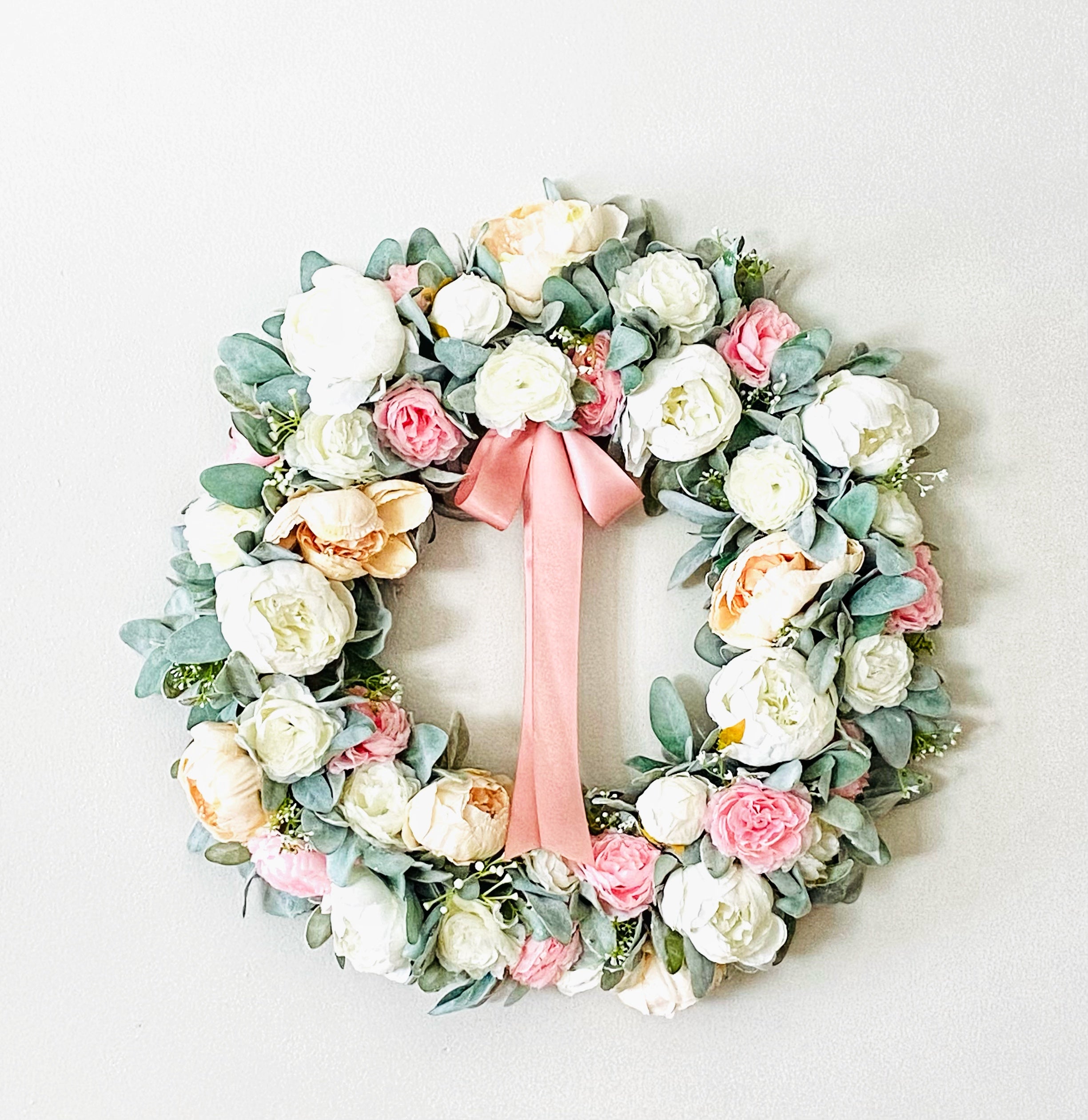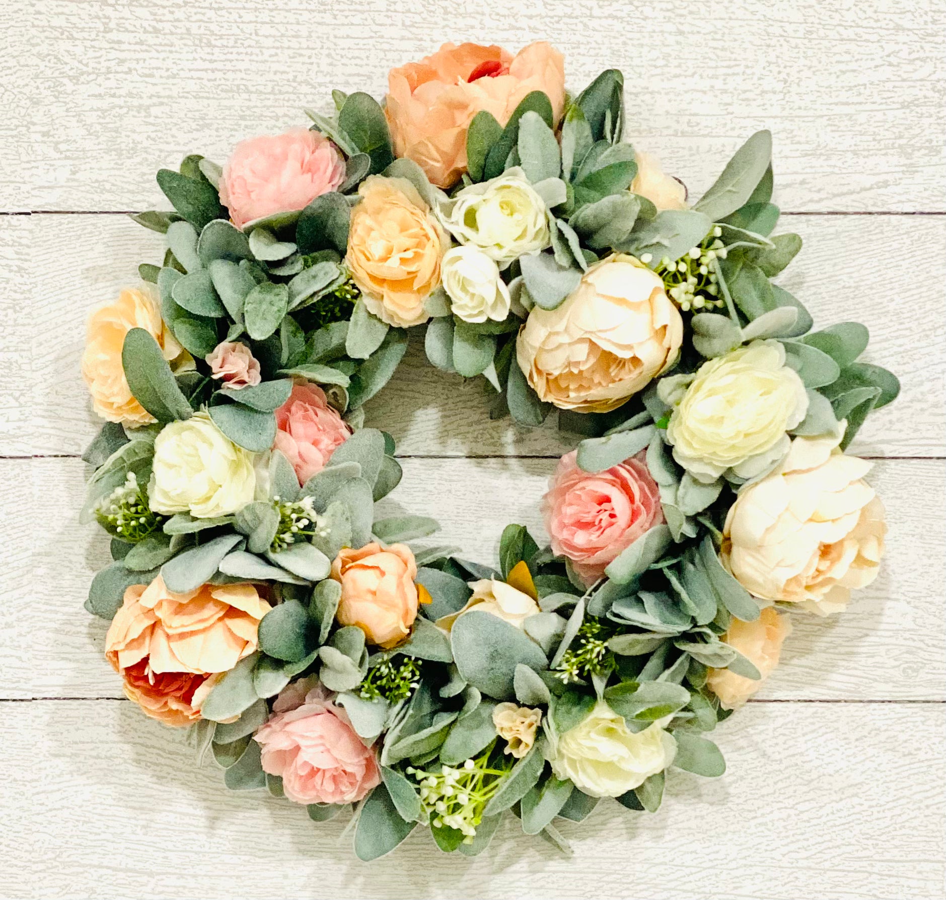 This peony wreath is handcrafted with faux peach and white peonies, artificial pink and white ranunculus, faux baby’s breath, and artificial lambs ear.