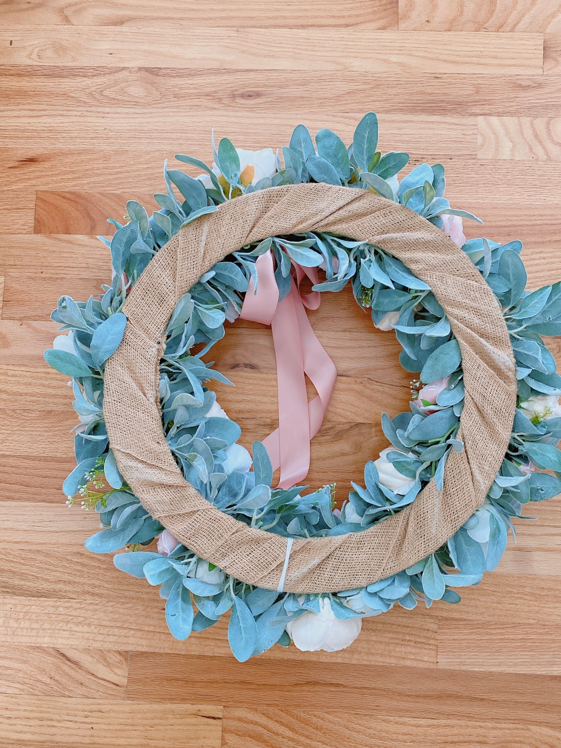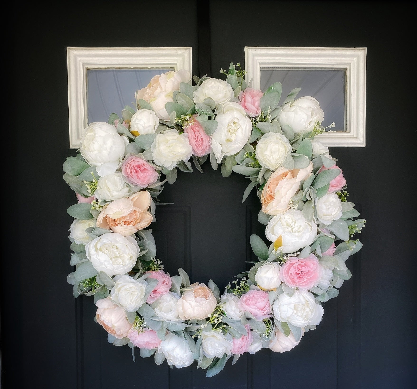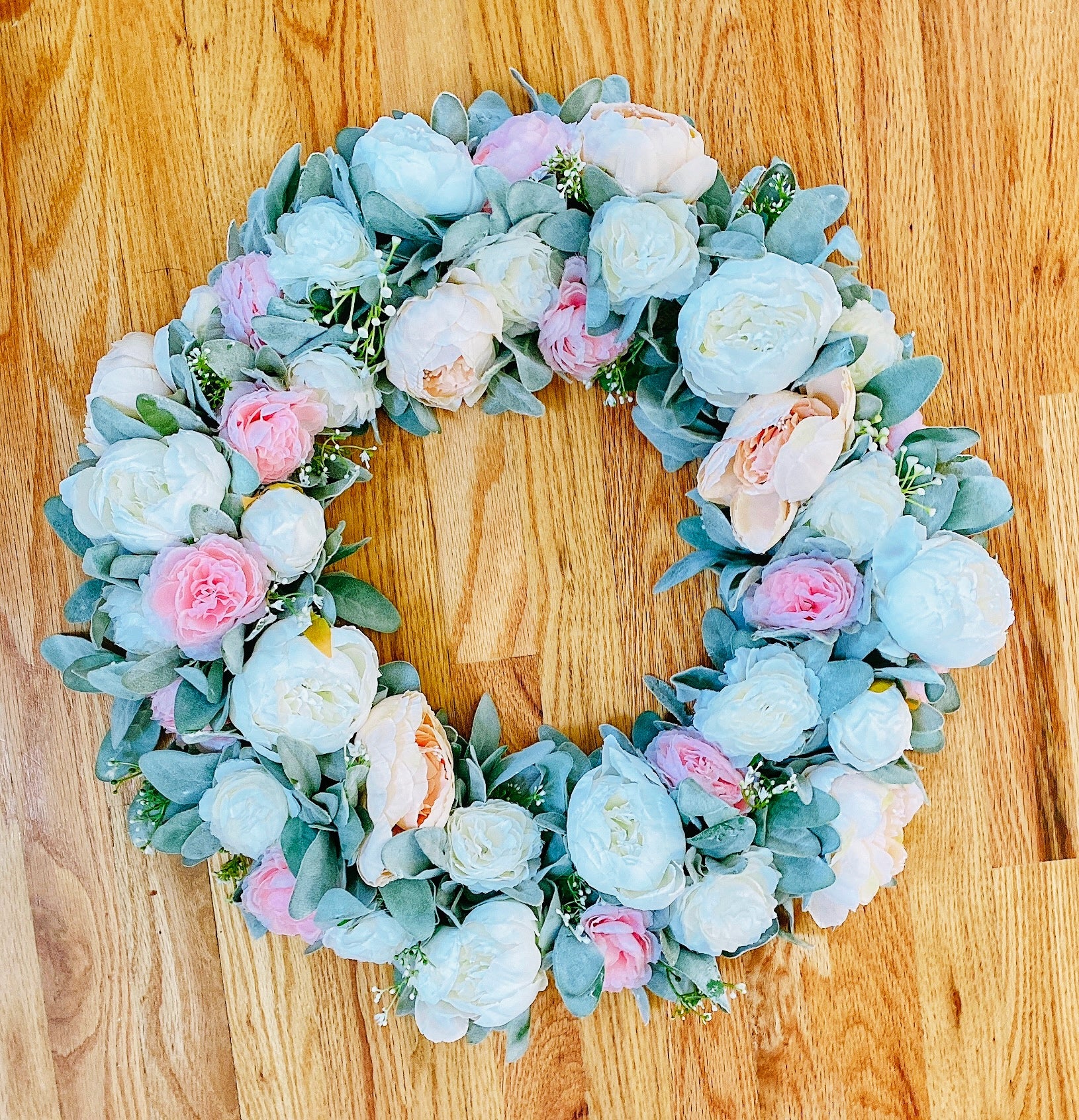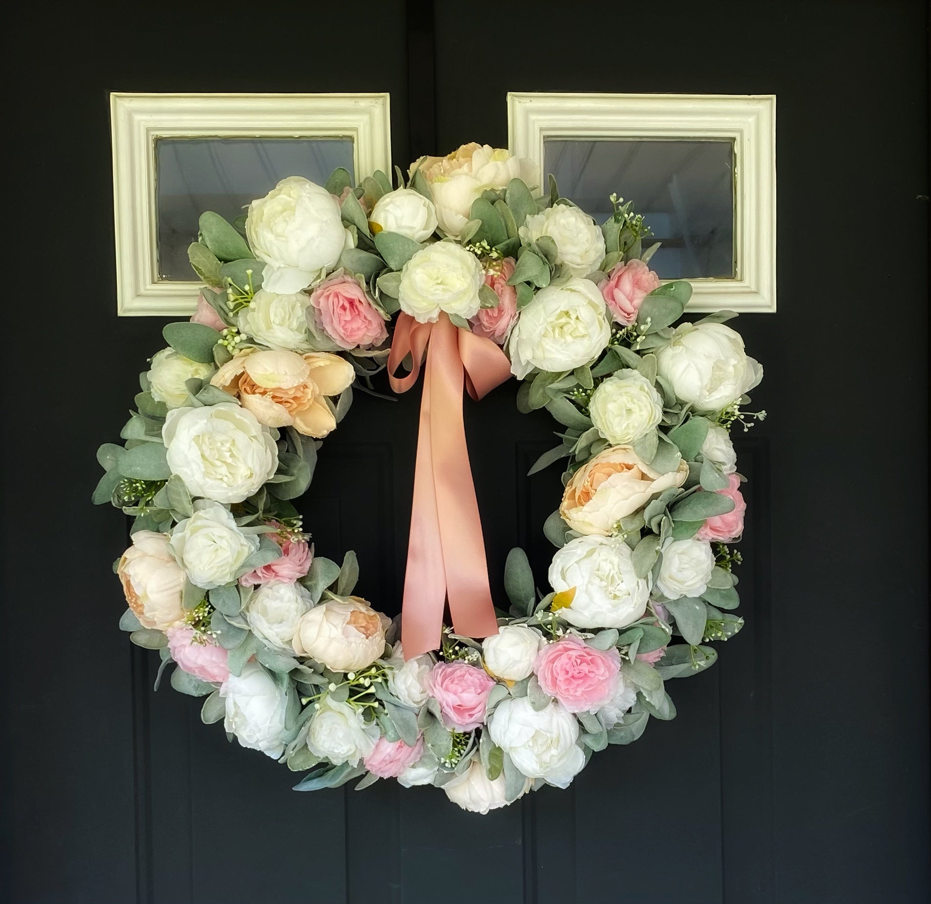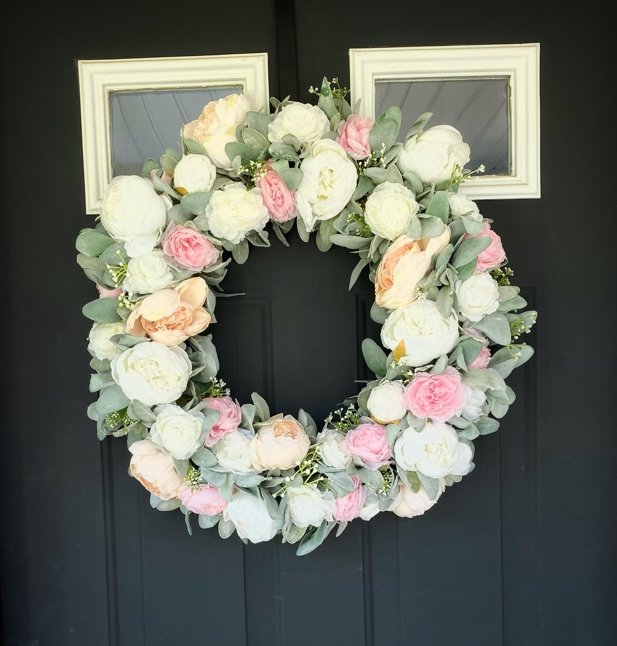 This peony wreath is handcrafted with faux peach and white peonies, artificial pink and white ranunculus, faux baby’s breath, and artificial lambs ear.
