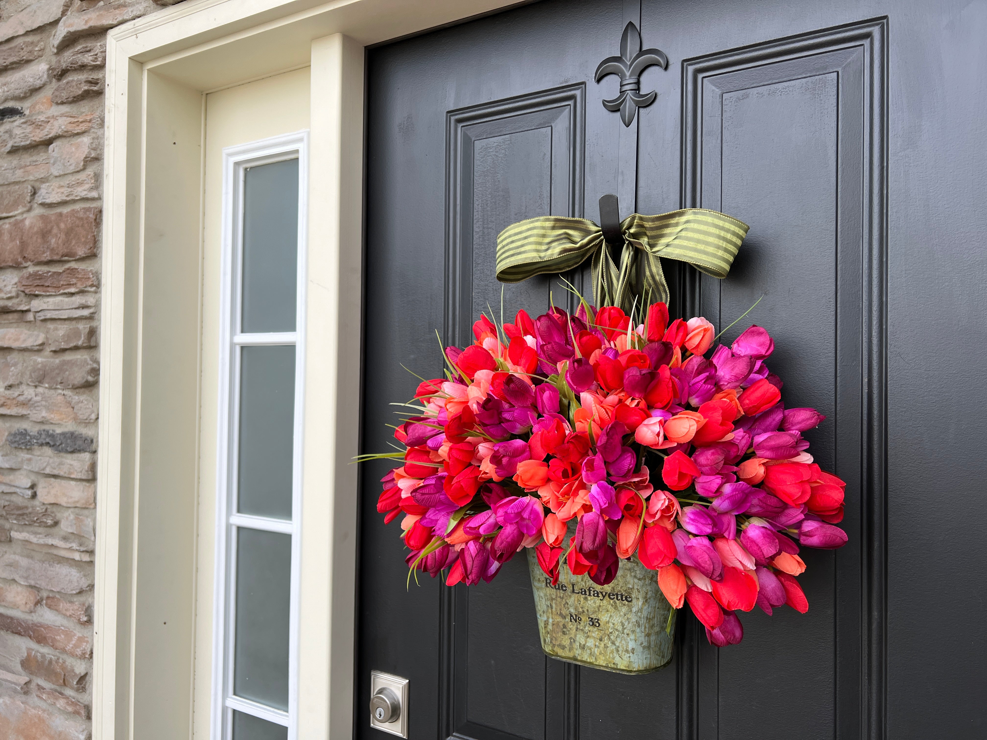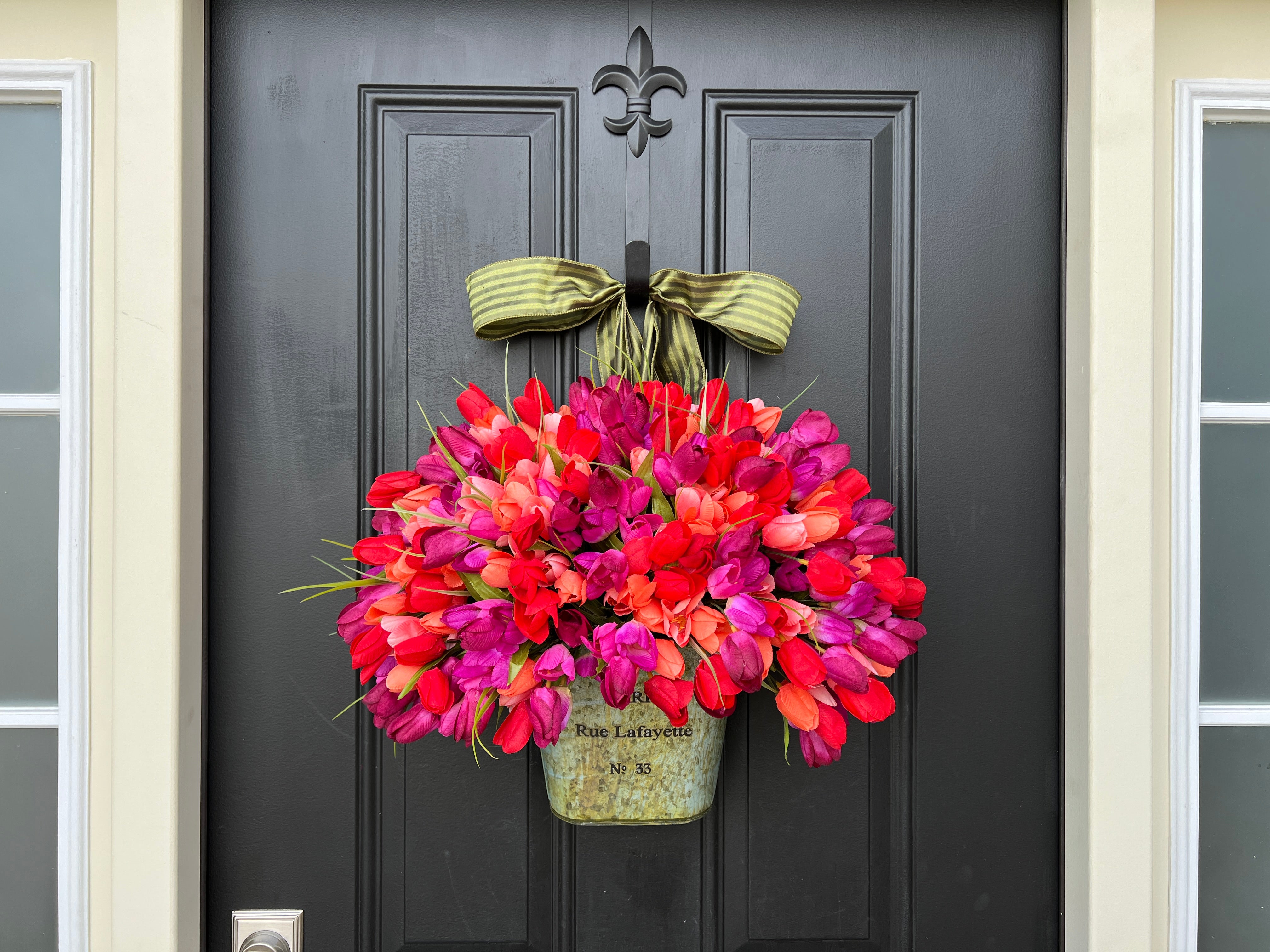 Add a touch of rustic charm to your home with the Country French Tulip Bucket. Featuring vibrant red, orange and magenta tulips in a Country French-style bucket, this front door wreath brings a fresh, welcoming look to your entryway. Perfect for spring, it combines the beauty of colorful flowers with the timeless elegance of French country style.