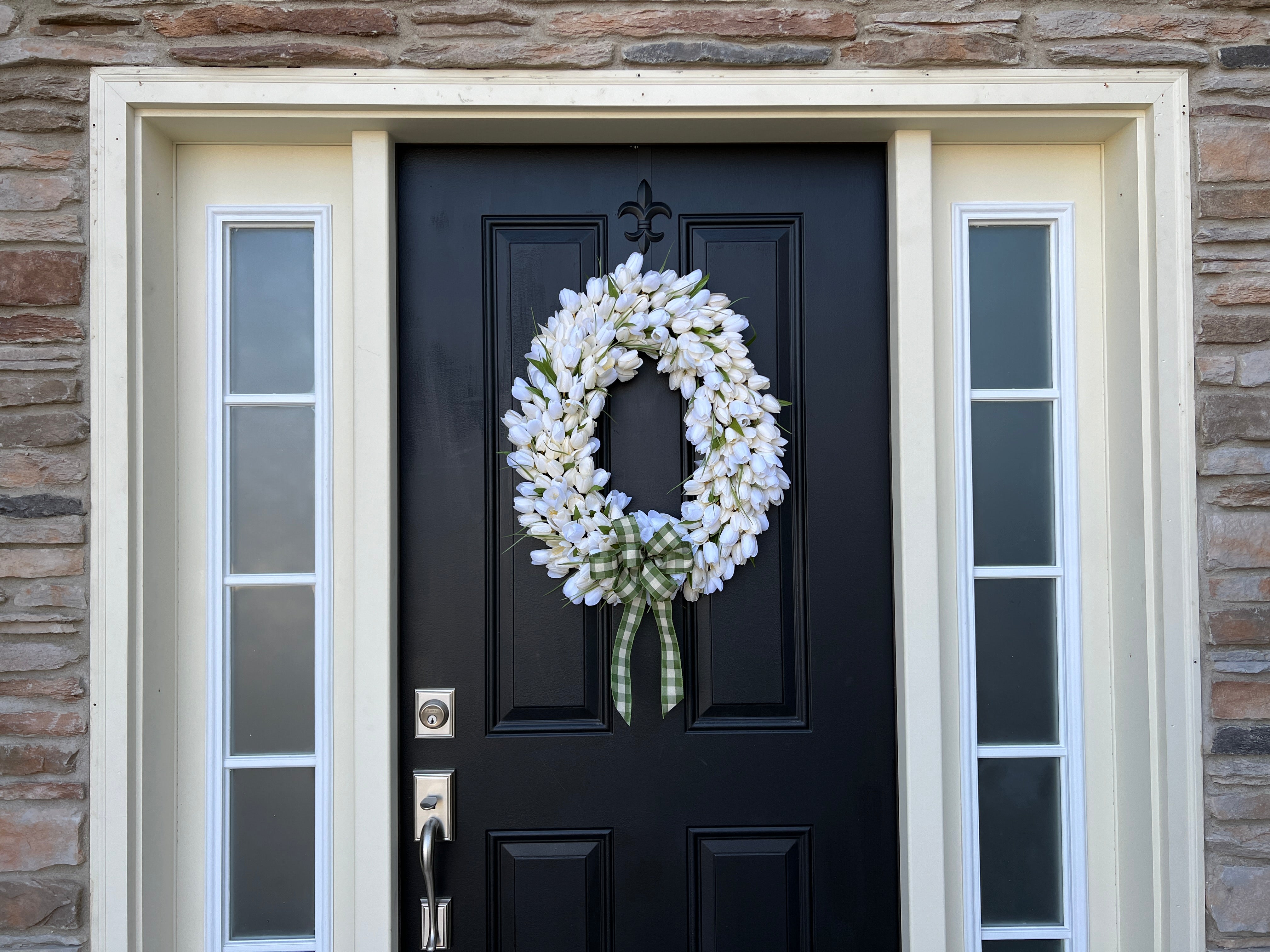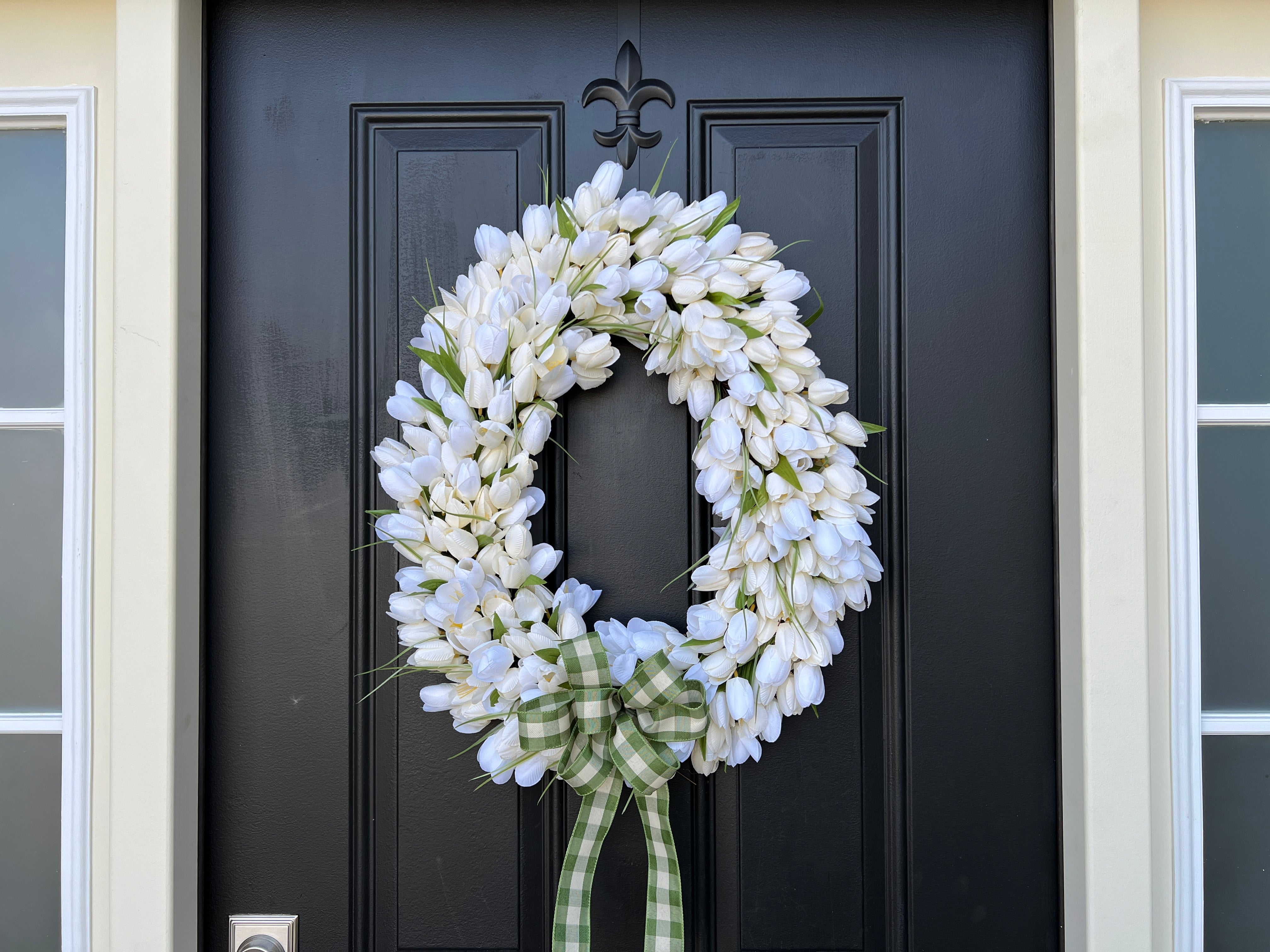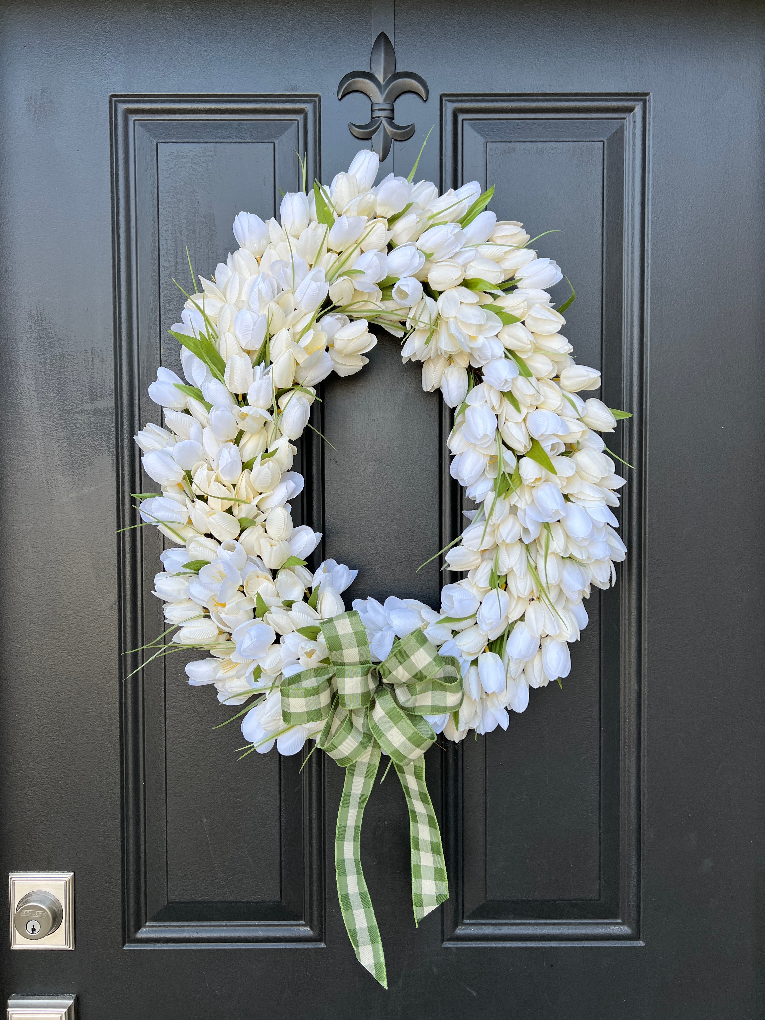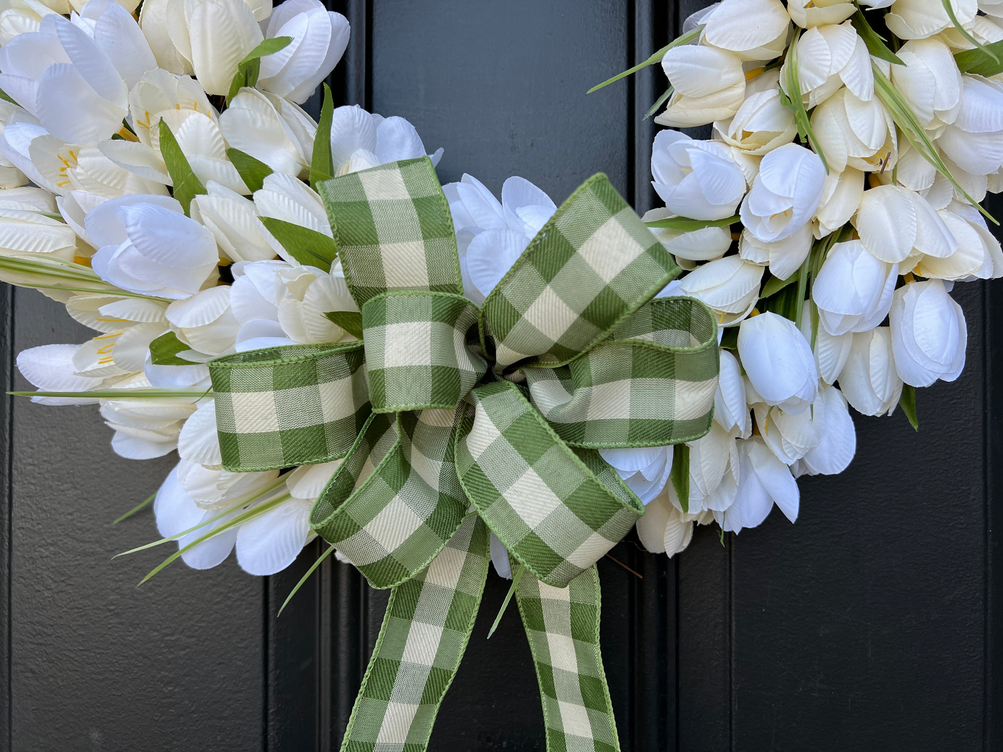 Welcome spring with our stunning 24-inch Easter Egg Front Door Wreath, a perfect blend of elegance and whimsical charm. This handcrafted beauty features vibrant faux white tulips complemented by a stylish plaid green and beige bow, making it the ideal adornment for your front door this Easter season.
