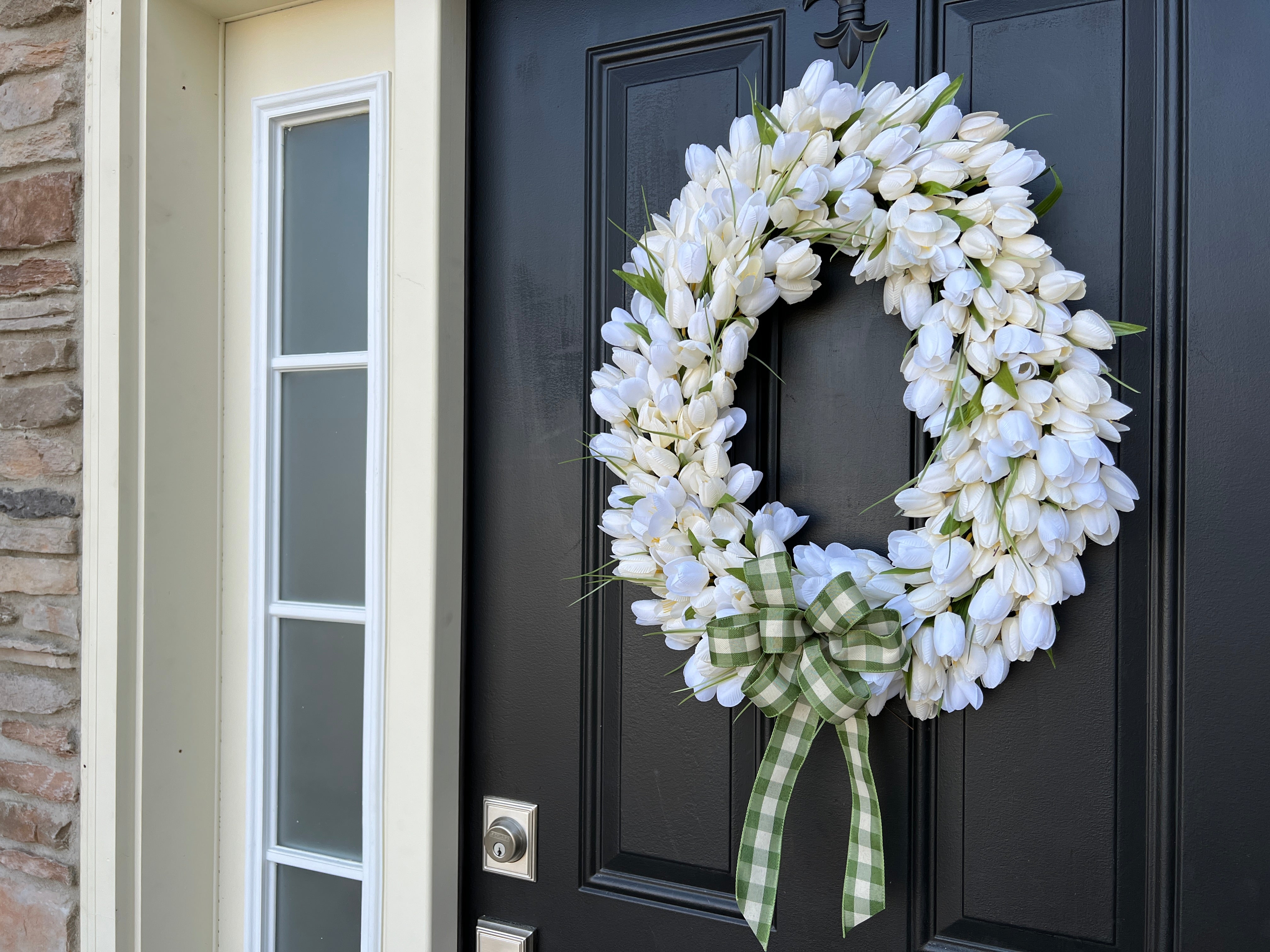 Welcome spring with our stunning 24-inch Easter Egg Front Door Wreath, a perfect blend of elegance and whimsical charm. This handcrafted beauty features vibrant faux white tulips complemented by a stylish plaid green and beige bow, making it the ideal adornment for your front door this Easter season.