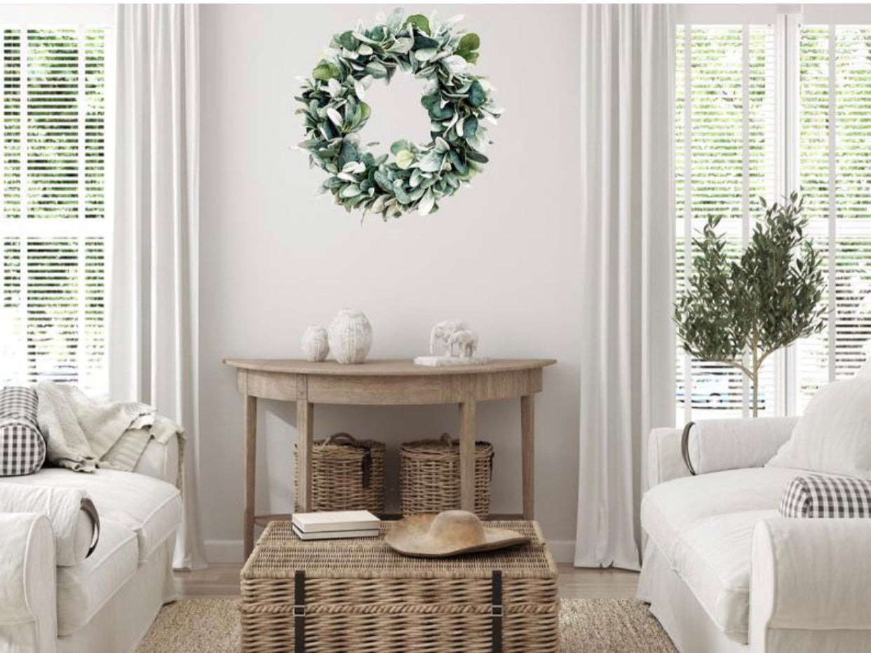The smaller sizes of this wreath function great as window wreaths, cabinet wreaths, or decor to hang on your large mirrors to add a touch of greenery to your modern farmhouse decor.