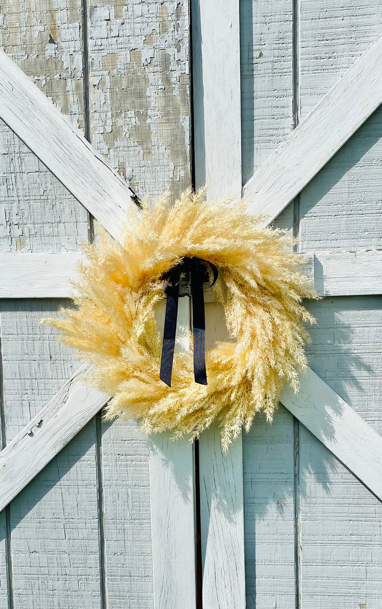 When the colors of summer begin to fade to earthy browns, reds and oranges, fall is just on the horizon. Capture the feeling of the moment that the weather begins to shift with this Fall Boho Pampas Wreath. This wreath is particularly well suited for modern farmhouses and other bohemian or rustic style homes with its swirl of pampas grass that twists around the circle of the wreath. At the top is thin black ribbon tied into a bow with ends that dangle to the bottom of the wreath. It measures approximately 22 inches in diameter and has a protective fabric back, this Neutral wreath will be the perfect addition to your cozy home.