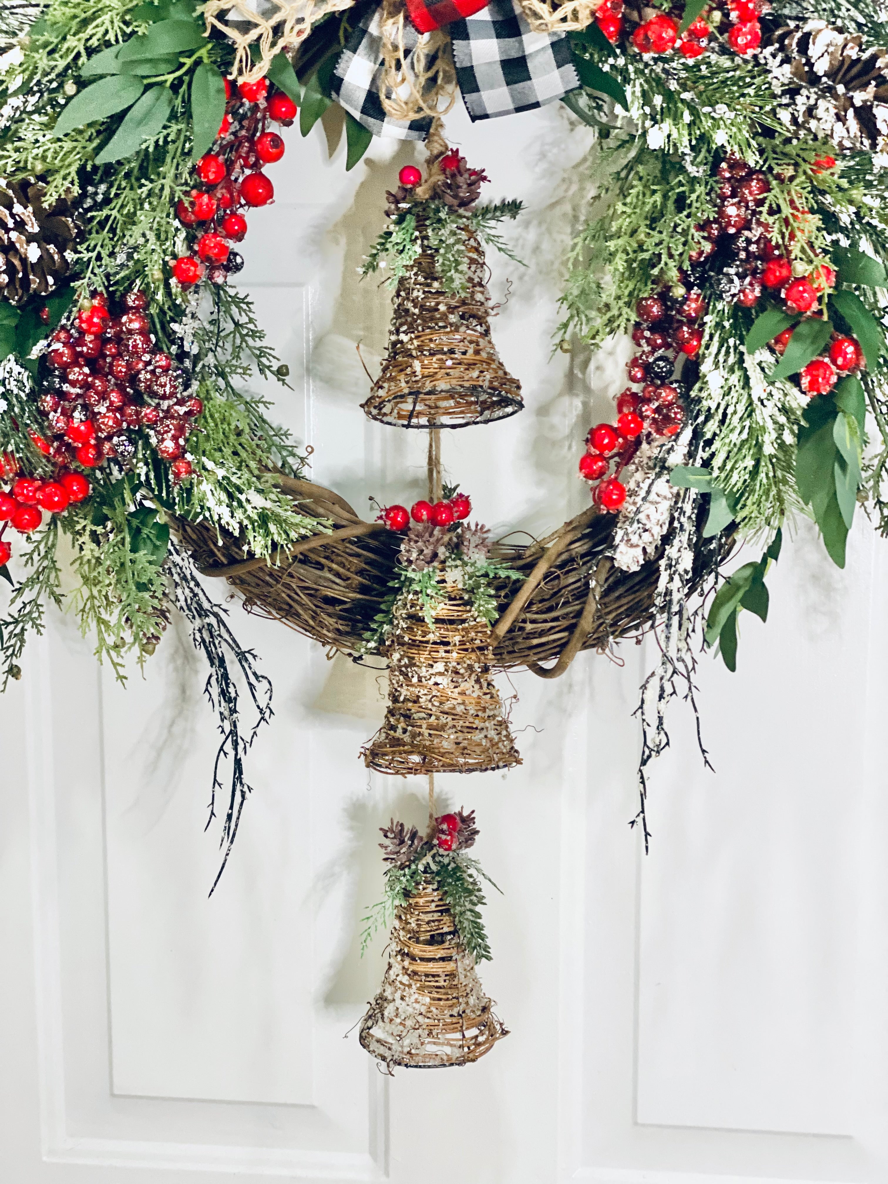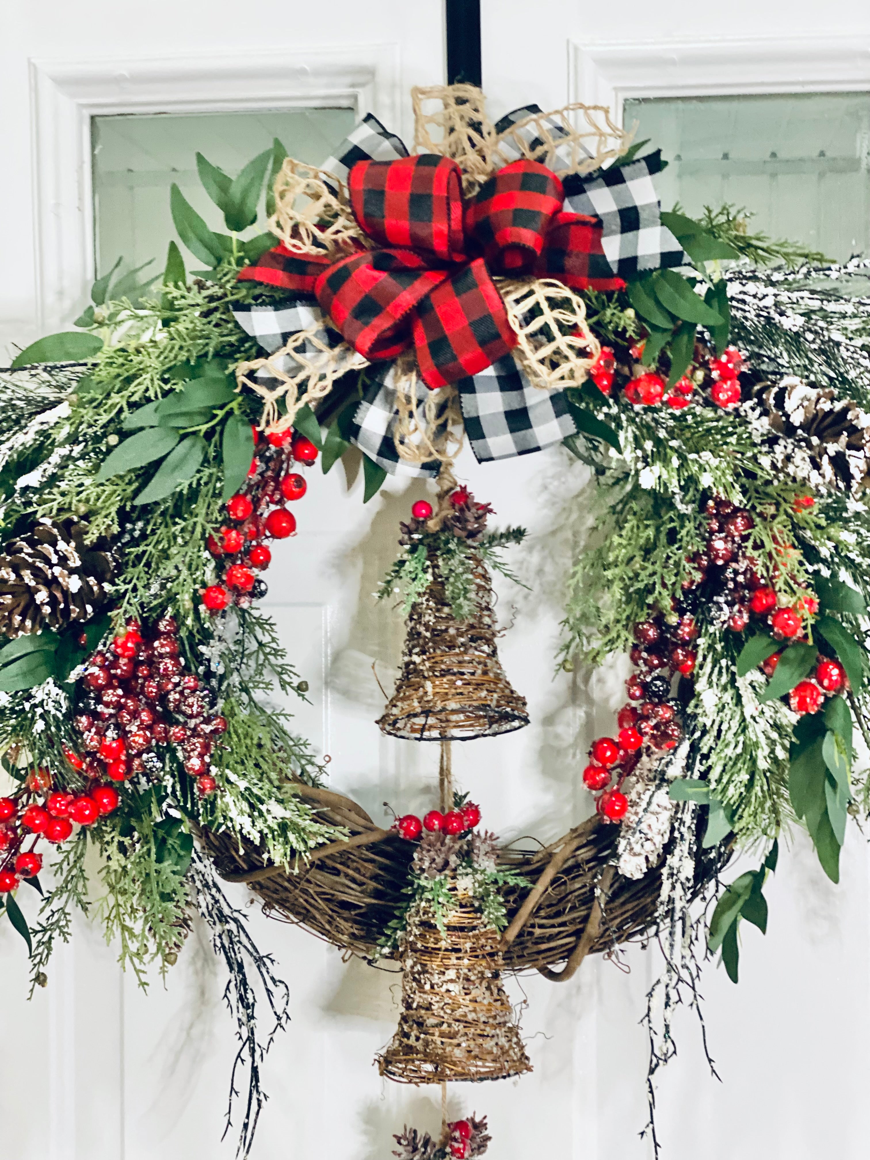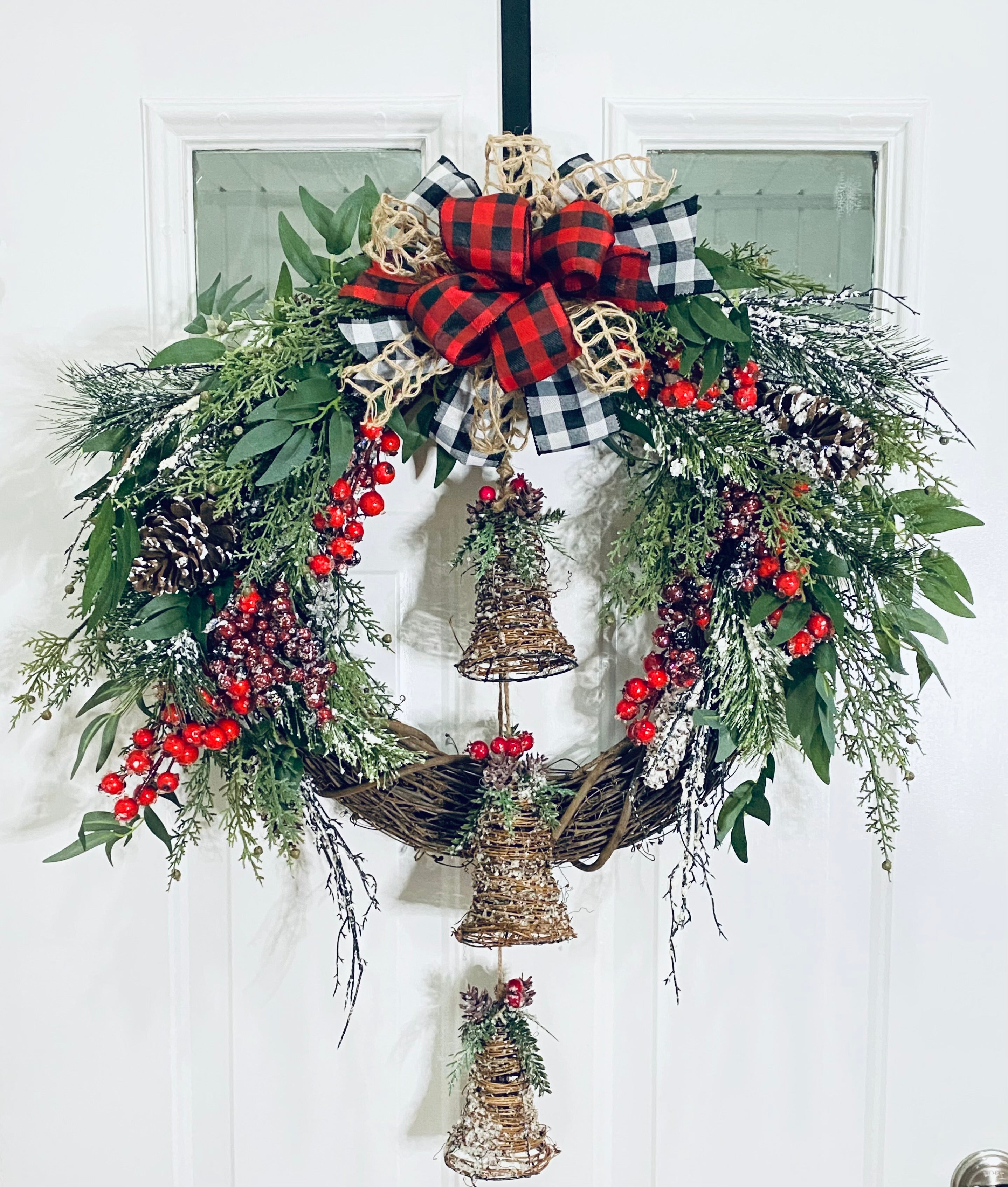 The wreath is handcrafted on a grapevine using artificial cedar, flocked red and burgundy berries, flocked artificial pine and pinecones, a tri-colored Buffalo plaid bow, and finished with the final Accent piece of three large rustic wooden bells.