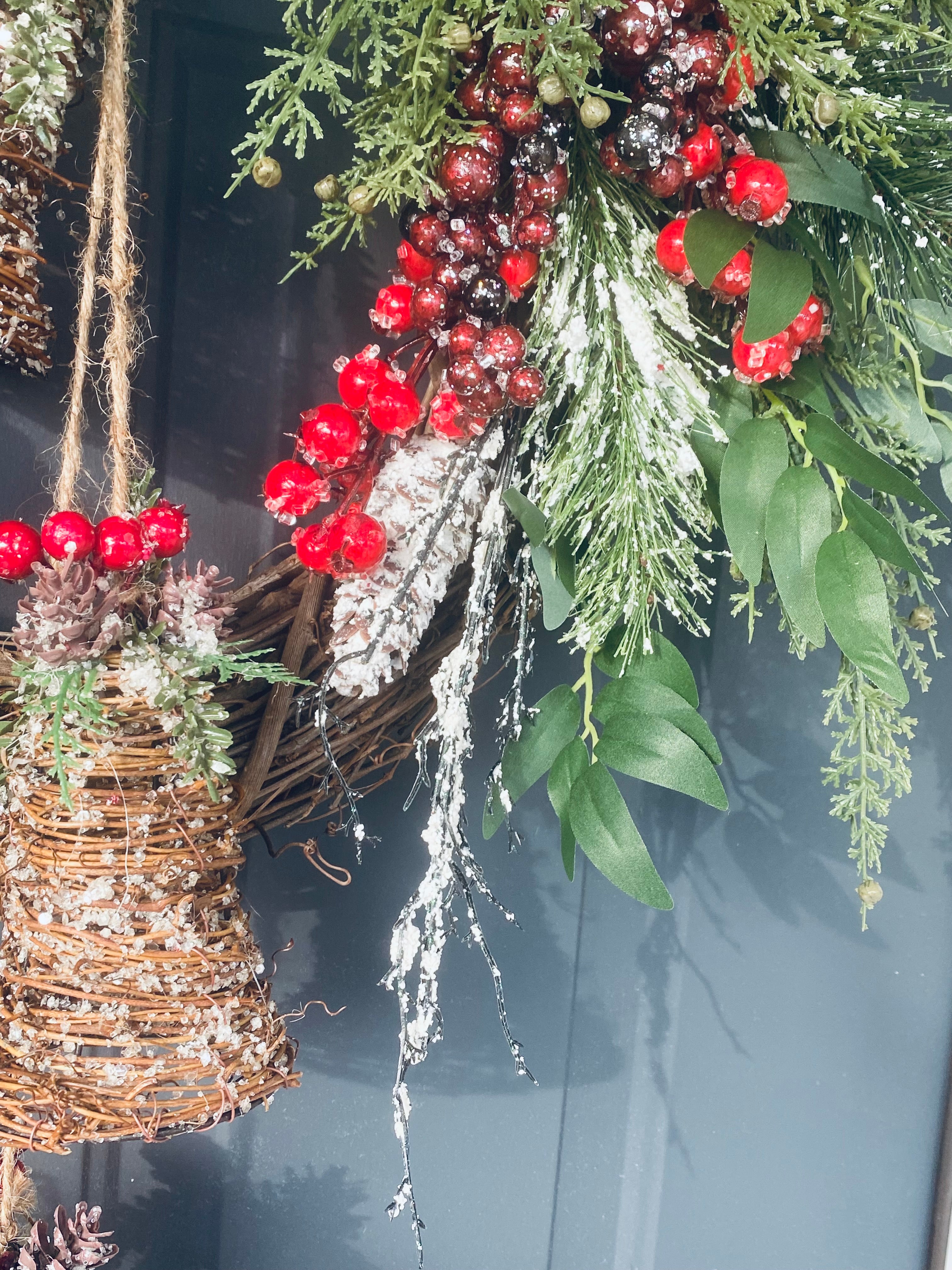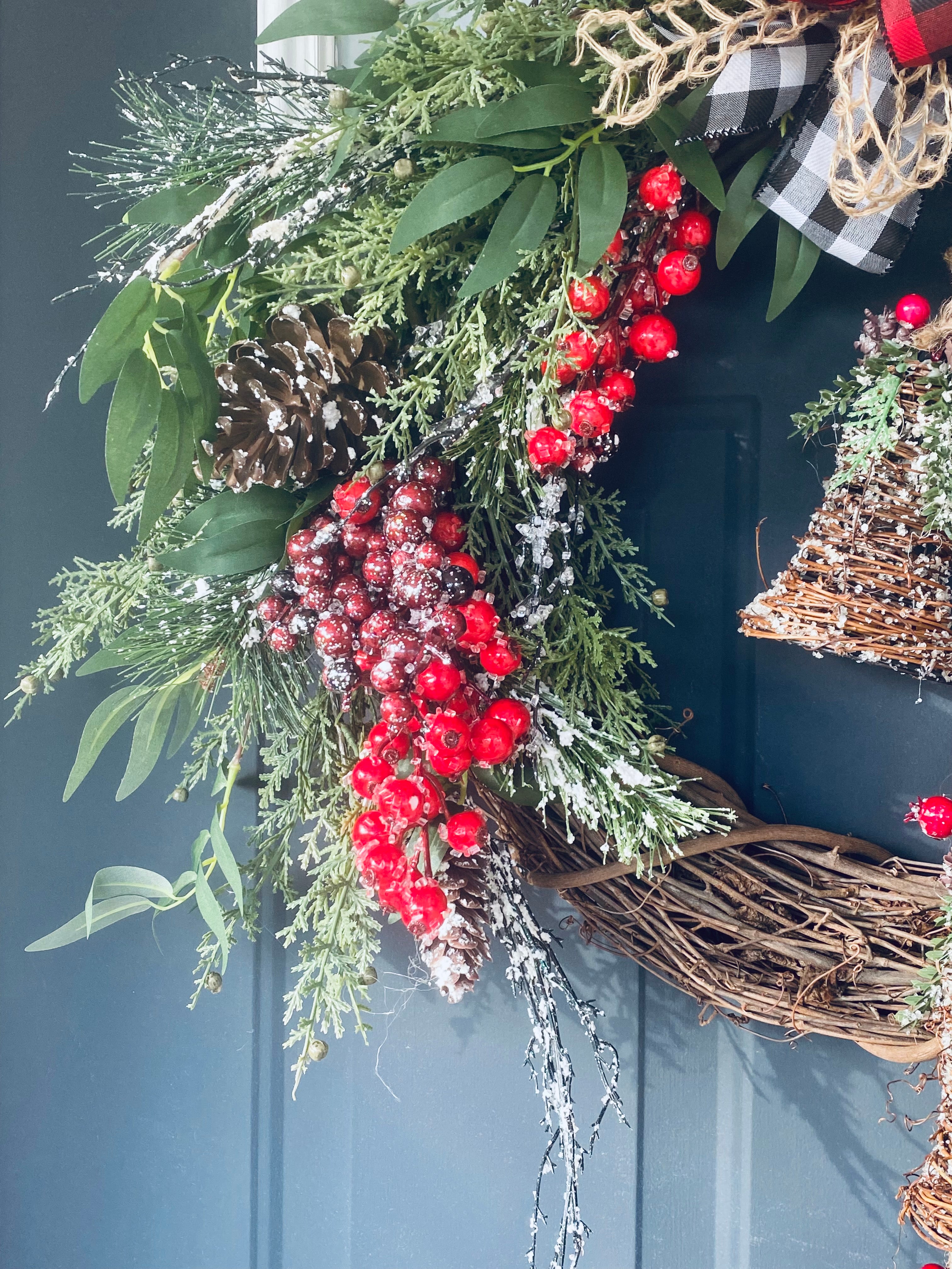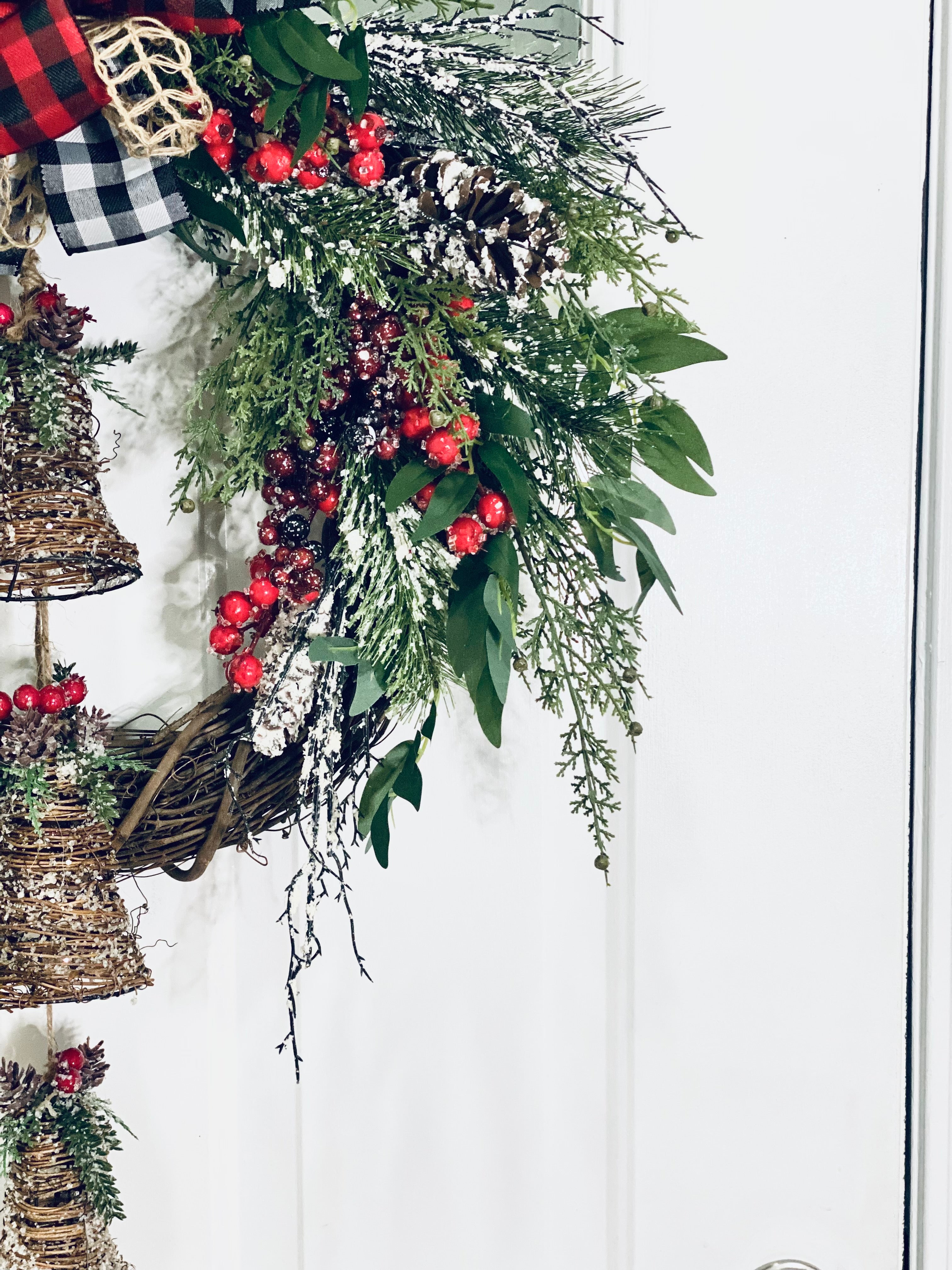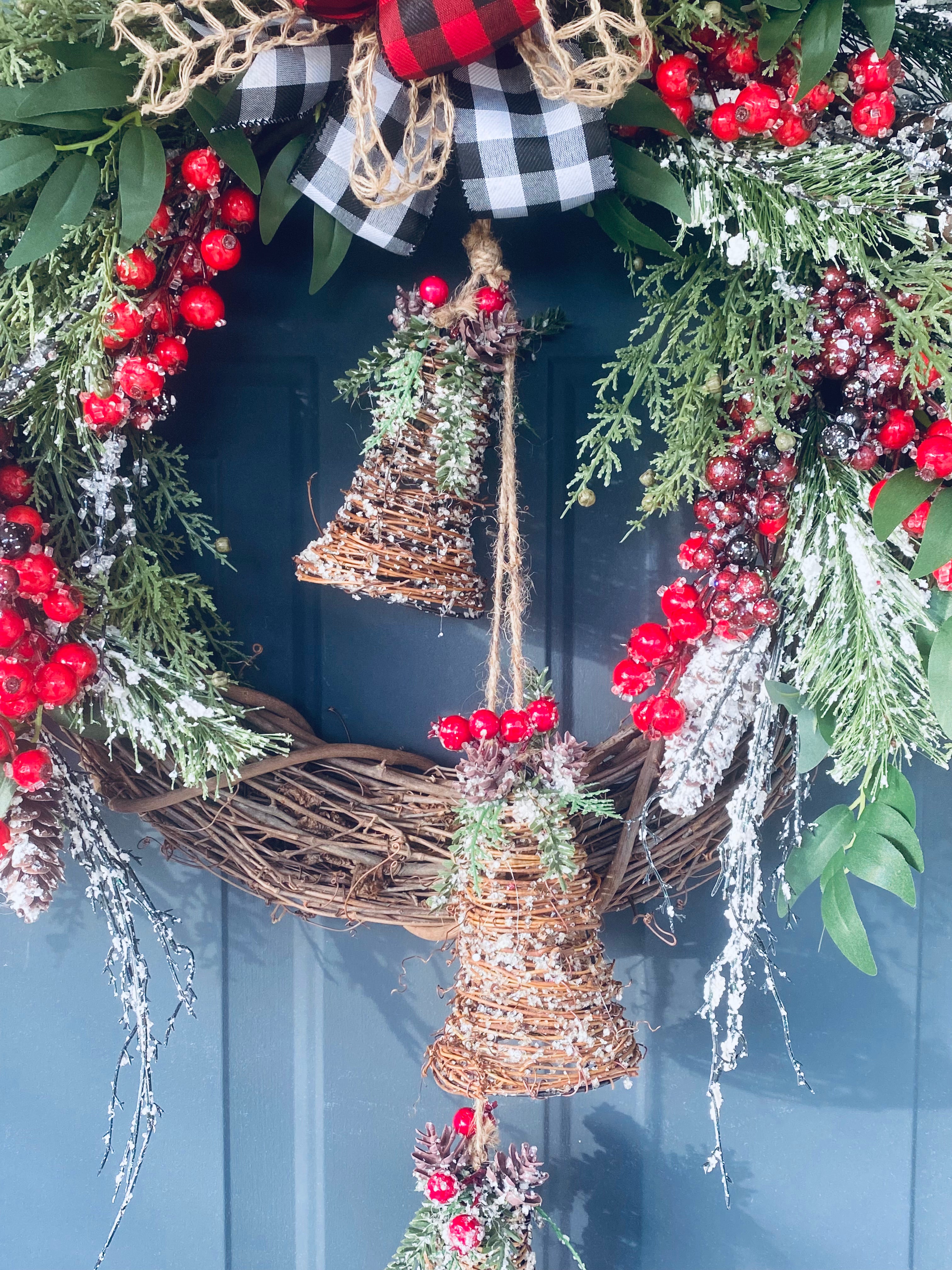 The wreath is handcrafted on a grapevine using artificial cedar, flocked red and burgundy berries, flocked artificial pine and pinecones, a tri-colored Buffalo plaid bow, and finished with the final Accent piece of three large rustic wooden bells.