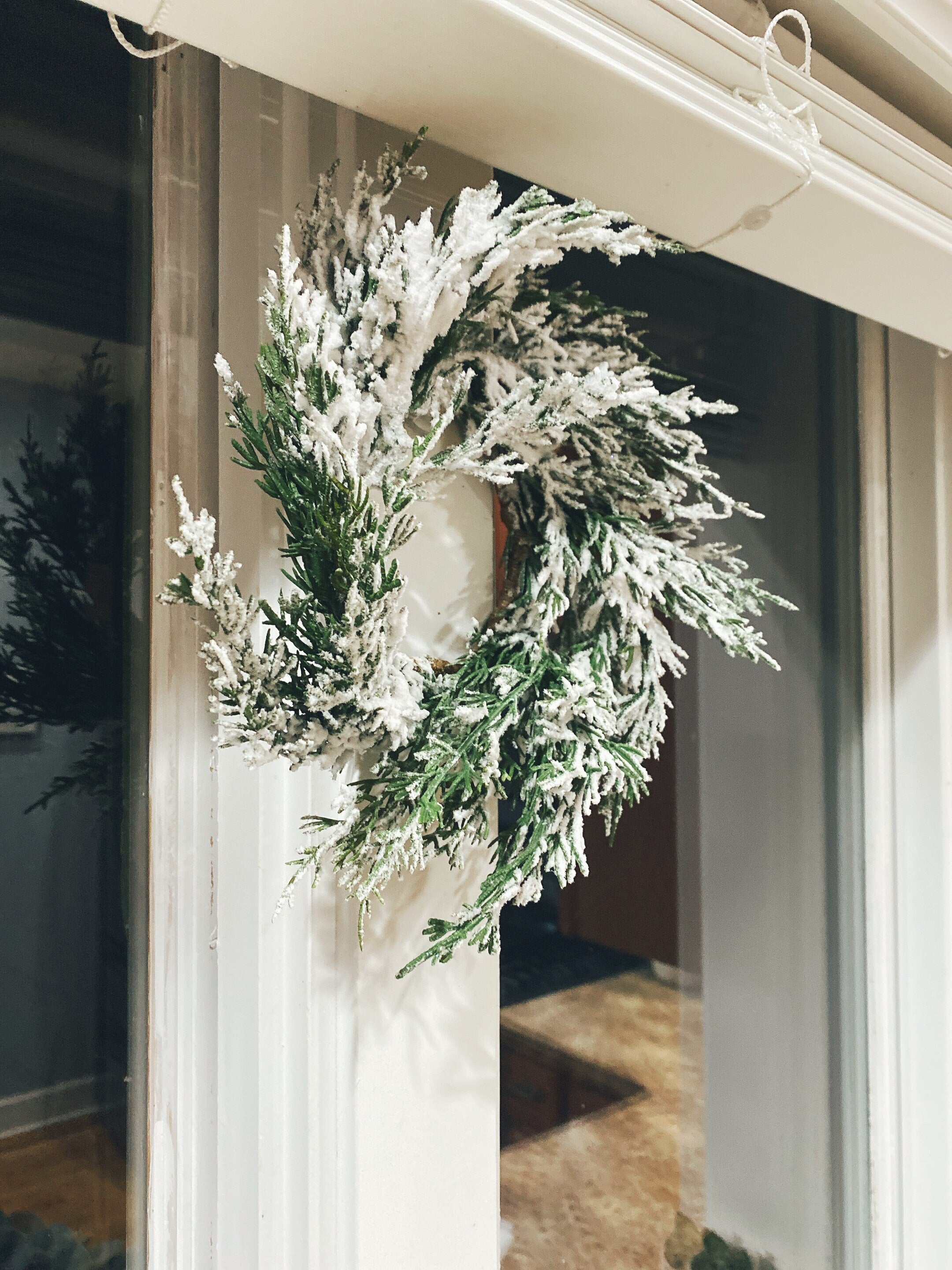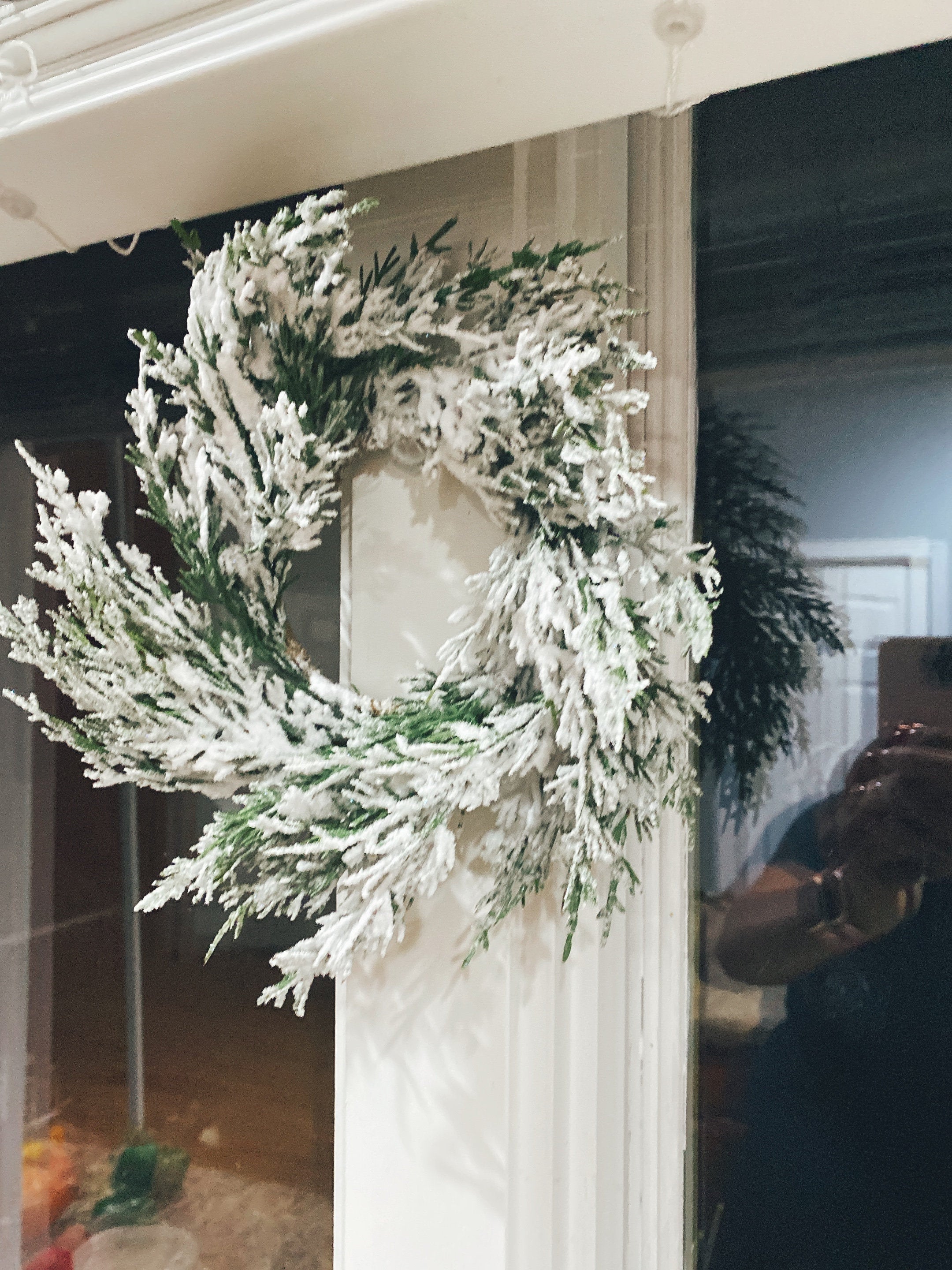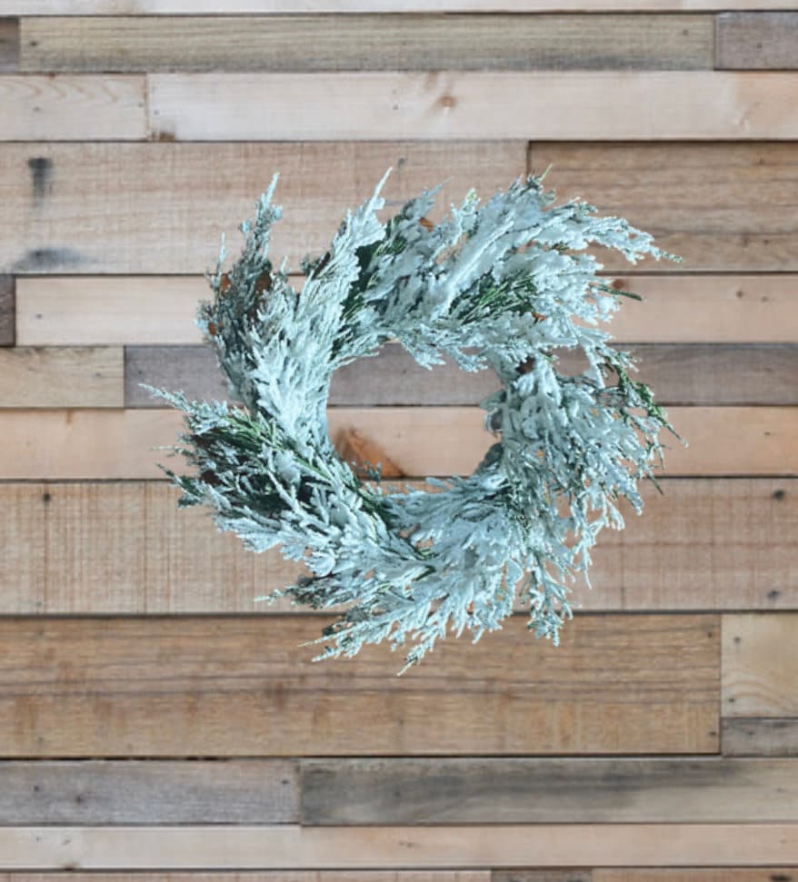 These Flocked Mini Winter Cabinet Wreaths are made with faux cedar greenery and faux snow to create a flocked look.